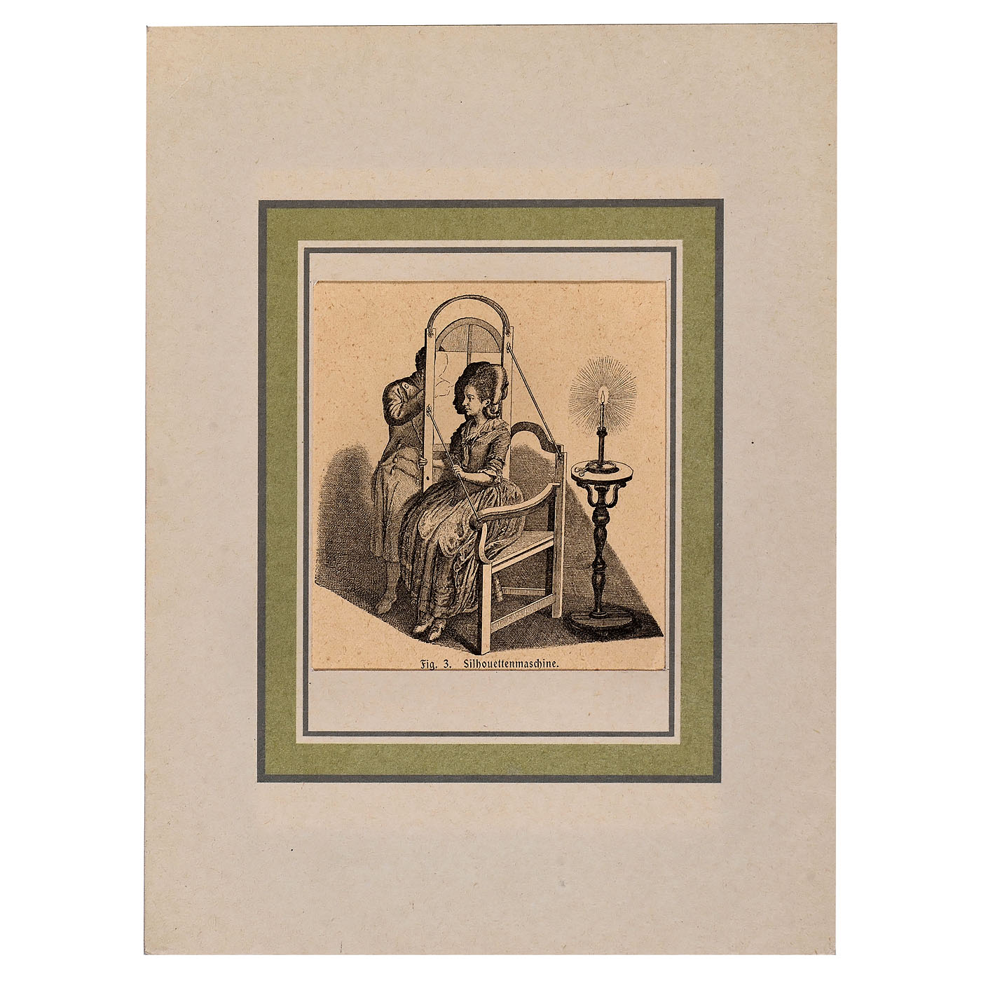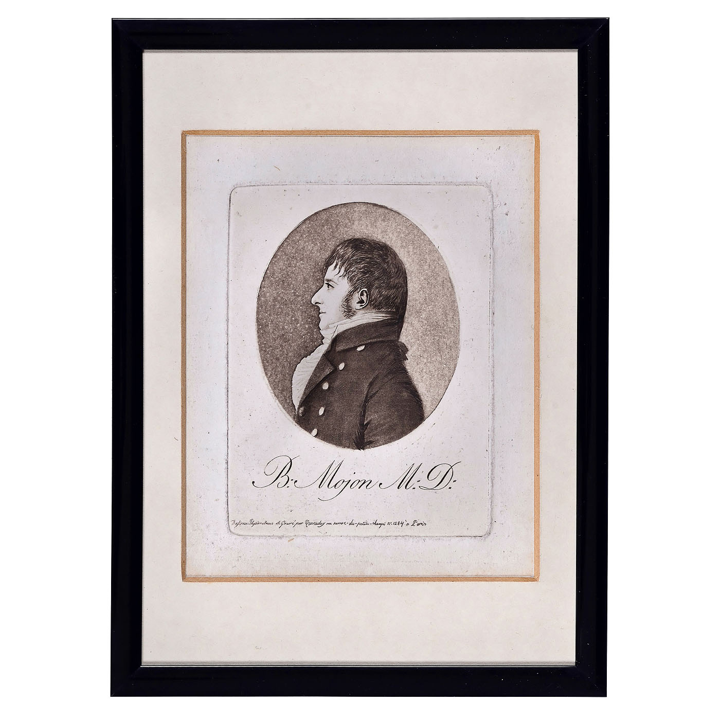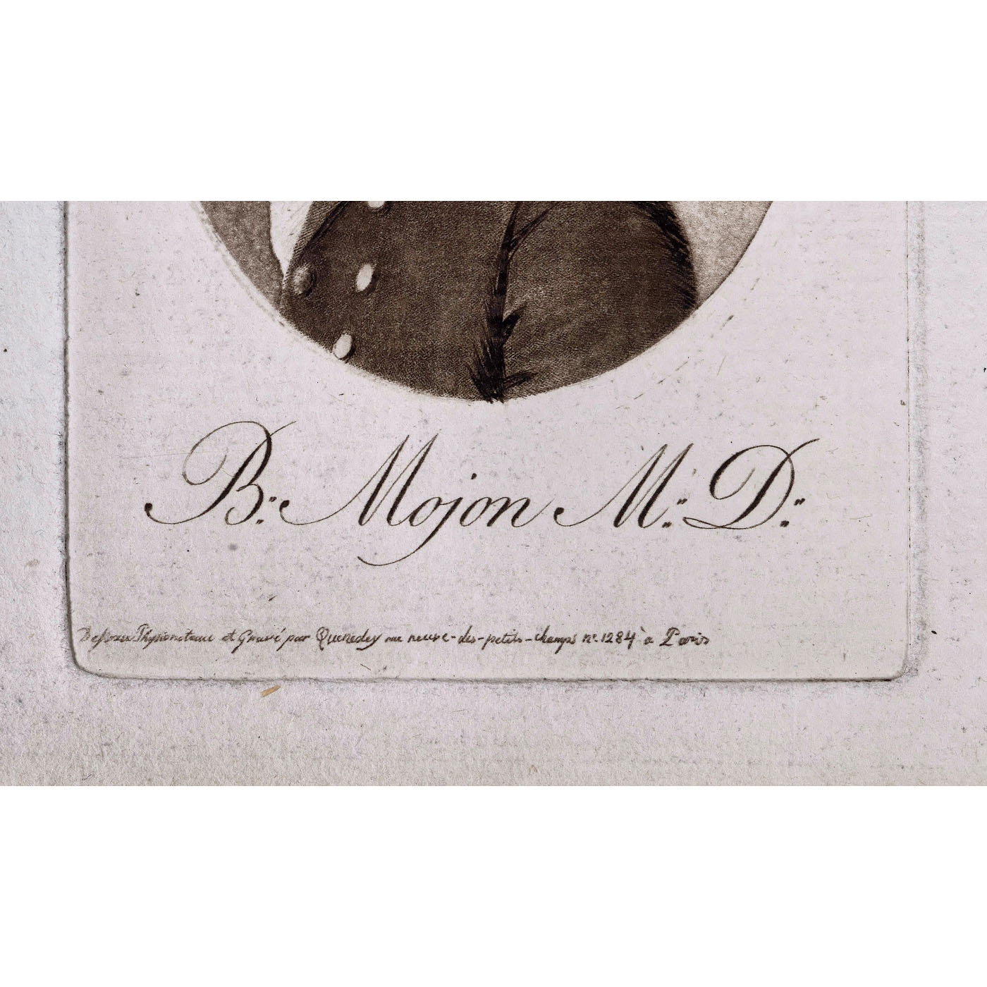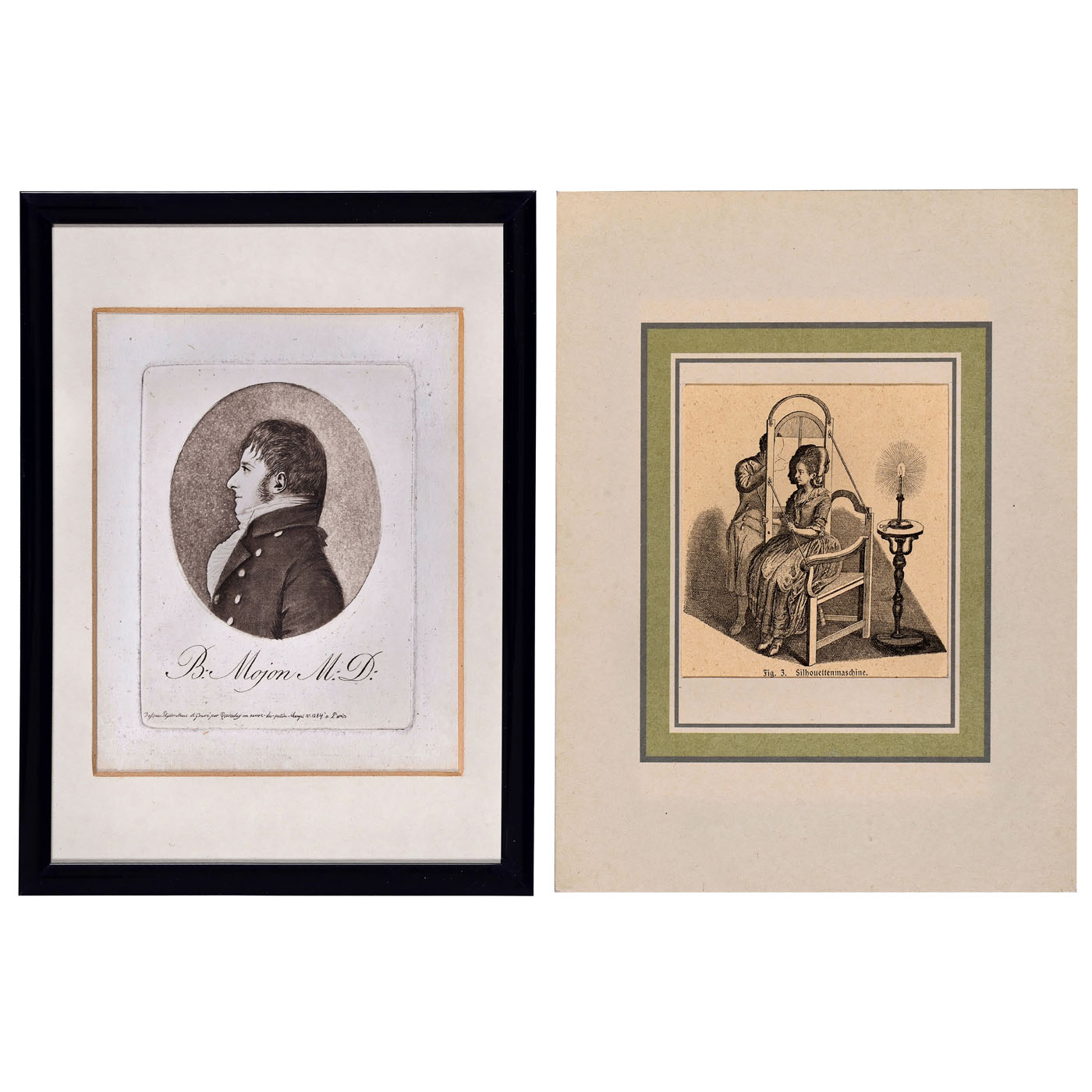 Object illustrating the prehistory of photography. Profile portrait of "B. Majon M.D." cardboard format 7.5 x 10 cm. Engraved below the portrait: "Defs au Physionotrace et Grave par Quenedey, rue neuve des petits, Champ no 1284