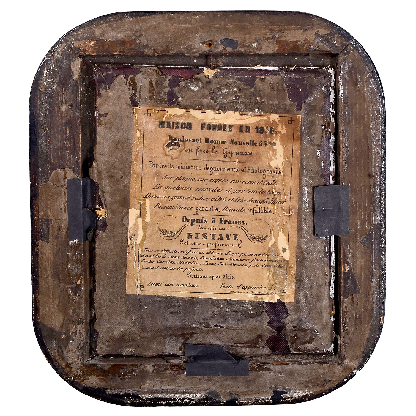 Photograph and painter Gustave, 35 Boulevard de la Bonne Nouvelle, probably Paris. In a plaster frame, 25 x 22 cm. The daguerreotype depicts a group of children, image size 9 x 11.5 cm (not a standard size), a beautiful, warm-toned image due to gold toning. The protective glass has some minor age-related staining (should be replaced). A charming image of children who remain remarkably still ÿ presumably because, as stated on the back, pictures could be taken "in just a few seconds and in any weather. In a large, well-heated room with windows ÿ in winter." So, there was a well-heated room available even in winter!
