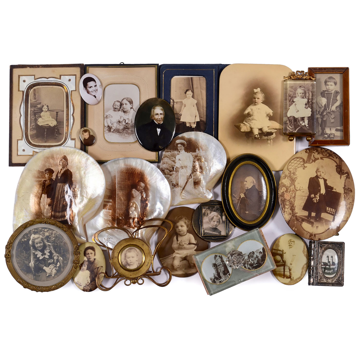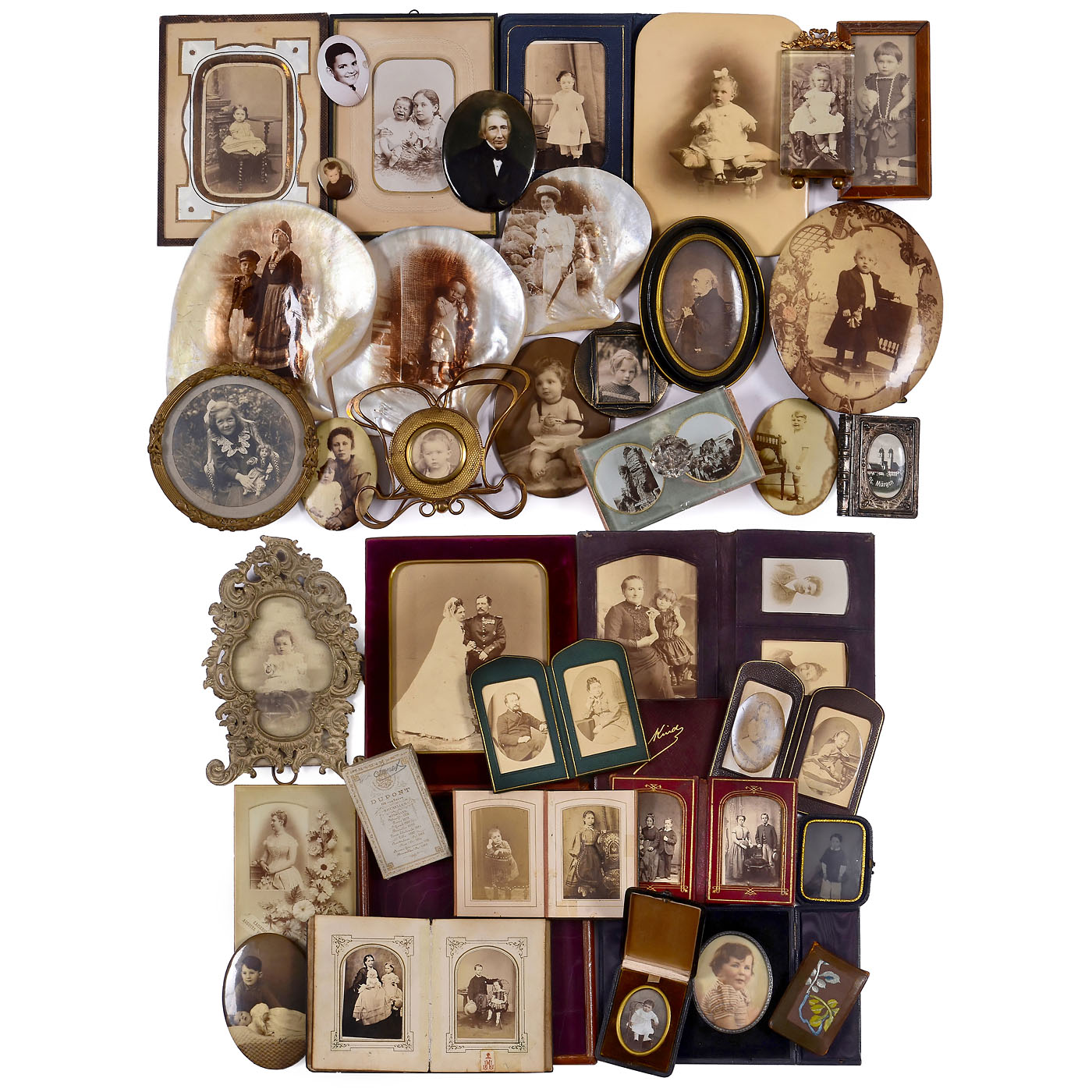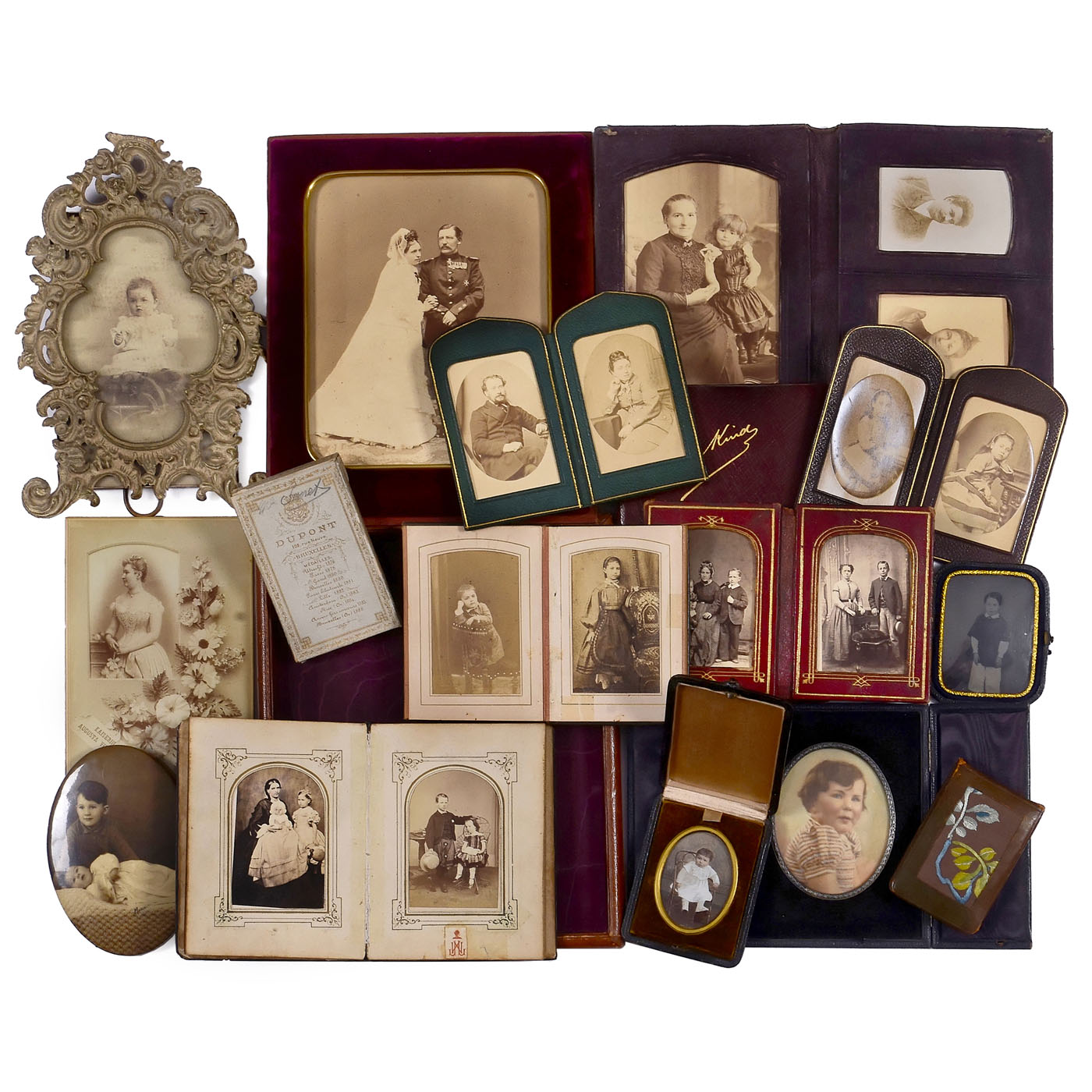Large collection of portrait presentation formats, whether for studio advertising or for home use. The collection comprises over 30 items, some of which are extremely rare, ranging from an exceptionally rare carte-de-visite box by Dupont of Brussels (1889) to leather carte-de-visite albums, miniature and mother-of-pearl albums, and luxury and easel-type picture frames in various styles. All items are in good condition, offering a glimpse into a time when photography was embraced as a new art form.