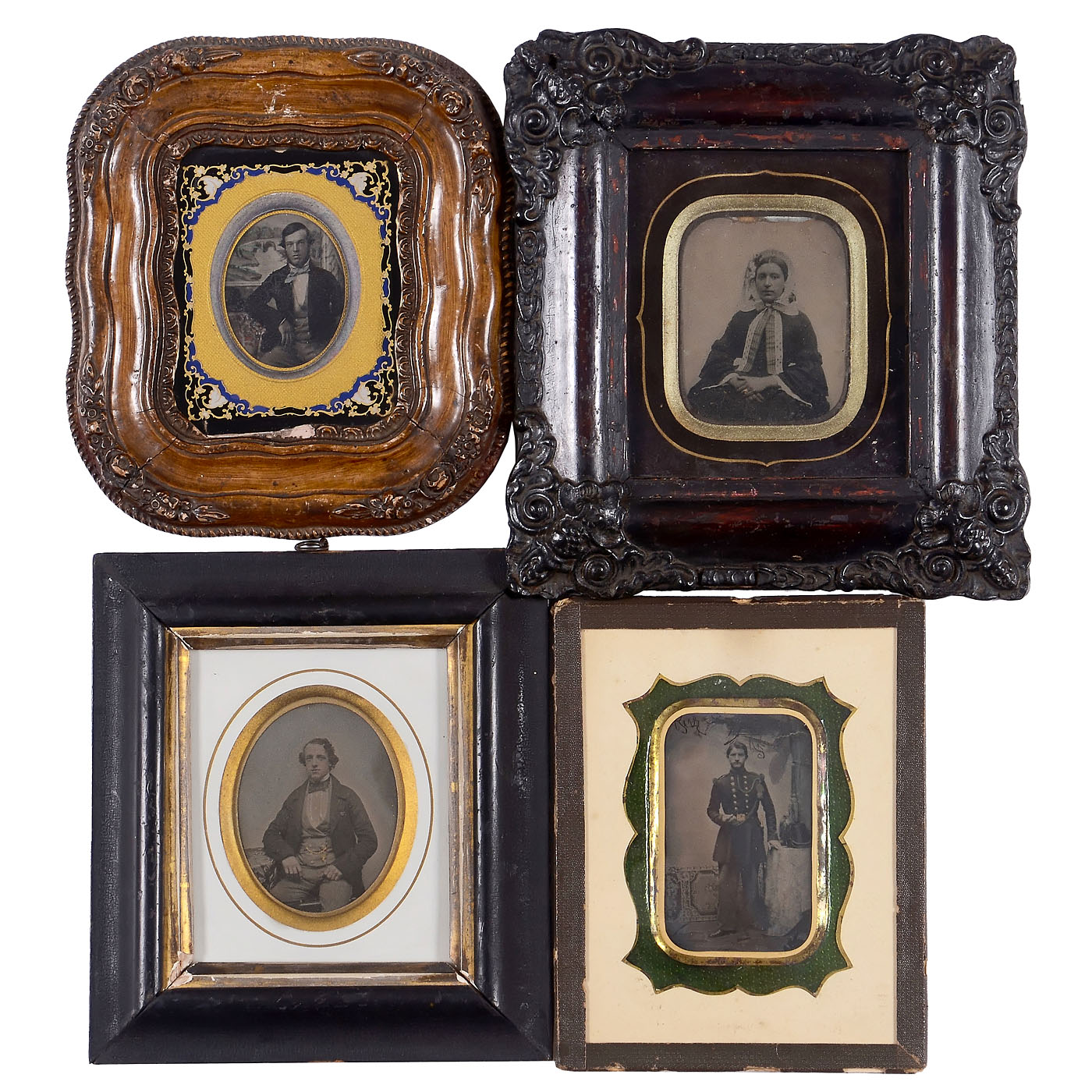 Image tones in good condition. 1) Ambrotypes in various presentation forms: a dignified senior with his hand on a book in a brass frame 8.5 x 11 cm; a young man with a hat in a case 9 x 8 cm; a young man with a binder, colored with gold decoration, in a case 12 x 9 cm; a young melancholic woman and the picture of her relative in a union case 6.5 x 7.6 cm; a young man with a cheeky cigar in his mouth in a case 6 x 7 cm; a French lady with a bonnet in a frame 19 x 21 cm; an officer in a hanging glass frame 13 x 17 cm; a father and daughter in a stucco frame 12 x 10.5 cm (the back of the negative is painted black only where the people are, not the background, which, together with the gray background at the head, creates a slightly three-dimensional effect); young man in front of a river landscape in a stucco frame 16 x 18 cm, c. 1860; a girl with a book in a case 7.5 x 6.5 cm; a young man with checked trousers in a frame 16 x 18 cm. ÿ And: 2) Ferrotypes: a red miniature leather album, 5.5 x 8 cm, with 12 pages containing 48 ferrotypes 16 x 21 mm (postage stamp portraits); an oval union case 7.5 x 6 cm with a picture of a young woman; a frame 9.5 x 13 cm with two small frames 3.8 x 4.2 cm of a young couple (one glass cracked, inscribed on the reverse: Frederic Martin & Ann Parrott 1863); a married couple 10.6 x 8.1 cm; an elderly gentleman in a case 12 x 9 cm; a father with two daughters in a brass frame 14 x 11 cm ÿ a particularly beautiful picture.