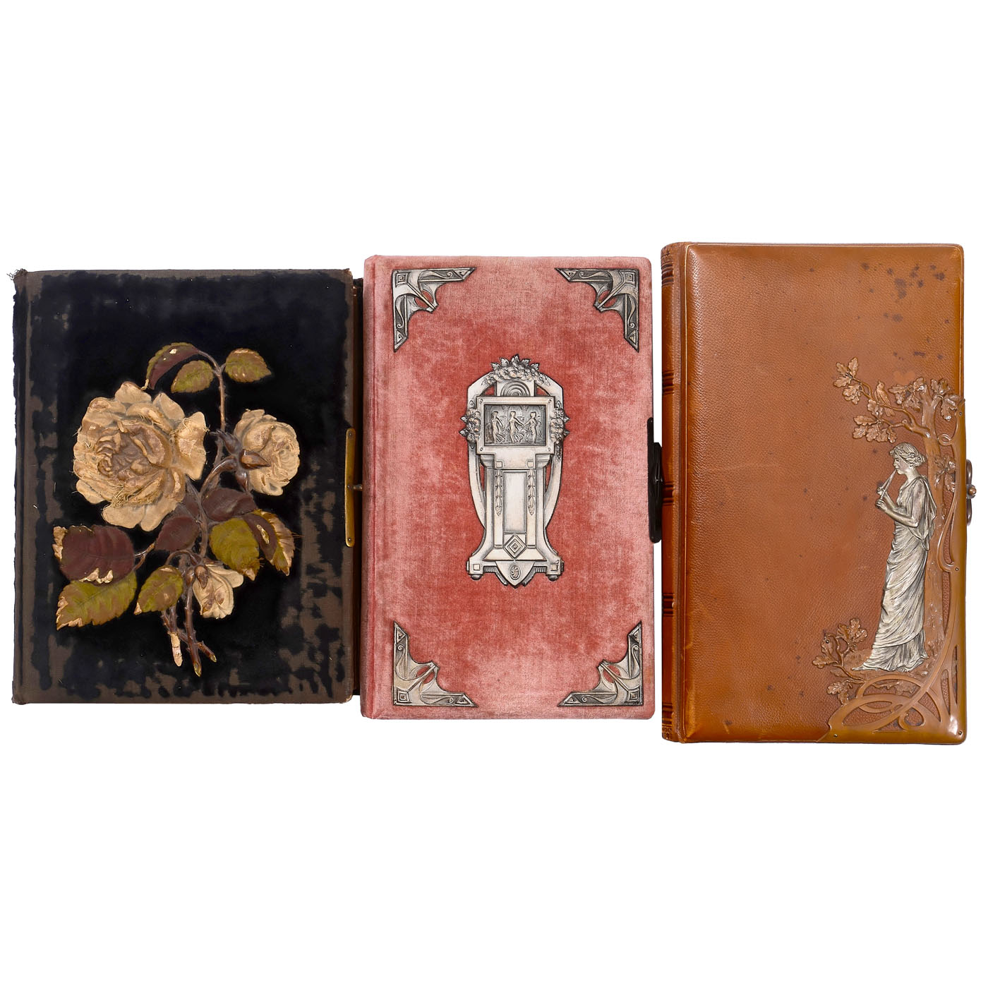 1) A beautiful leather album, 21 x 34 cm, with an Art-Nouveau appliqu