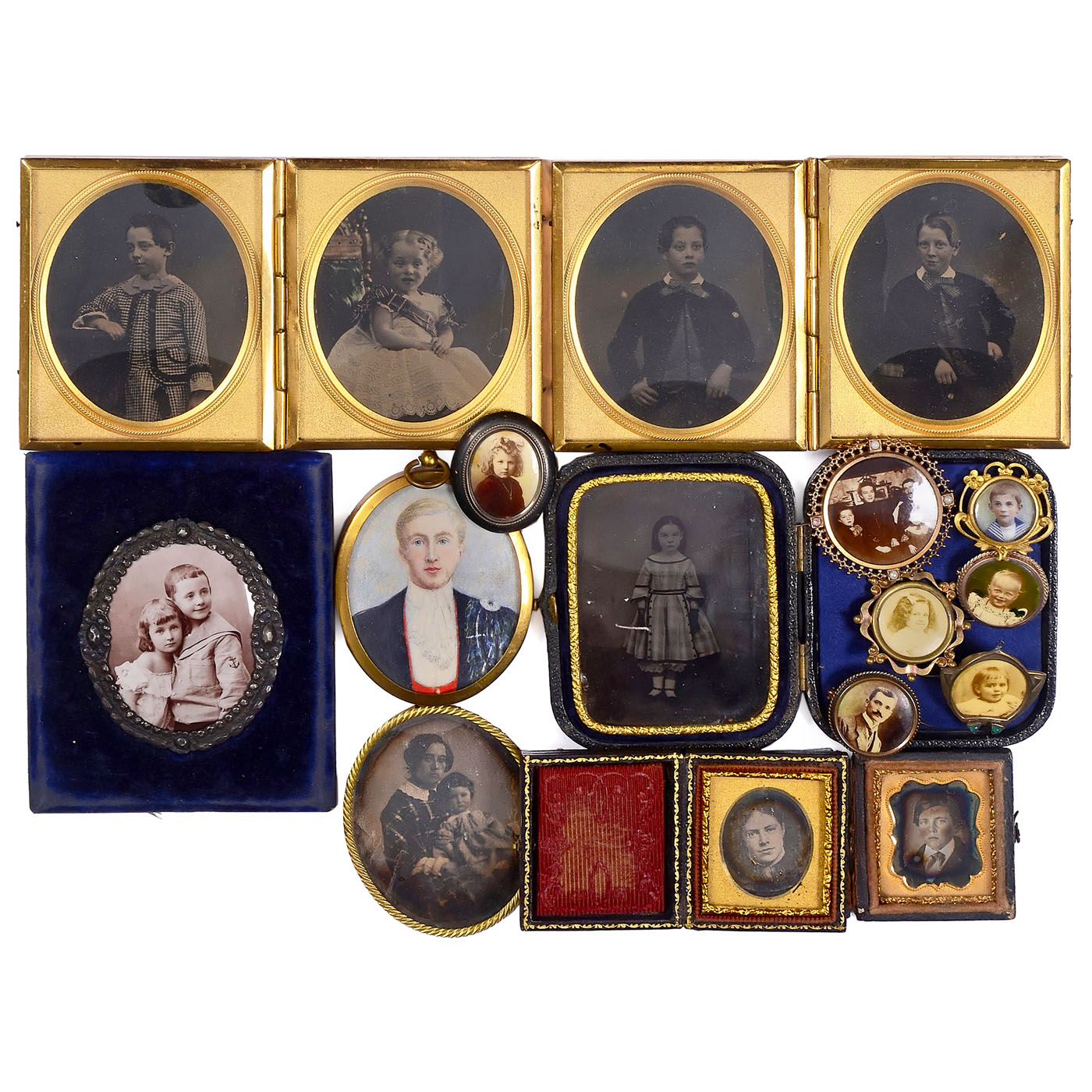 1ÿ7) Brooches 25ÿ40 mm in diameter, one stamped 333, others presumably gold-plated. ÿ 8ÿ9) Oval frames 7 x 5.5 cm with a beautiful colored salt print of a young man and a daguerreotype of a mother with child. ÿ 10ÿ11) Miniature daguerreotypes in cases 4.5 x 5 cm. ÿ 12ÿ13) Pair of brass frames (backed with blue velvet) depicting three sons and a daughter. ÿ 14) Case 9 x 7 cm with an ambrotype of a girl. ÿ And: 15) Medallion 7 x 5.5 cm on blue velvet with a very beautiful enamel image of siblings.