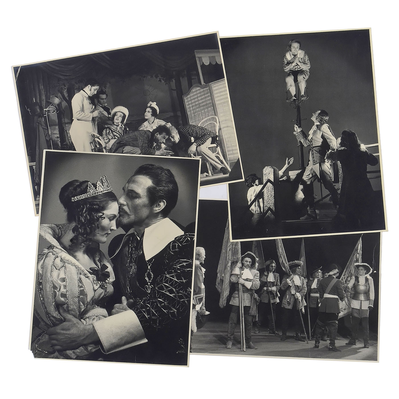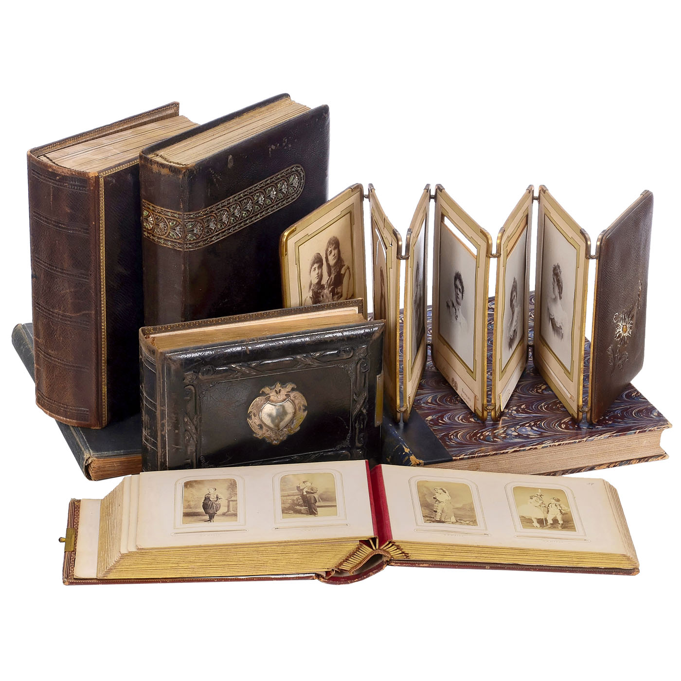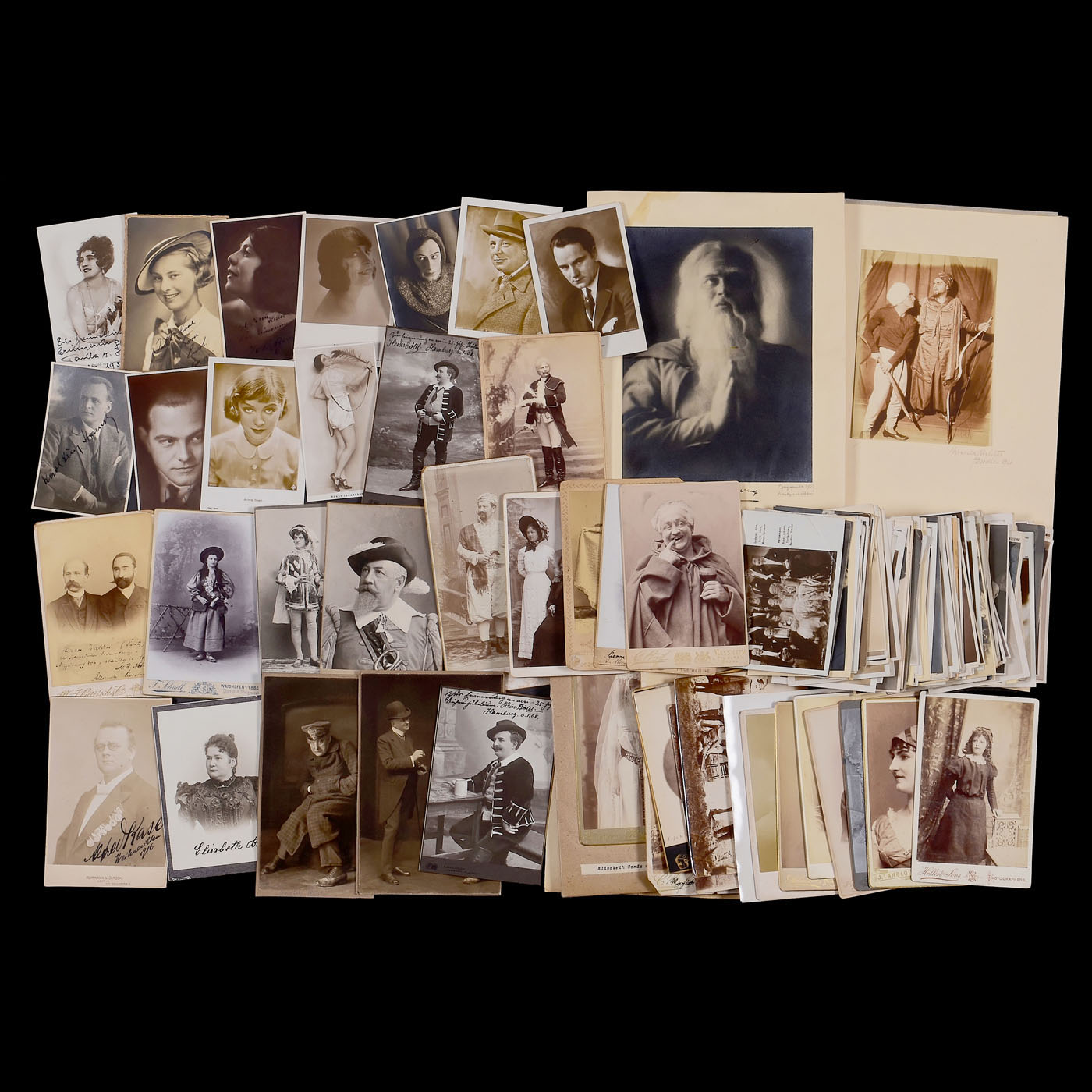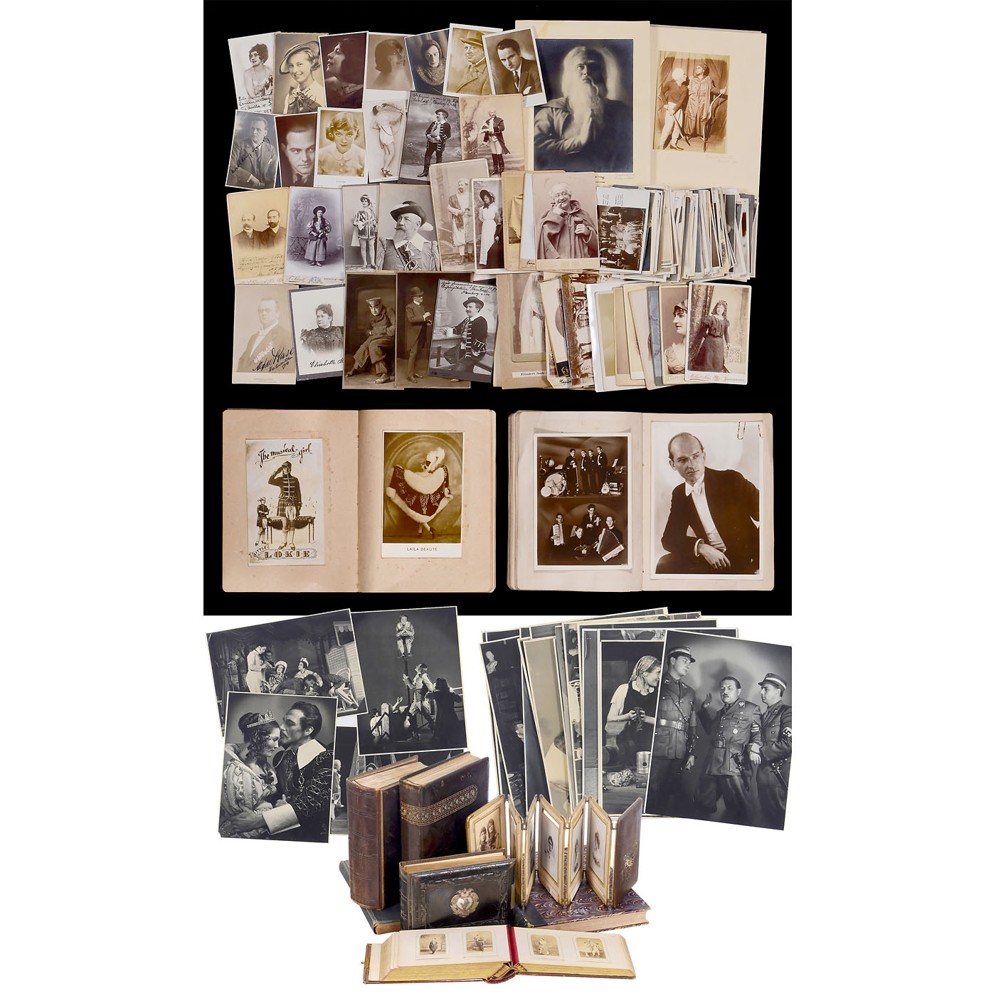 1) Le The?tre magazine, Juin II ÿ Decembre II 1904, 35 x 28 cm, bound. Excellent photographic material! ÿ 2) Actor's album Vienna 1860ÿ1865, 48 cartes de visite on 25 sheets, photographs by Reutlinger, Klughardt, and Carjat. The clasp is missing. ÿ 3) Double leporello album with 12 cabinet photos of a pair of violinists from 1870ÿ1880. ÿ 4) Album 32 x 28 cm, 10 plates of 7 photos each from 1902ÿ1908, only French actors in action or in private. ÿ 5) Russian album 23 x 29 cm, 17 plates with larger formats, German and Austrian actors, including: "To the blower of the Nibelungen ... in friendly memory, Moscow, April 1889". ÿ 6) Album 28 x 22 cm, 30 plates for C.d.V. and cabinet, partially filled, often with highly exalted gestures. ÿ 7) C.d.V. album 16 x 23 cm "Dedicated to the director of the church choir in Winnekendonk, Mr. Teacher Rensing, 1878", partially filled. ÿ 8) Postcard album with over 100 cards from the German cabaret and music scene from 1920 to 1930. ÿ 8) Approx. 140 postcards from actors from 1925 to 1940, some with autographs. ÿ 9) Approx. 36 cabinet cards and other formats from 1880ÿ1910, some with dedications and notes. ÿ And: 10) Surroundings of the Dresden State Theater 1953ÿ1956, approx. 60 stage photographs ranging in size from 24 x 30 cm to mostly 18 x 24 cm, some with captions, mostly with the names of all the actors.