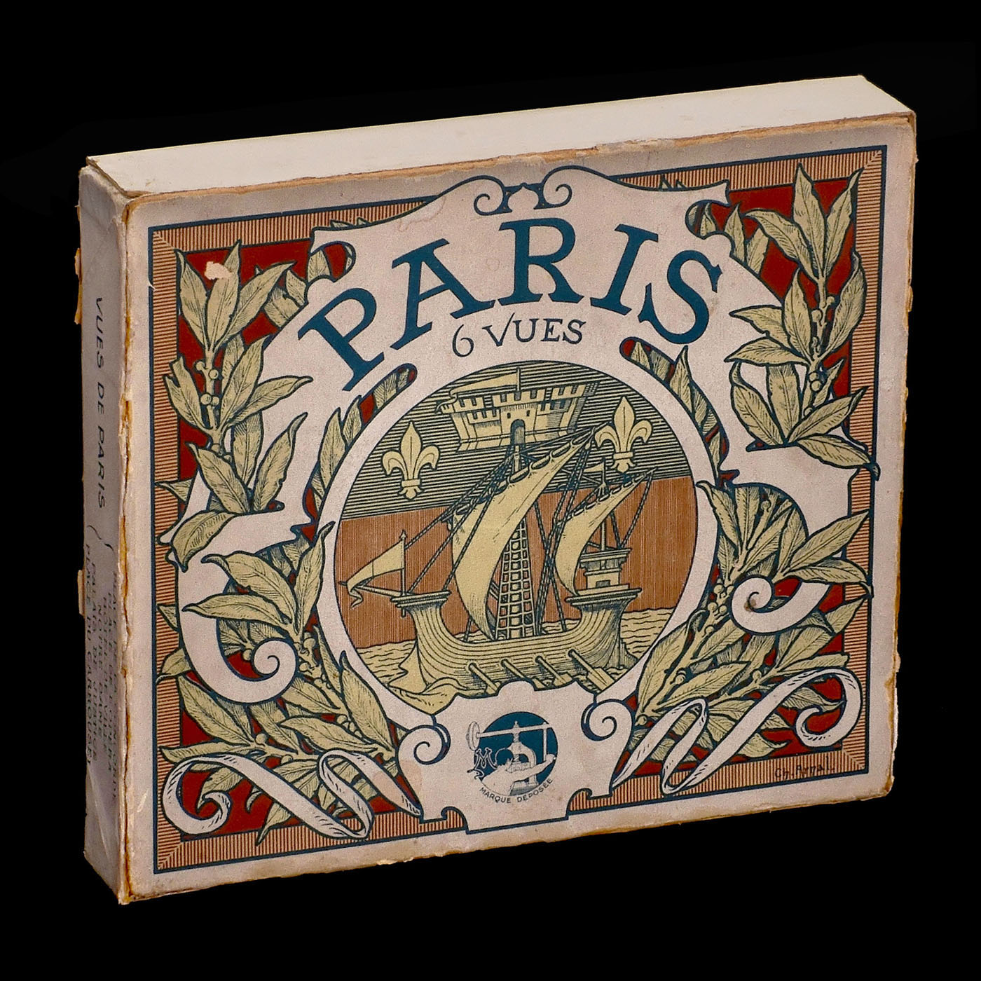 Imp. Mazerand, 130 F9 St. Denis, Paris. Illustrated by Charles Arnal, chromolithographs, fold-out system of views, in original cardboard box in Art-Nouveau design (bottom of box is loose), size of the cards (folded) 8 ? x 7 ? in. Motifs: Place de la Concorde, Place de l'Op