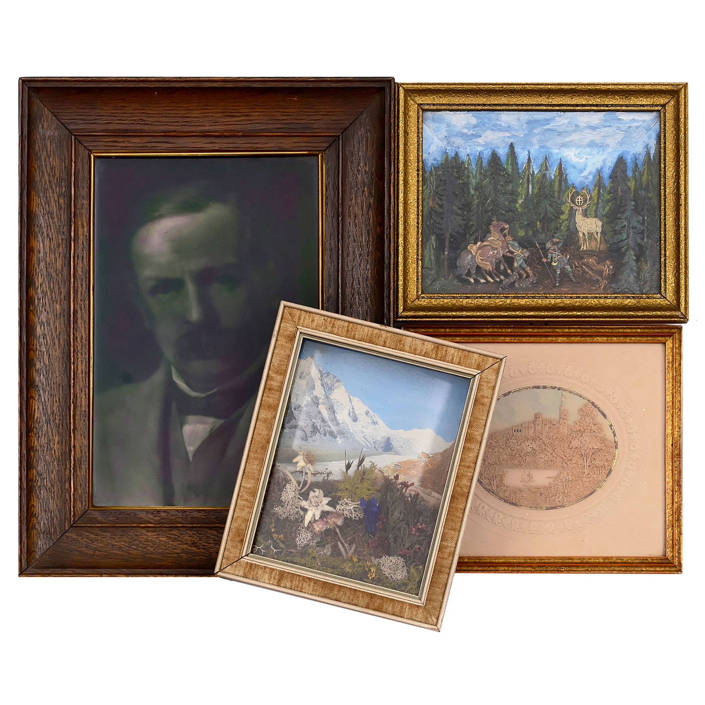 1) George Cartlidge, Staffordshire. "Photo-Ceramic Relief", c. 1910. In a 24 x 32 cm frame, a 16 x 23 cm porcelain picture that looks like glass from the front, but is not flat, with the heights and depths of the portrait. On the back of the porcelain cast, there is a print: "Portrait of the R. Hon. David Lloyd George modeled by Geo. Cartlidge after a photograph by Ernest H. Mills." It has been tested to see if it is translucent like a lithophane, but it is not. There are some cracks in the "surface glaze". A very rare subject.