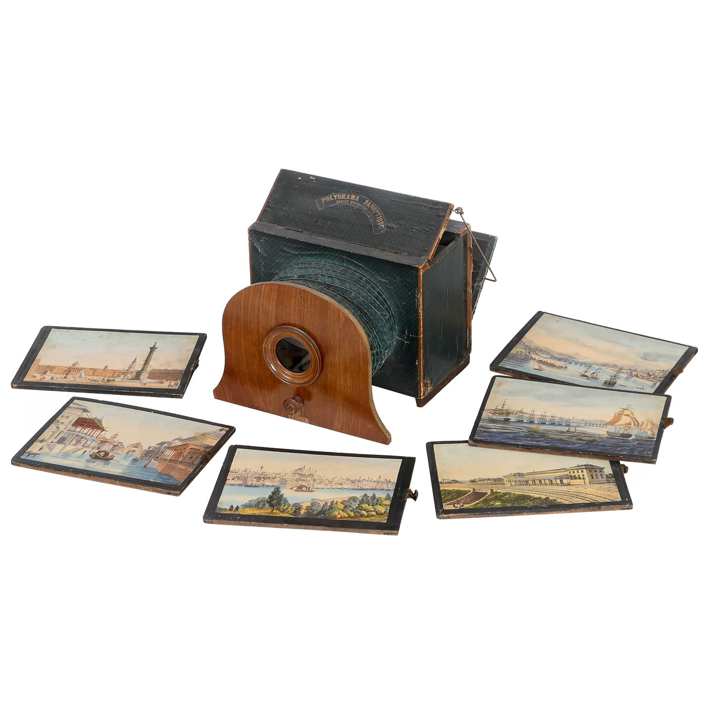 France. Polyorama Panoptique, the large picture viewer for tinted paper day-and-night metamorphic pictures in the format 20 x 14.2 cm, size of the viewer 22 x 31 cm, height 17 cm, green bellows, front in mahagony with framed lens of diameter 4.2 cm, housing with green decorative paper, some minor cracks. With 2 day-and-night images "Le Canal de Canton Chine" (front with an unobtrusive splice) and "Place Trafalgar Londres" and 4 images where the night picture shows a greatly changed motif: "Chemin de Fer," "Sebastopol et Inkerman," "Bombardement et Prise de Bomarsund," and "Constantinople et Balaclava." These are panels with powerful effects.