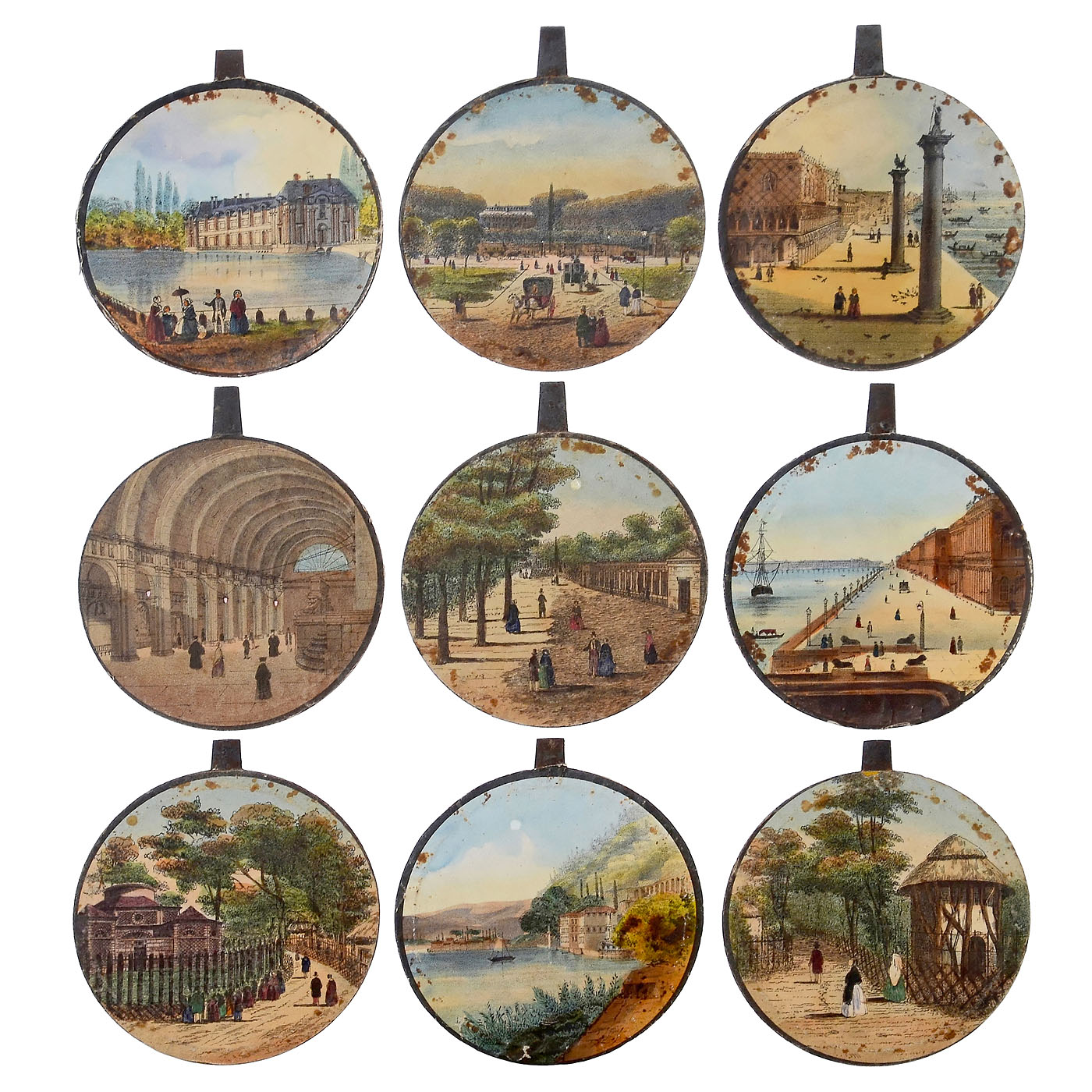 9 original images, measuring 8.1 cm in diameter with a sheet-metal-reinforced border, for day-and-night effects, in good condition without any cracks. All have a stamped number on the back. Since there are duplicate numbers, these images are from different series. Rarely found alone!
