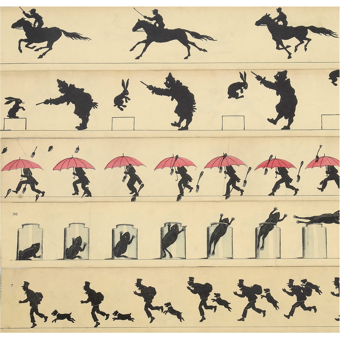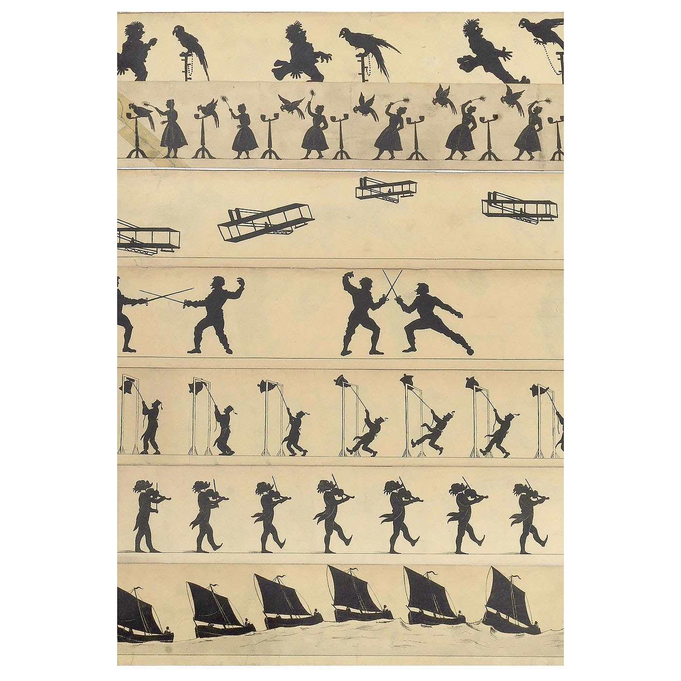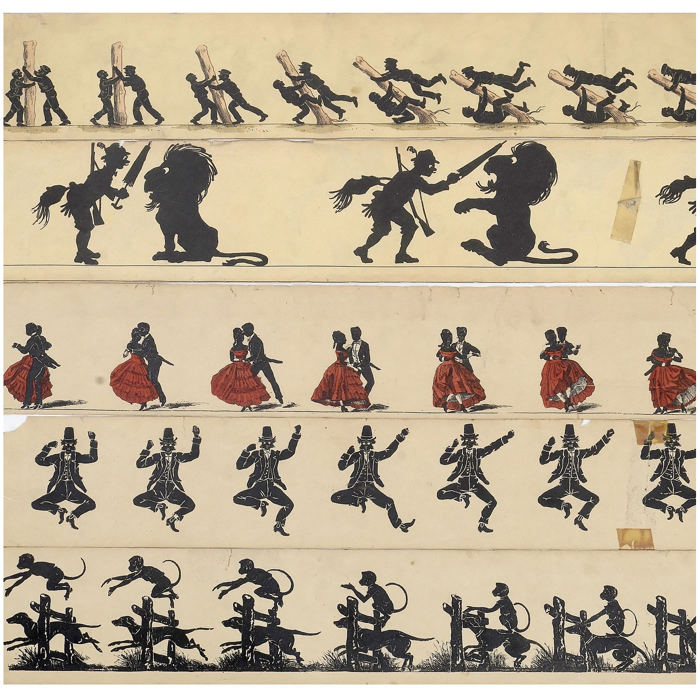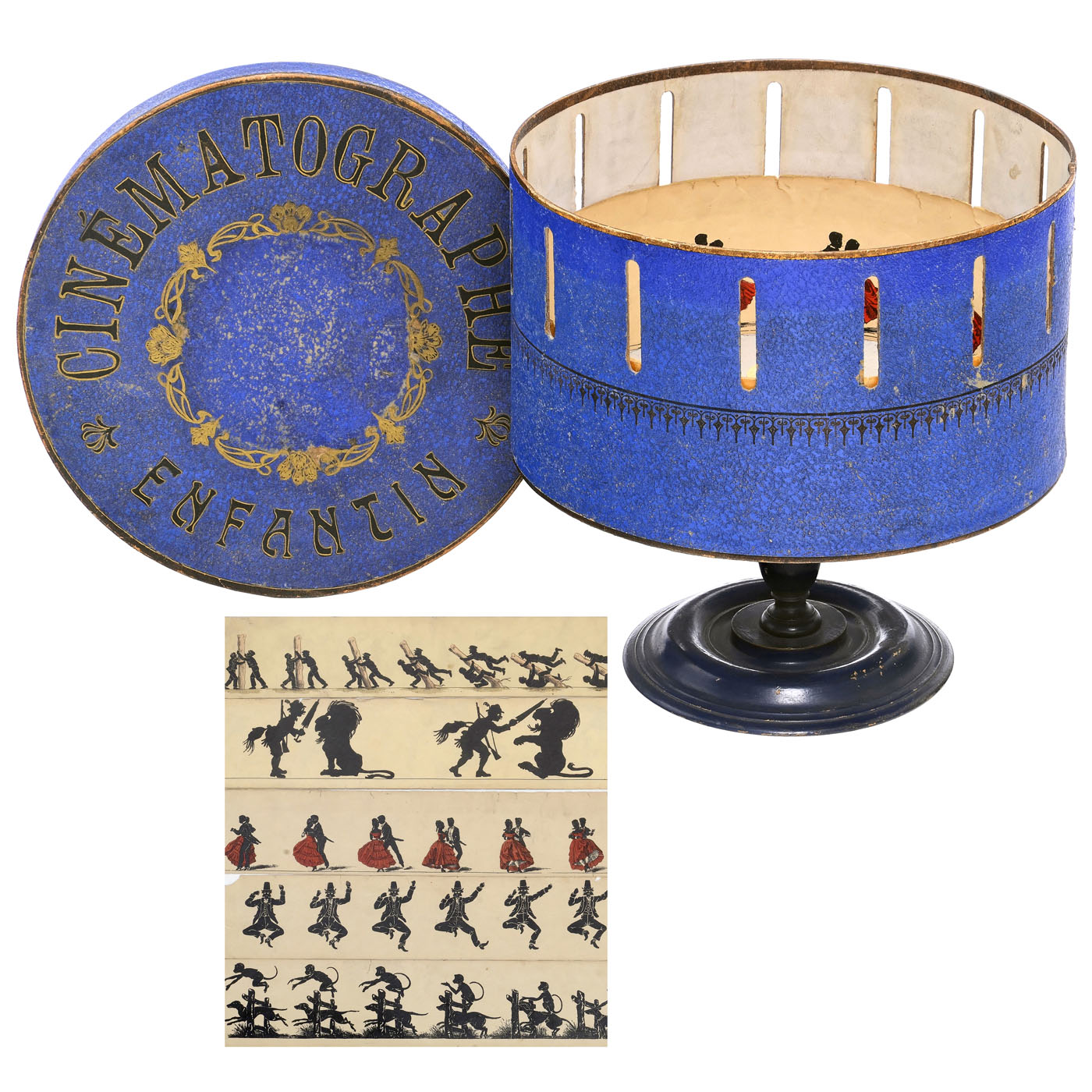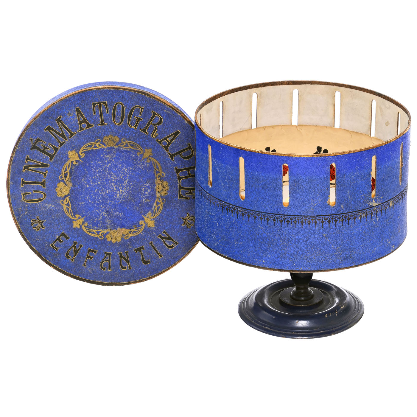 France. Drum with blue decorative paper, original blue base, decorative blue lid with gold embossing, diameter 24.5 cm, height including wooden base 26 cm, with 10 different image strips: 3 single-sided 75 x 8 cm, 4 double-sided 76 x 8 cm, and 3 strips 76 x 9 cm with different numbers of images on the front and back (instead of the usual 13, only 4 and 5; 5 and 6; and 5 and 7). A few strips with tears and splices.