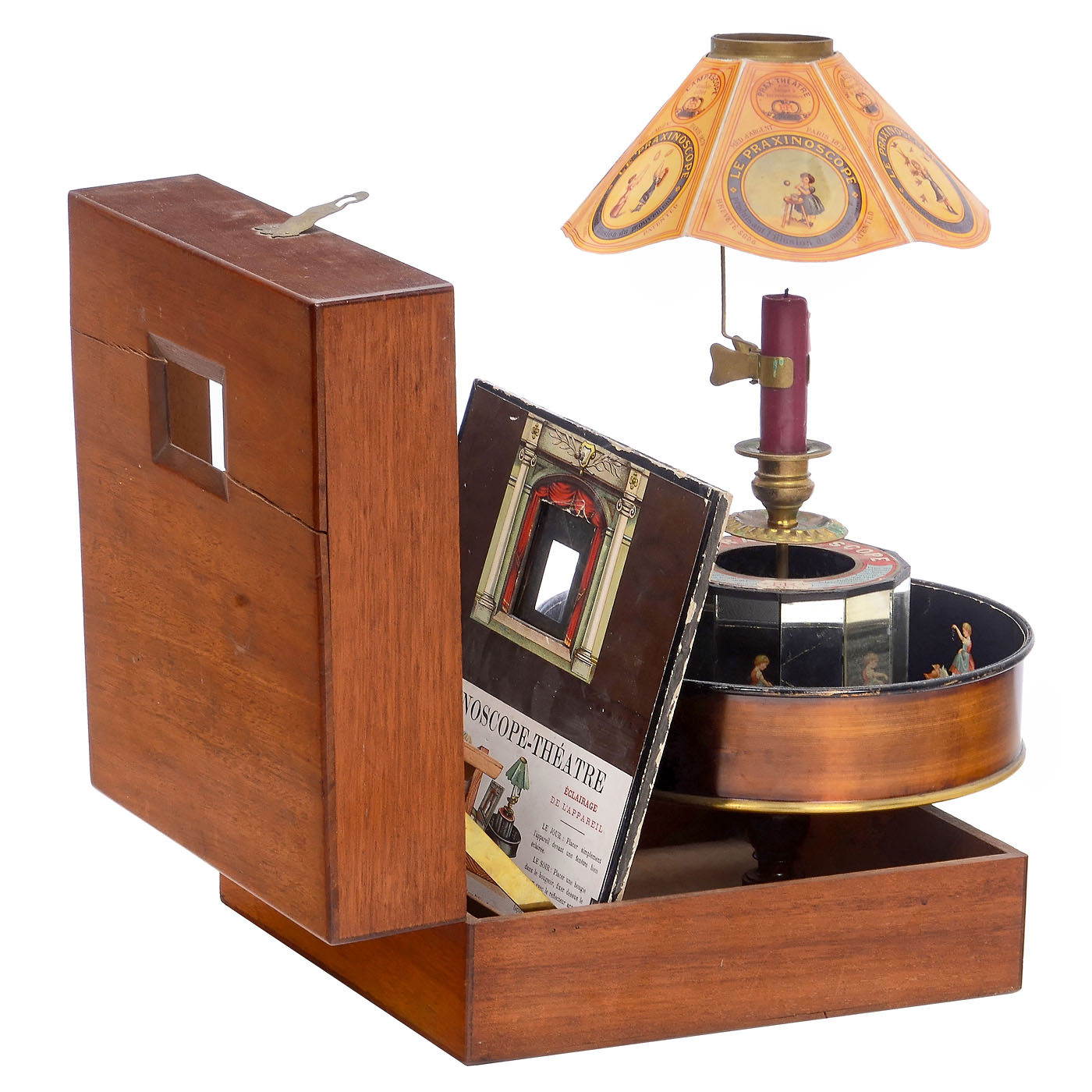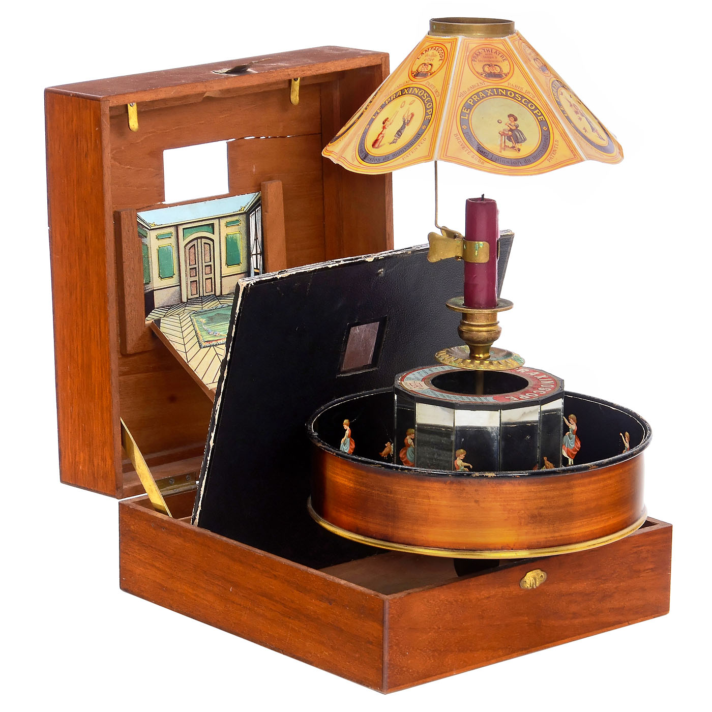 Reynaud, Paris. With 8 ? in. (22 cm) diameter lacquered metal drum, with all mirrors (one fogged), candle holder, shade (replaced), in mahogany case with viewing window and card proscenium, wd. 9 ? in. (25 cm). With all 10 strips (with cracks) and with stage sets, No. 1: Interieur and No. 1 Decor originally firmly mounted), No. 2: Cirque, No. 3: Paysage and No. 3 Decor, No. 4: Neige and on bent sheet metal No. 4 Decor, as well as No. 5 the rare mirror for Decor No. 3 (with crack). Furthermore there is a pull-out mica disc in the opening of the "theater view". Good original condition.
