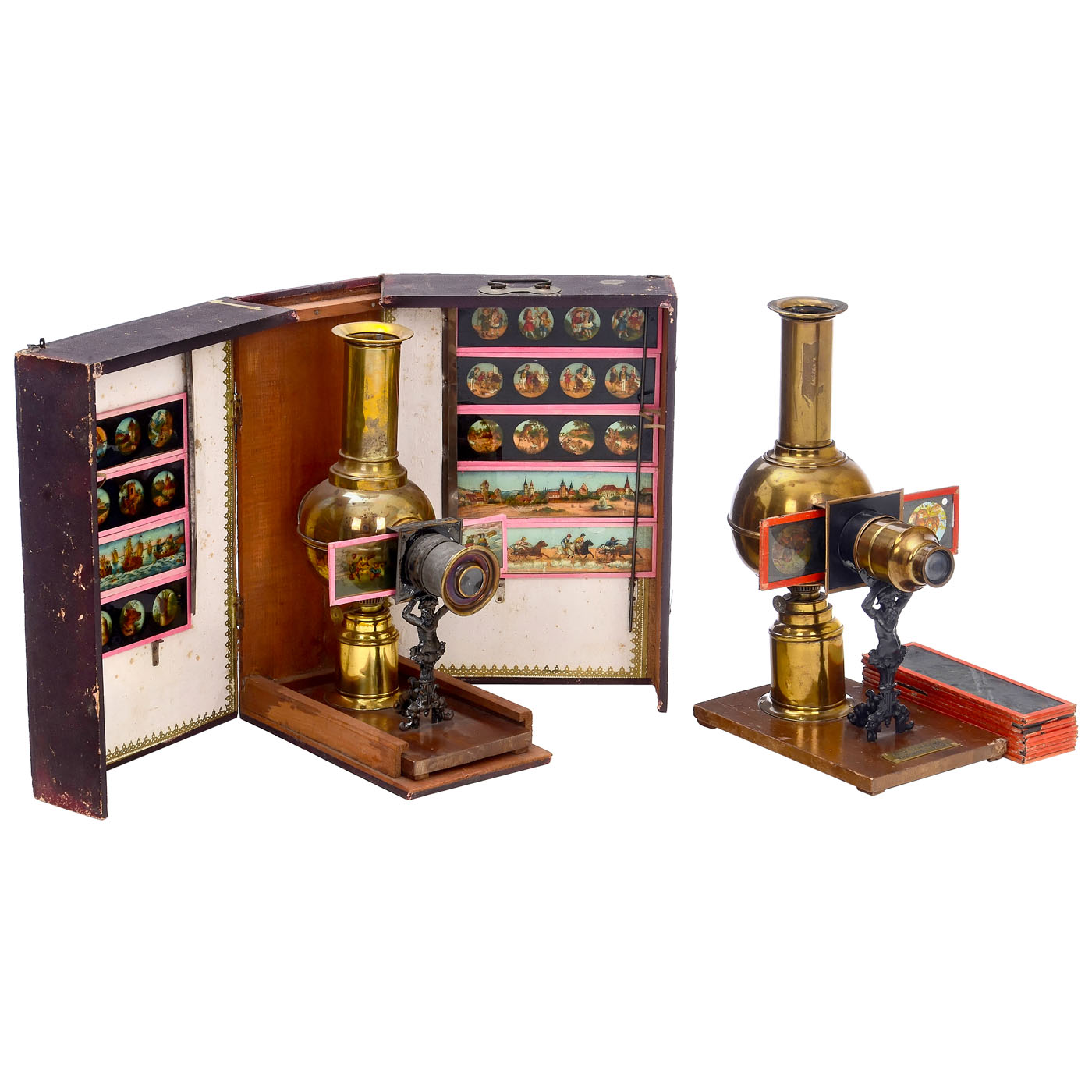 By Jean Schoenner, Nuremberg. Both with polished brass casing, slide holder in the shape of a caryatid (cast iron, black-painted, early type). 1) Magic lantern for 5cm slides, height 31 cm, with original box and the complete set of 10 original slides, held in place by a sliding rod.