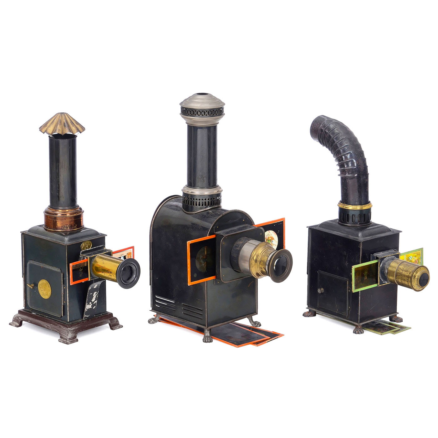 All made of Russian tinplate. 1) Bing, Nuremberg. Magic lantern, height 44 cm, for 8 cm wide slides, with reflector, burner and original chimney; includes 3 slides by Bing.