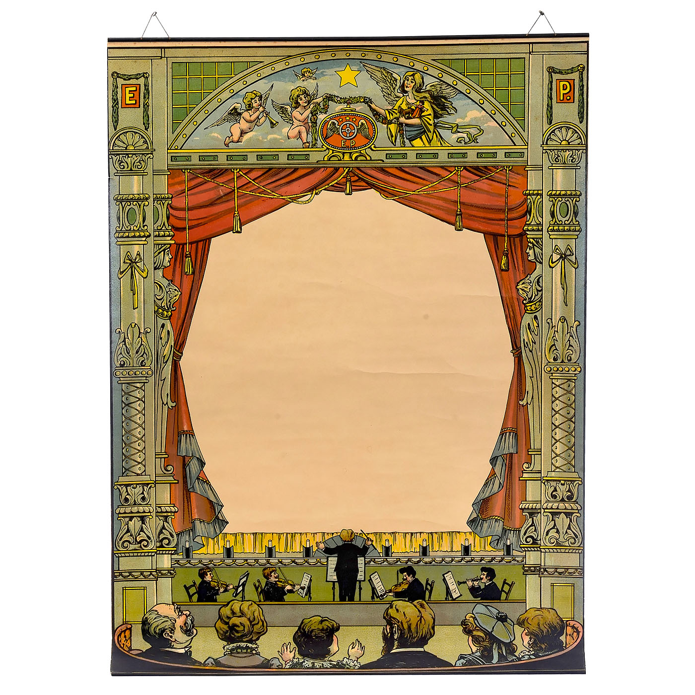 Ernst Plank, Nuremberg. Order no. 359 in maker's catalog. Ready-prepared paper, 30 x 41 in. (78 x 104 cm), with polychrome-printed stage design, orchestra and audience.