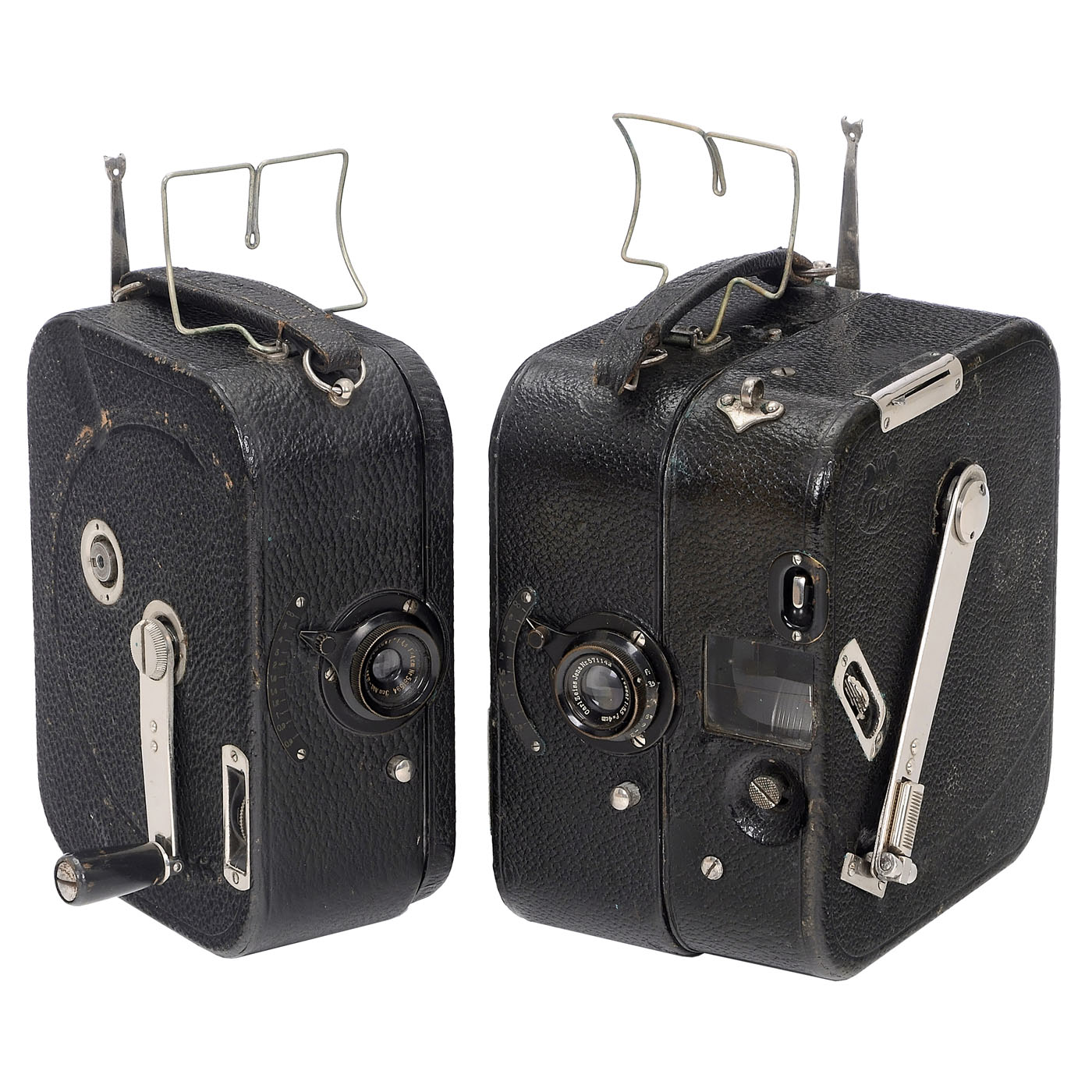 Ica AG, Dresden. Two film cameras for 35mm film in 12m Ica cassettes (not included). Lenses in focus mount: Tessar 3.5/40 mm and Ica Dominar 4.5/40 mm. Viewfinder system: Fold-out frame viewfinder. Drive camera 1: Handcrank on eight-gear or single-axis drive (2 handcranks included), camera 2: Attached spring mechanism (running) with Newtonian viewfinder on the spring mechanism.