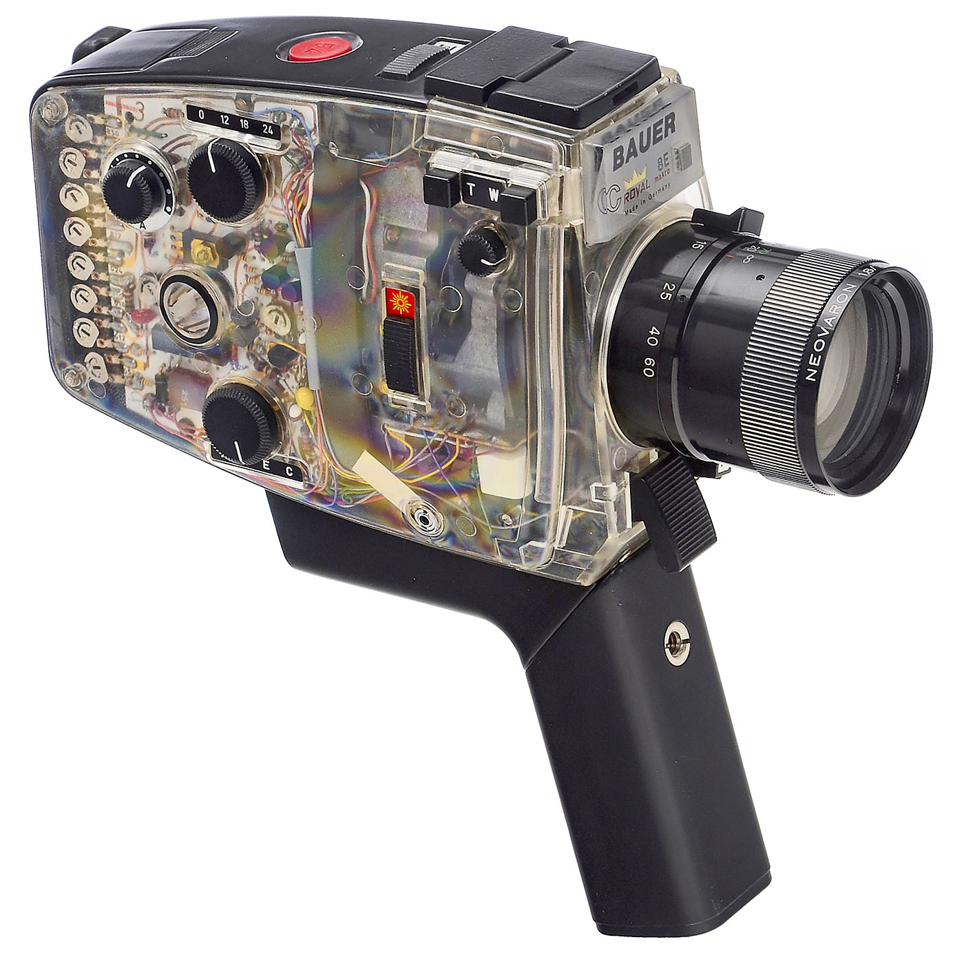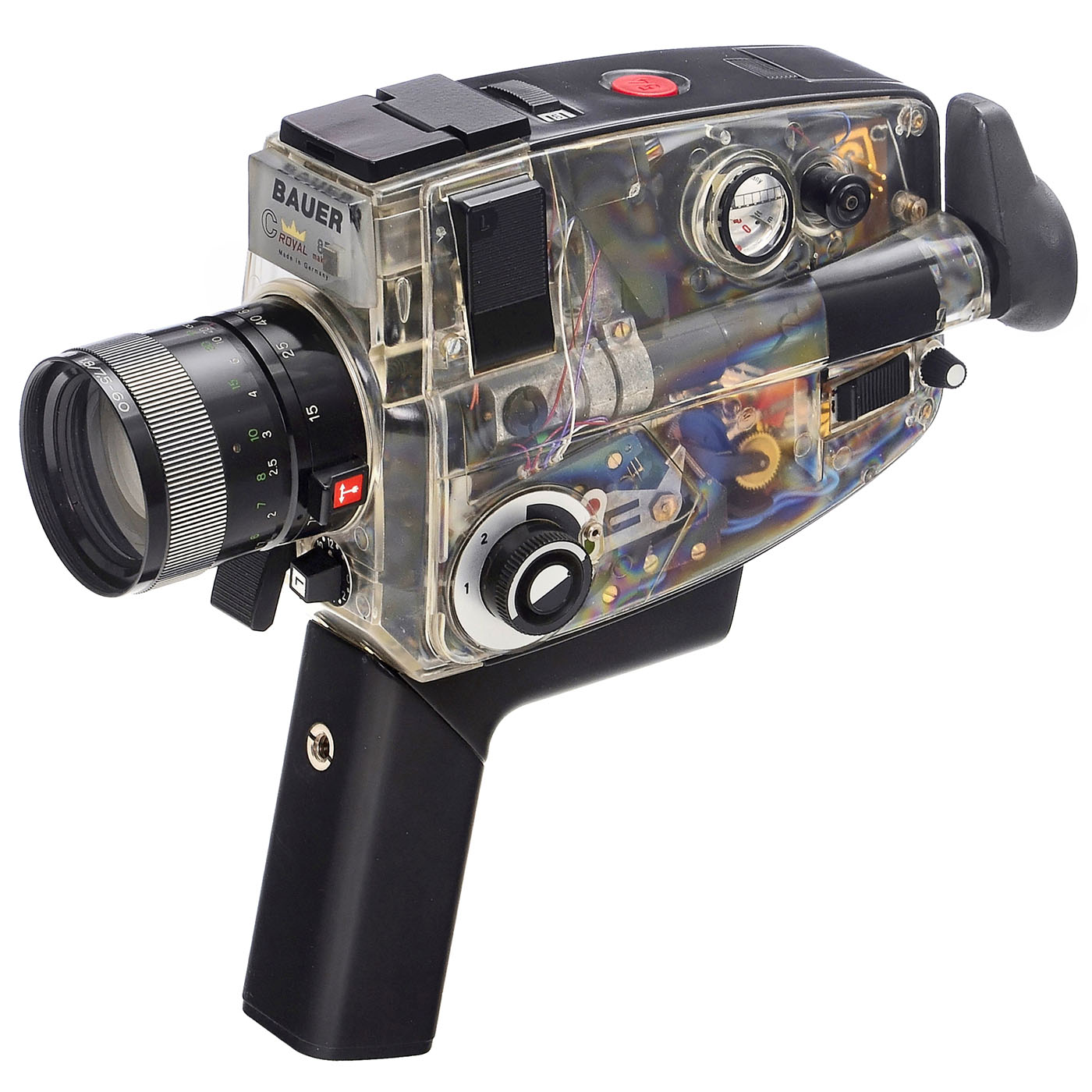 Robert Bosch Photokino GmbH, Stuttgart. Super-8 film camera in a Plexiglas housing. The electric zoom works with fresh batteries, the macro function works flawlessly, and it's in very good condition. A demonstration model that could be used for filming (the cassette compartment is, of course, light-tight!). German cinema technology at the height of its era. An important example of one of the most expensive Super-8 cameras at the time! Extremely rare!