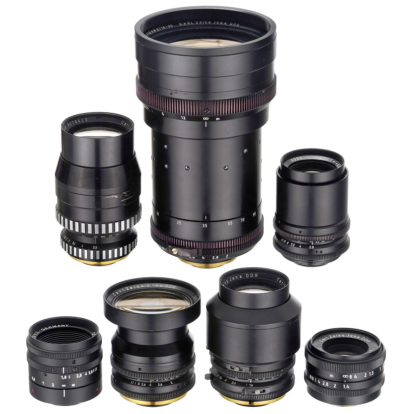 Carl Zeiss Jena GDR or DOCTER Optics-Germany. All in good to excellent condition under point light, almost all with fully adjustable aperture: Tevidon 2/10 mm no. 5359, Tevidon 1.8/16 mm, Tevidon 1.4/25 mm no. 17080, Tevidon 1.8/50 mm no. 9156271, Tevidon 2.8/70 mm no. 4038, Tevidon 2.8/100 mm no. 8578429 and Vario-Tevidon 2/18