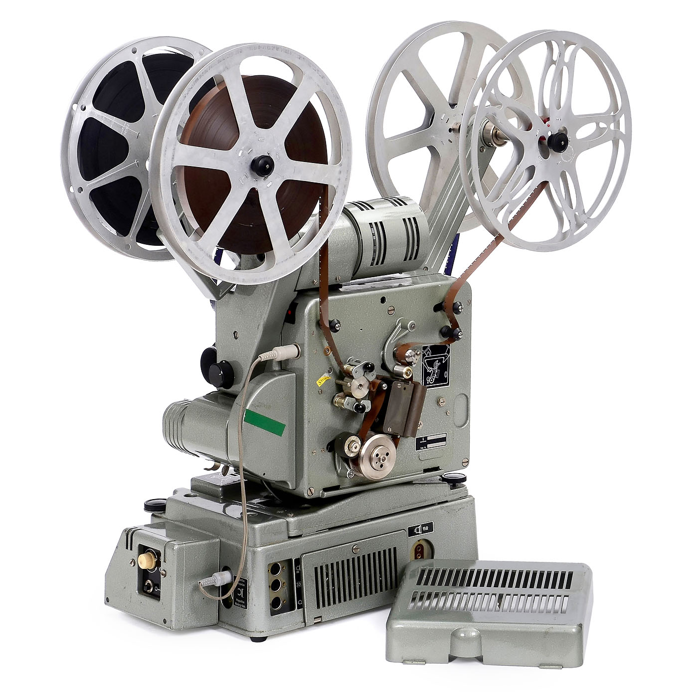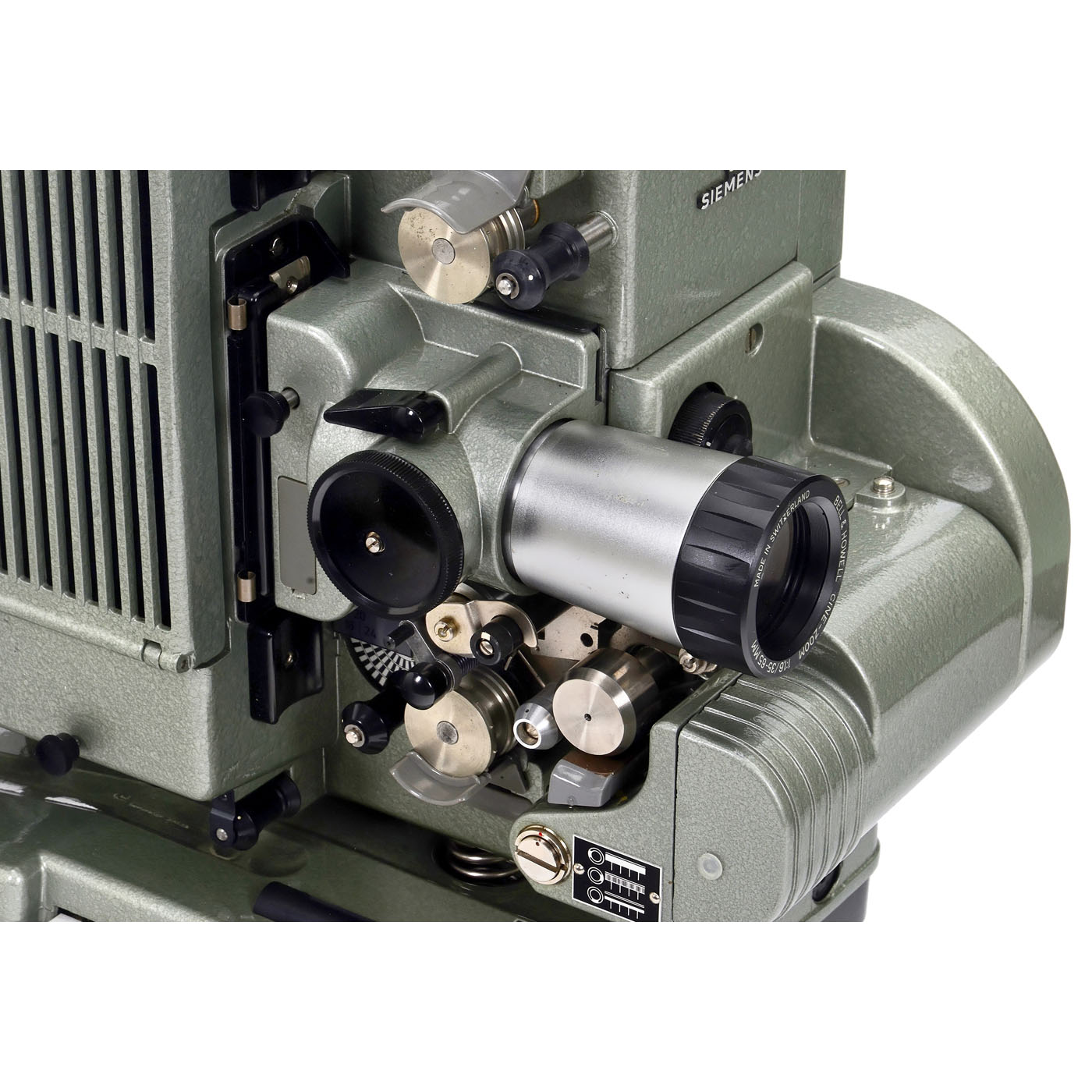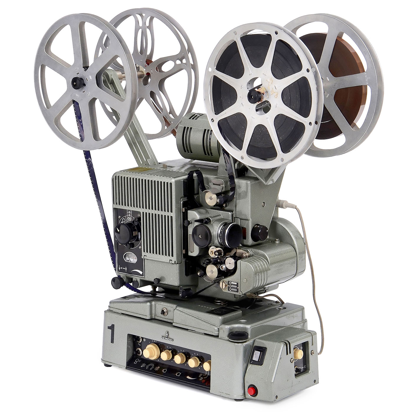 Siemens, Berlin. 1) Siemens 2000 dual-band projector mounted on an amplifier. 16mm film projector for the playback of optical sound prints. Magnetic edge track playback and recording, and parallel playback and recording of a separate 16mm magnetic tape. Synchronous motor for 25 fps (television standard). Television film operations, including the program sequence, always used two-band technology: Picture and sound on separate tapes. Lens: Isco G?ttingen Kiptanar 1.5/50 mm.