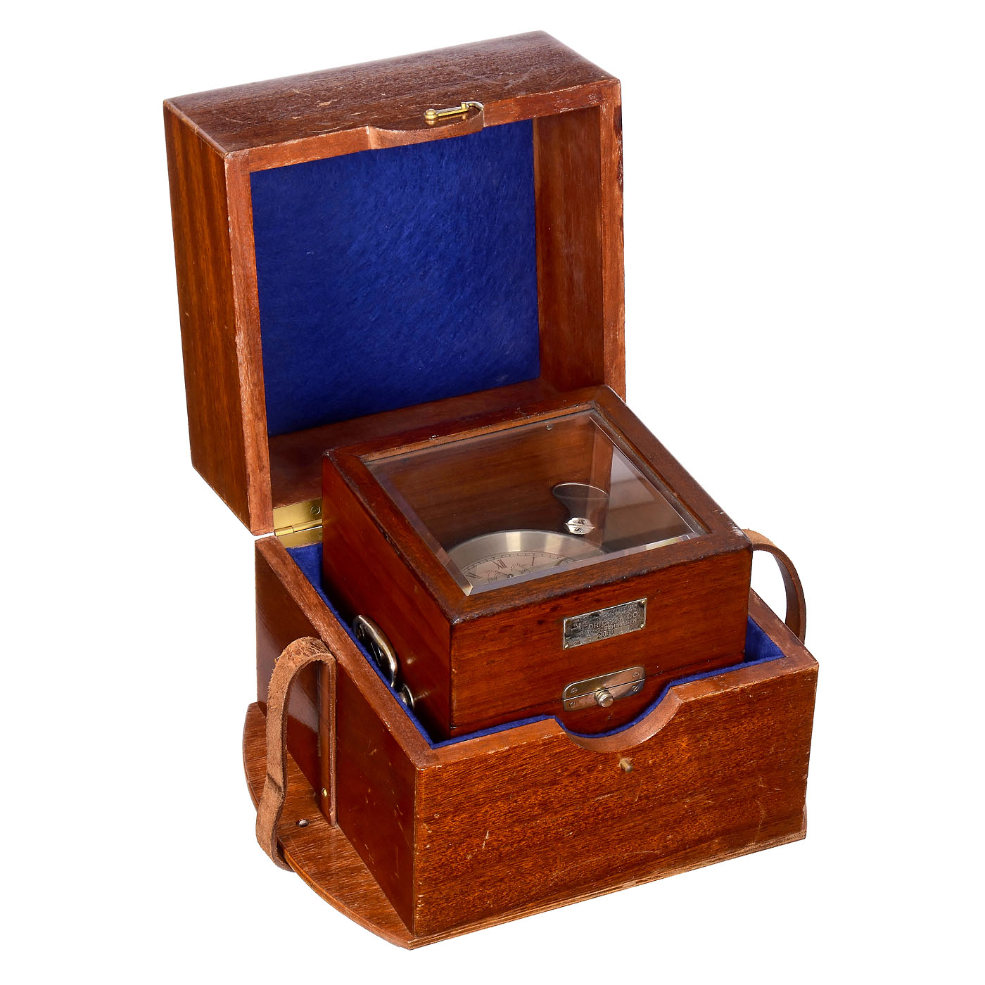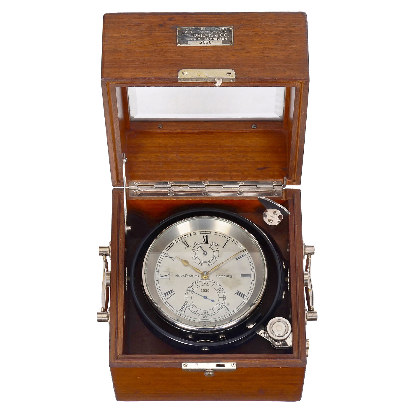 Signed "M?ller-Friedrichs Hamburg", no. 2030, with gilt full-plate brass single-chain fusee four-pillar movement, signed "Hanseatische Werkst?tten Friedrichs & Co. Hamburg Schnelsen", silvered dial, outer minute ring, Roman chapters, subsidiary seconds, 56-hour winding indicator, gold hands, blued seconds hands, rear side embossed with eagle and Swastika, naval no. 1591, gimbal-mounted in glazed mahogany deck box within cushioned guard case, working condition, with key.