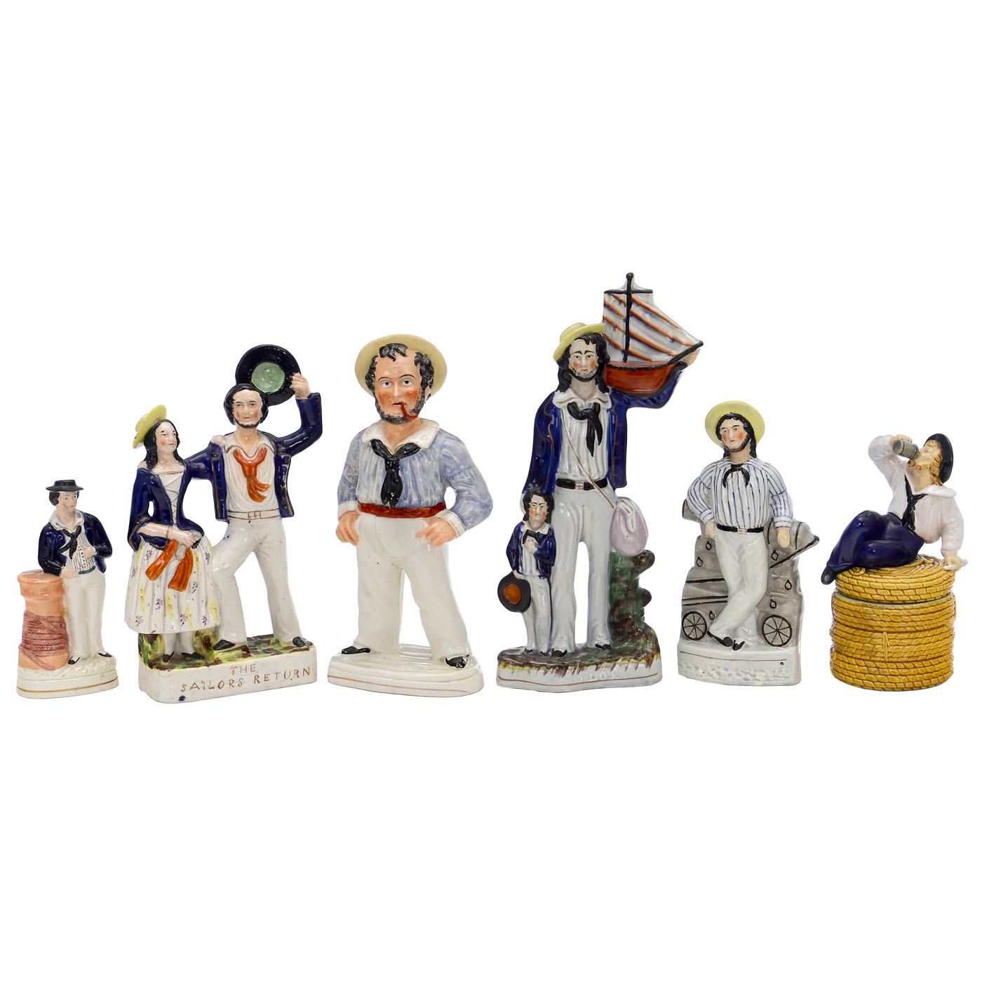5 English Staffordshire sailor figures: 1) Large figure "Sailor", with ship on his shoulder and boy at his side, height 15 3/5 in.