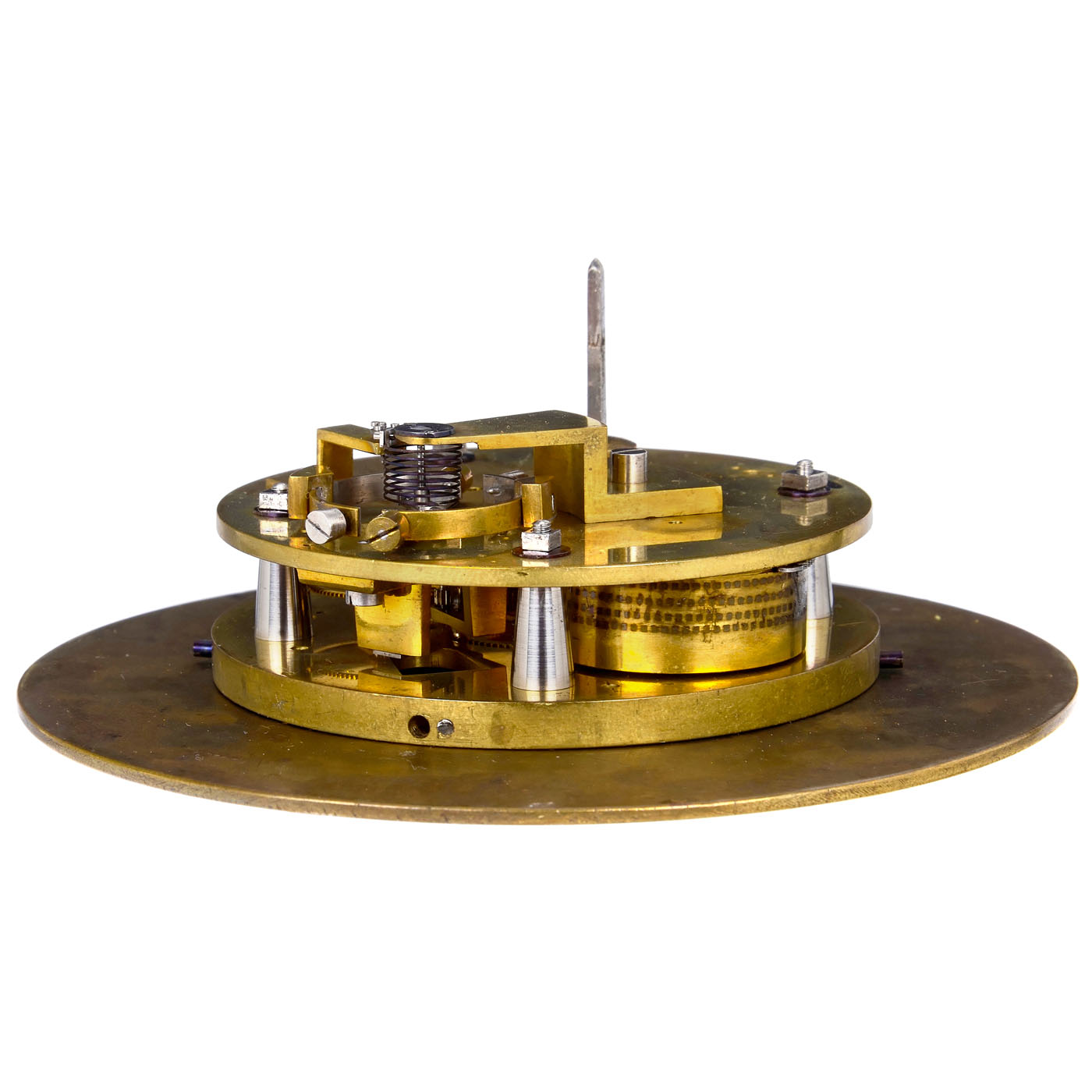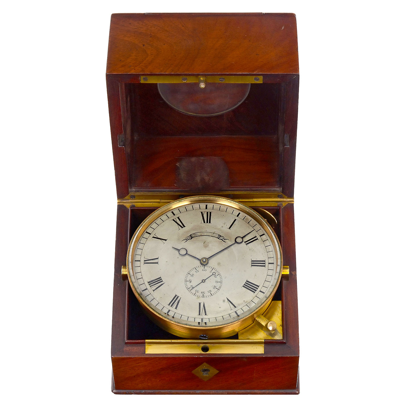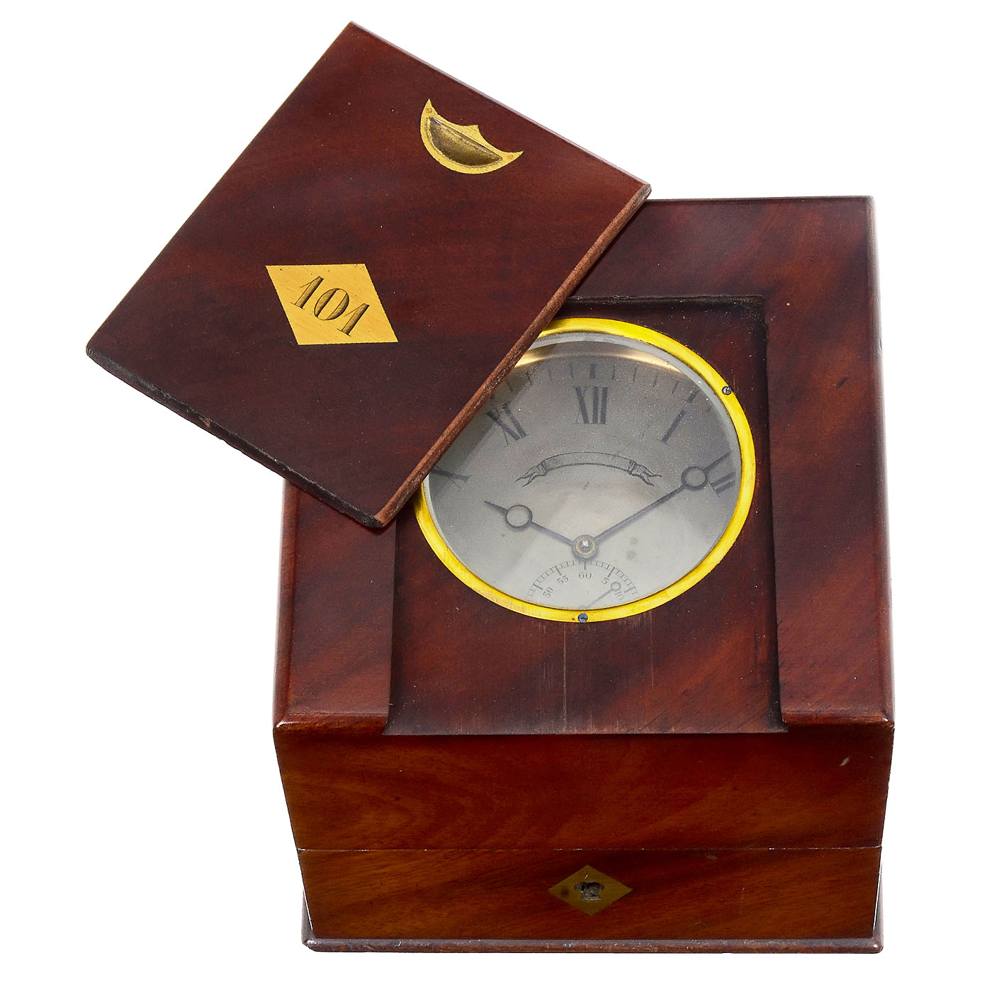 Presumably France, unmarked. Mahogany case, 5 ? x 5 ? x 4 4/5 in., round viewing window in the lid, slider with no. 101 in brass diamond, gimbal-mounted brass movement housing, silver-plated dial with Roman numerals, ? 4 in, removable protective cover, second hand for ? seconds, with gilt full-plate brass single-chain fusee movement, running time 39 hours, original key. In good working order.