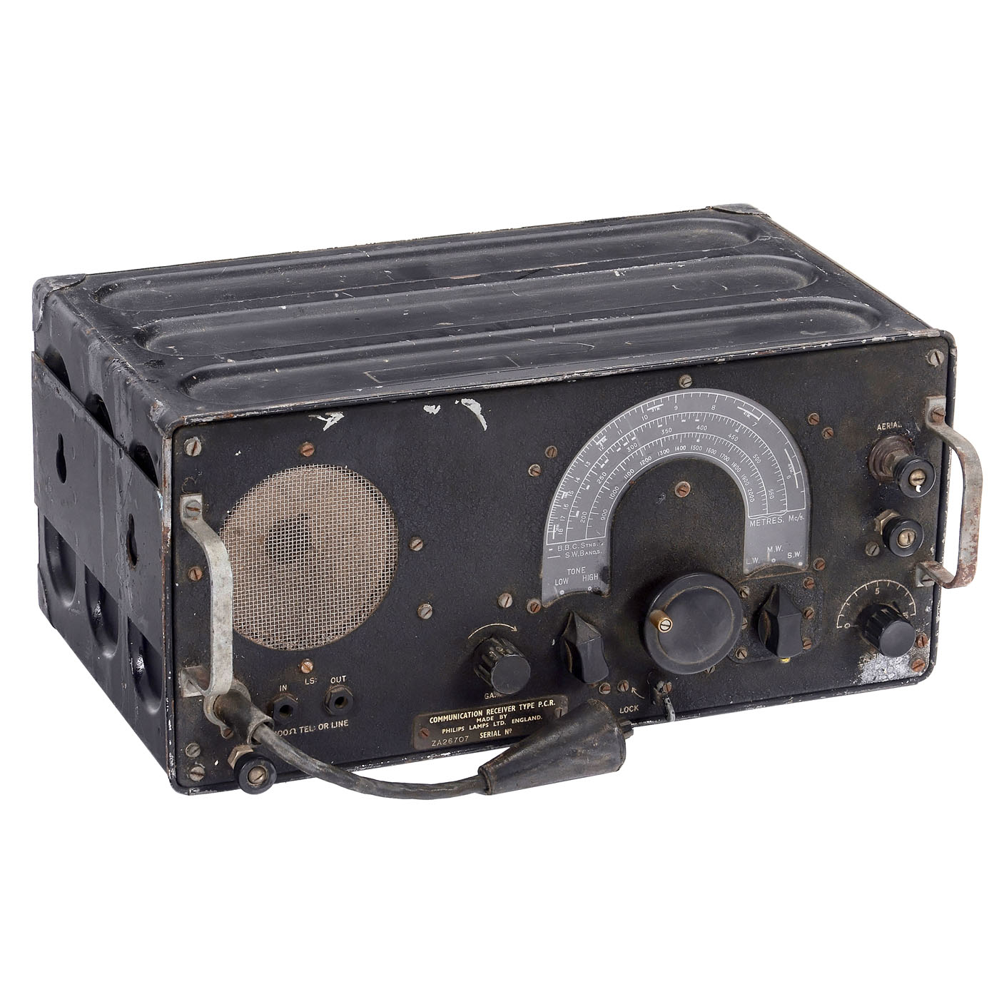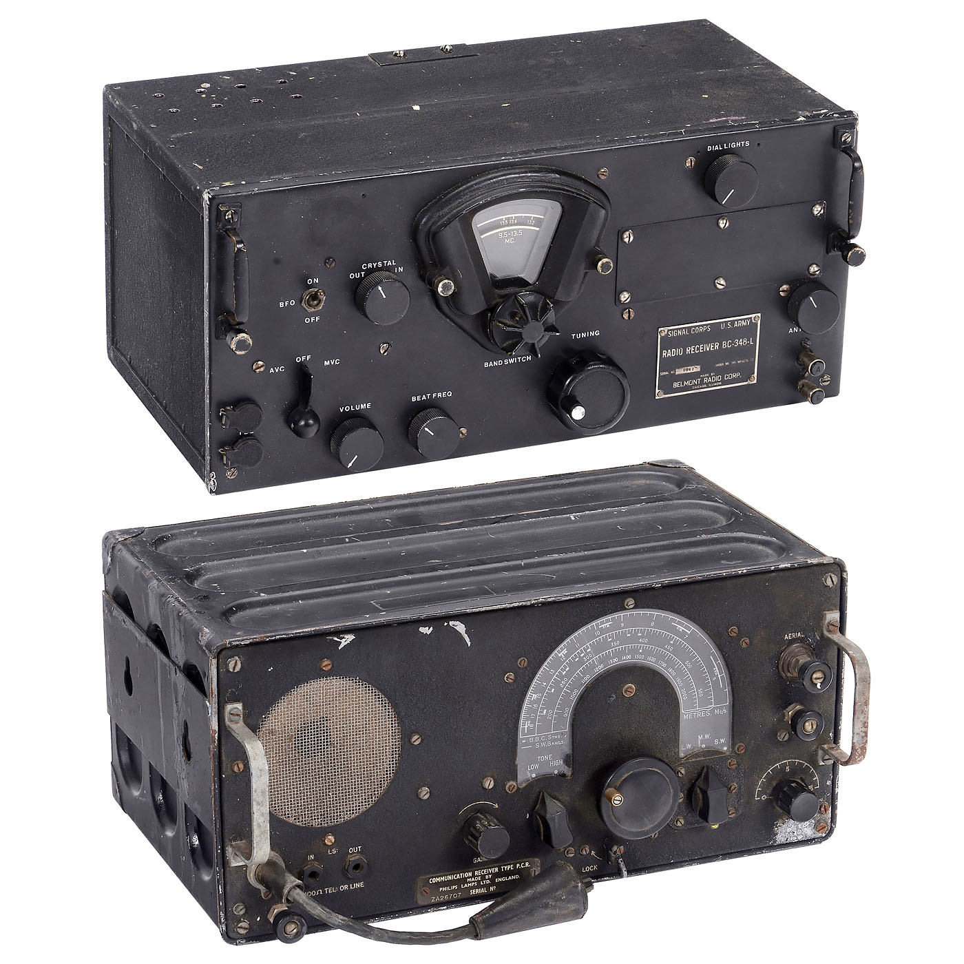 1) Model BC-348-L, Belmont Radio Corporation, for the US Army Signal Corps, 8 tubes, battery-operated. ÿ And: 2) Communication receiver P.C.R., designed by Pye and built under contract by Philips, 6 tubes, 3 wave ranges, internal speaker, for mobile or airborne purposes, for external power supply.