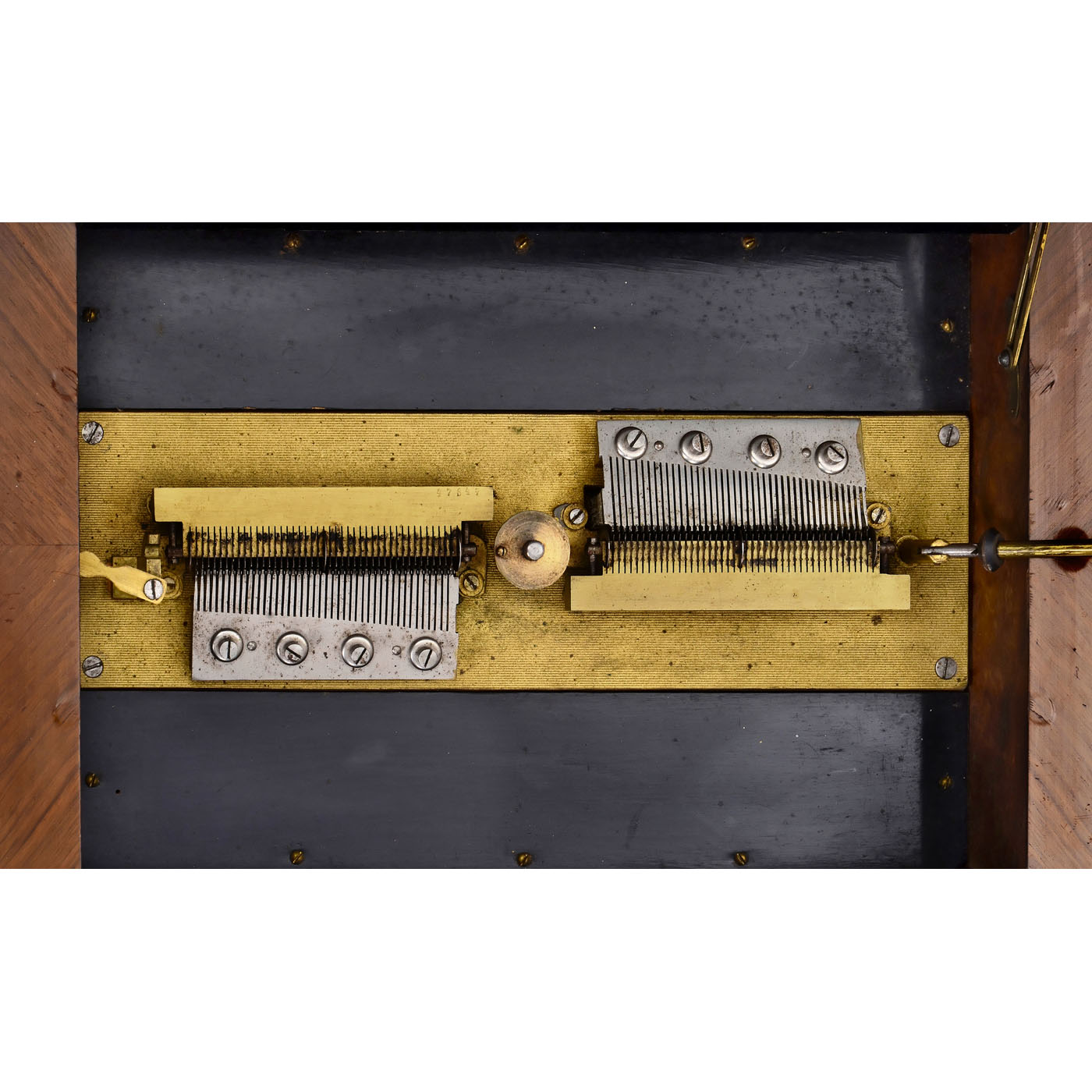 Symphonion Musikwerke, Leipzig. For 11 ? in. discs, with 84 teeth in double comb (2 broken tips), lever-wind mechanism, walnut case and brass handles, 19 5/8 x 15 x 10 1/5 in., original lithograph in lid, with 18 discs, good playing condition. On matching table with drawer for the discs.