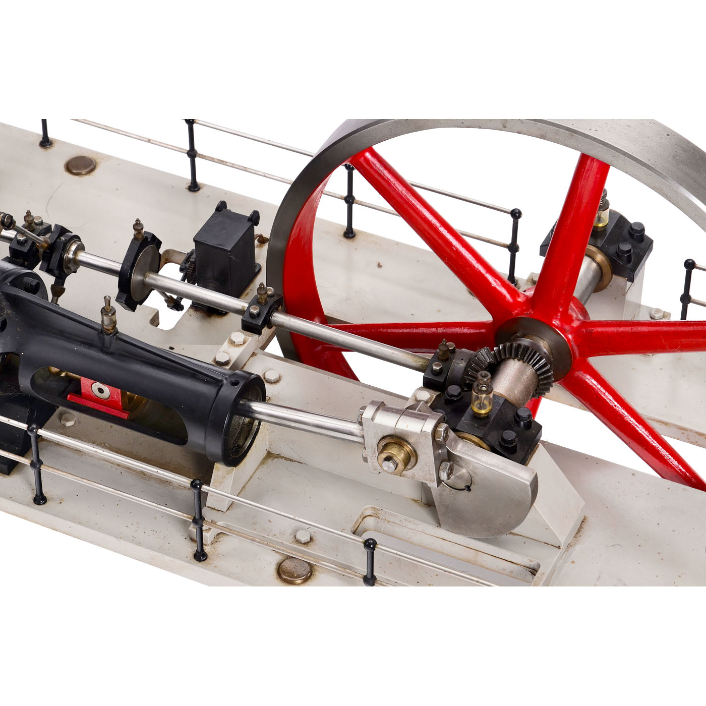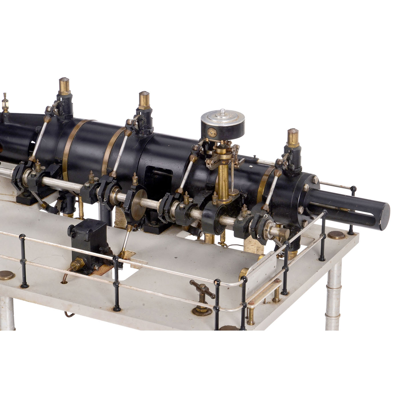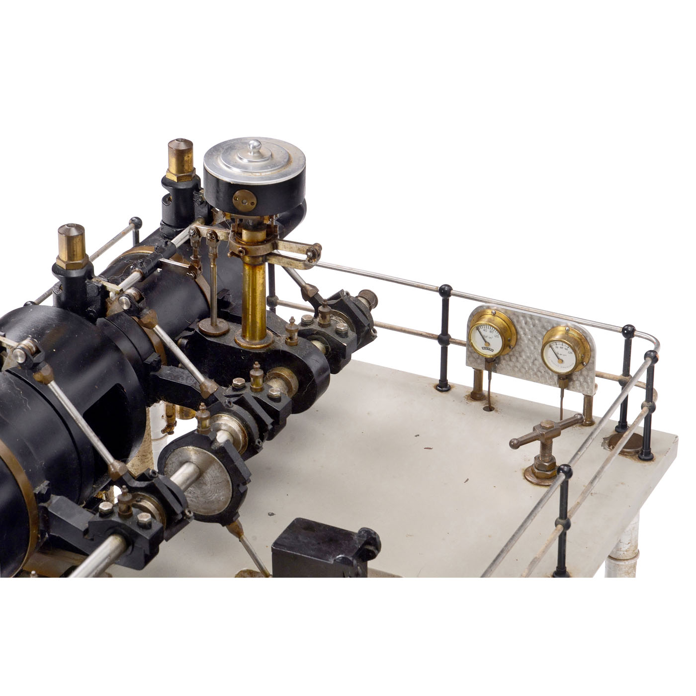 England, precision workmanship in stainless steel, only the flywheel (? 17 in.) is made of cast metal, two-cylinder compound steam engine with high- and low-pressure cylinders (? 3 and 4 ? in.), valve control via eccentric rings, functioning speed regulator, steam cooler (condenser), 2 oil pumps, 12 glass oilers, 2 pressure gauges, overall dimensions 46 ? x 19 1/3 x 19 in., tested with compressed air, in working order.
