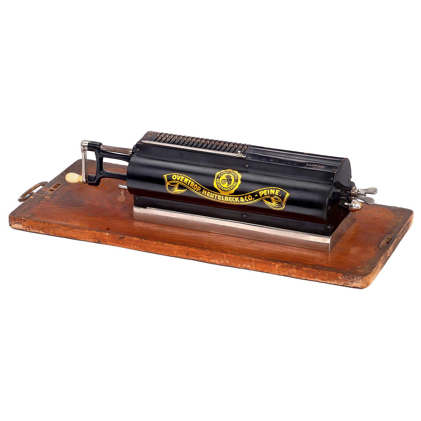 Rare large German spokewheel calculating machine, with 20, 20 and 12 digits. – Low serial no. 2071, original wood case. – Literature: Martin, p. 338. – Good working condition!
