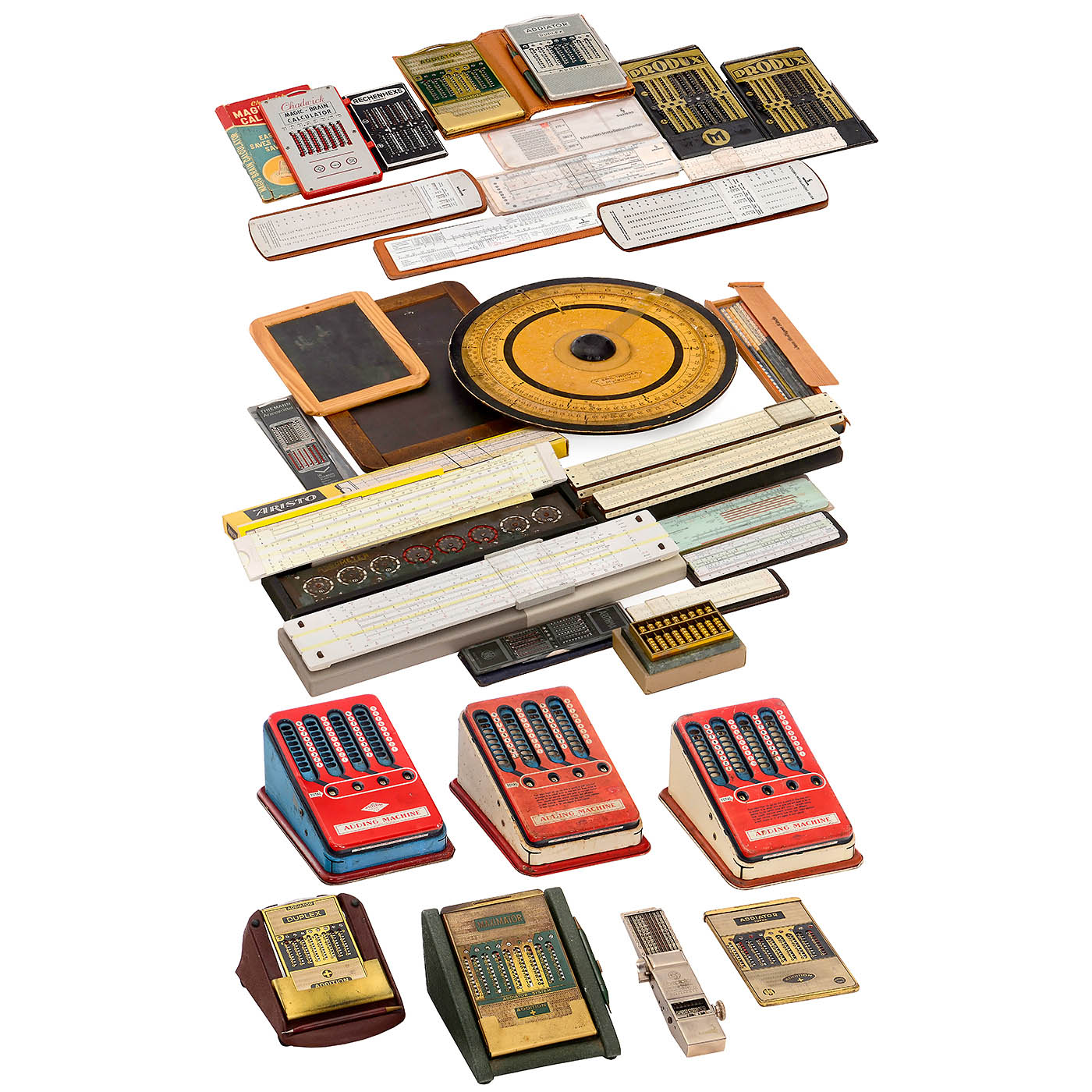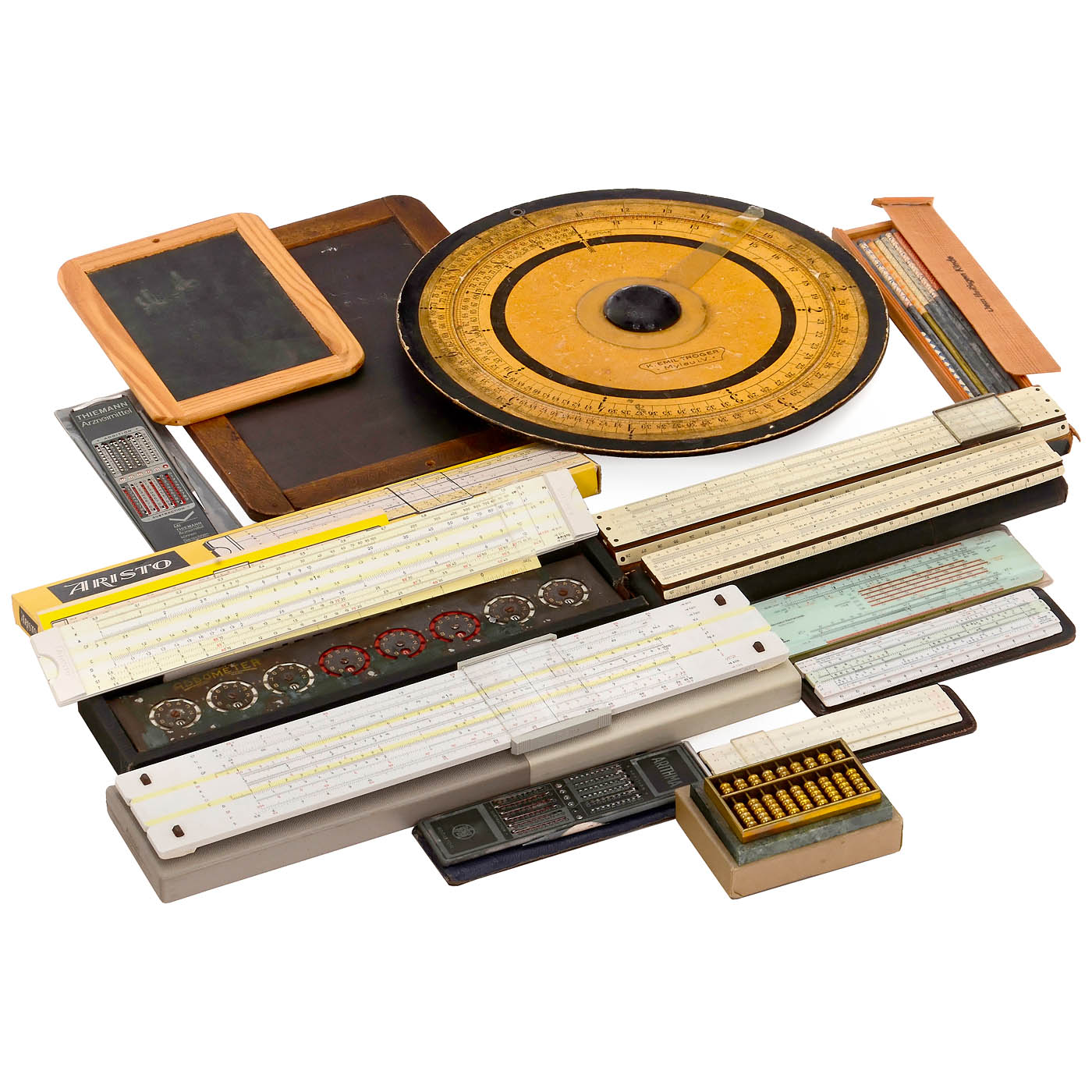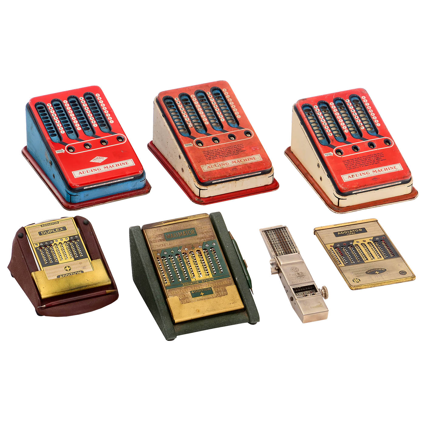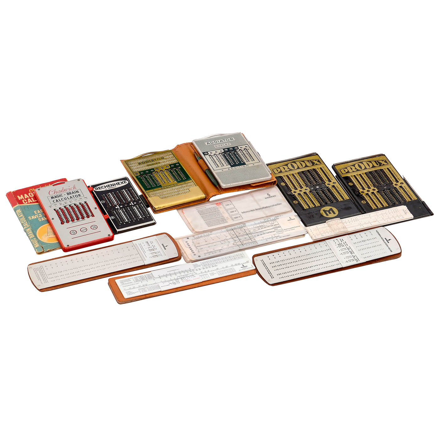 1) "Comptator", 1908. 9-digit chain adder by Schubert & Salzer, invented by Hans Sabielsky, no. 22394. – Literature: Martin, p. 231. – 2) 3 x Volverine Adding Machine, USA, c. 1945, lithographed tin toy calculators. – 3) Calculating disc by Emil Tr?ger, Mylau in Vogtland, ? 11 ? in., pointer not complete. – 4) 2 slate boards with styluses. – 5) 11 slide calculators: "Addiator Supra", "Maximator" with additional memory unit in heavy stand, "Addiator Duplex" in heavy stand, 2 x "Produx", 2 x "Addiator", "Arithma", "Rechenhexe", "Chadwick Magic Brain Calculator" and 1 other model. – 6) Abacus, paperweight, brass on marble base. – 7) 4 slide rules: 2 x Aristo, Nestler and Faber. – And: 8) Addometer, disc adder in box.