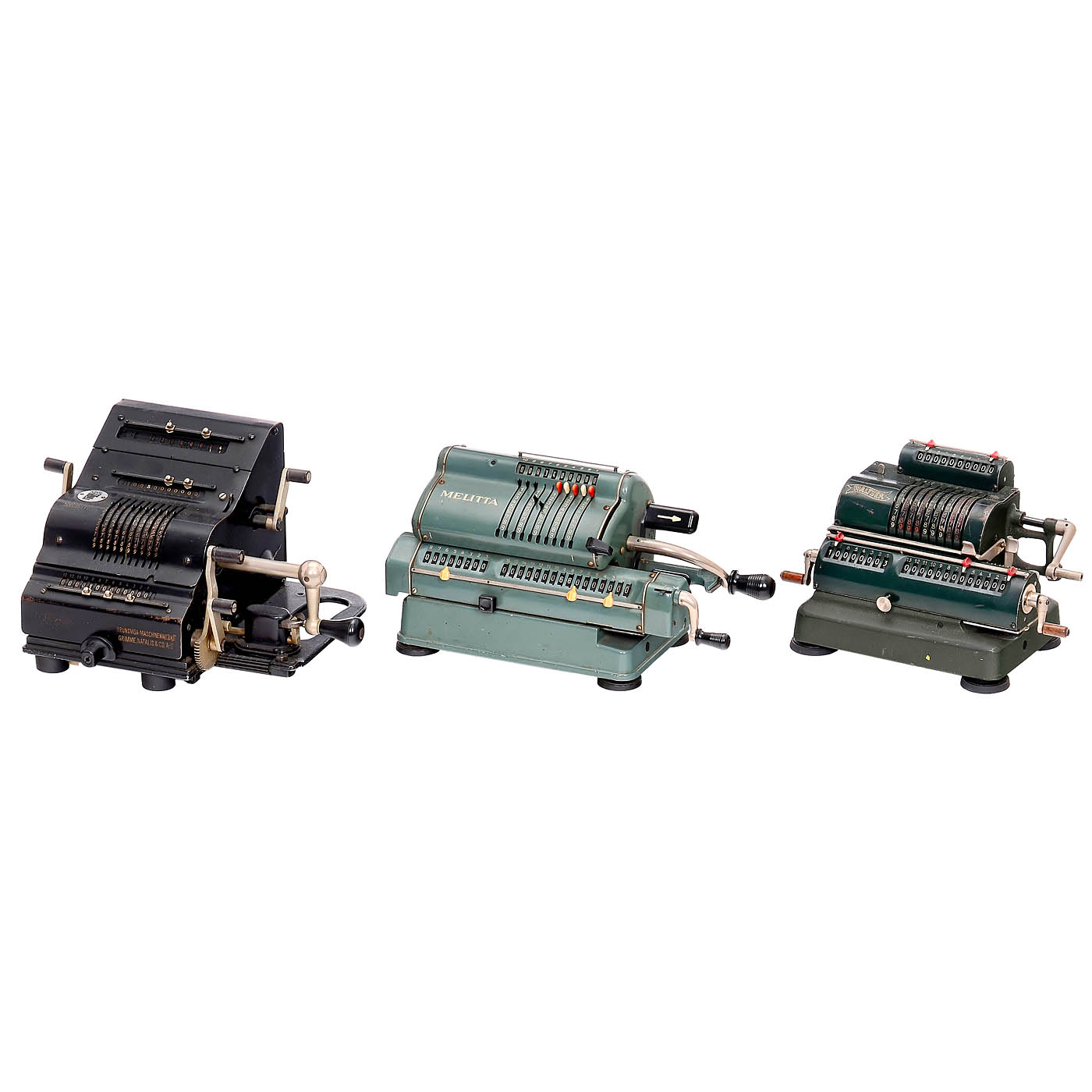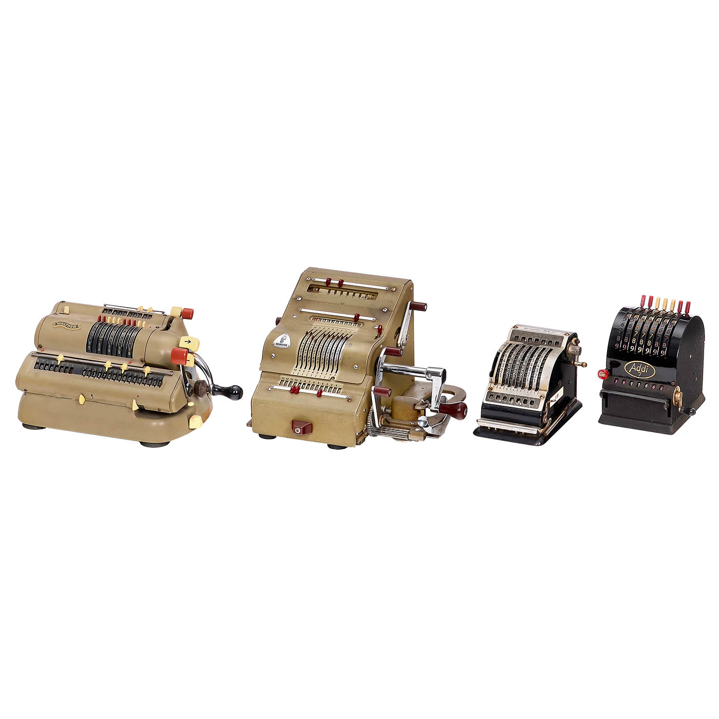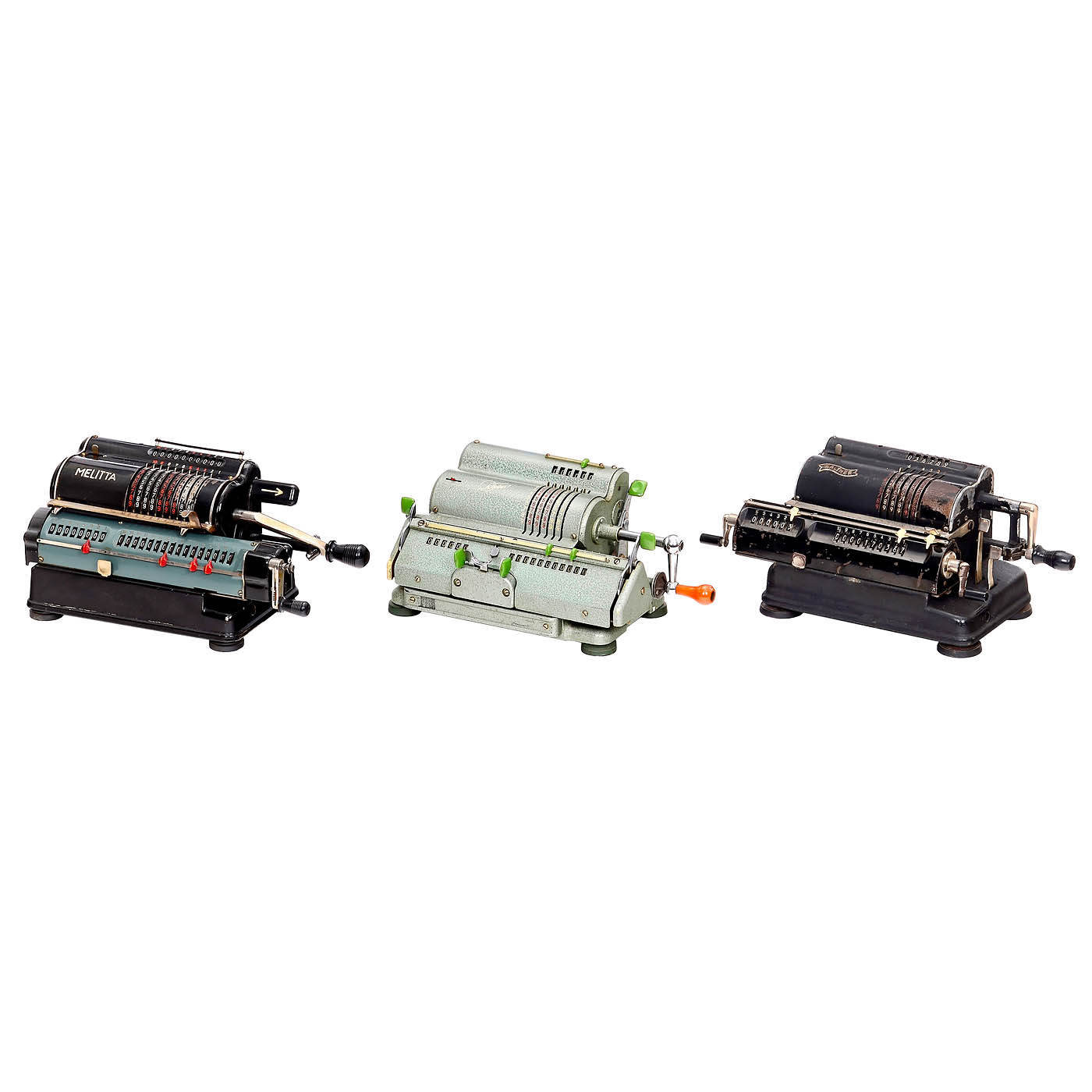 1) Four-species sprocket wheel machines: "Walther WSR 160", "Brunsviga 13 RK", "Melitta VI/16", "Brunsviga 13ZK", "Walther RMKZ", "Original-Odhner 7", "Schubert DRV", "Original-Odhner 227", "Hamann Manus R", "Trinks-Brunsviga", "Hamann Manus", "Walther RKZ 10", "Melitta V/10", "Schubert CW", "Brunsviga 10" and "Thales CER". – And: 2) Adding machines: "Addi 7", 2 x "Resulta BS 7", "Spezial", "Regina B8", "Star Adding Machine" and "Summira 7". – Various conditions.