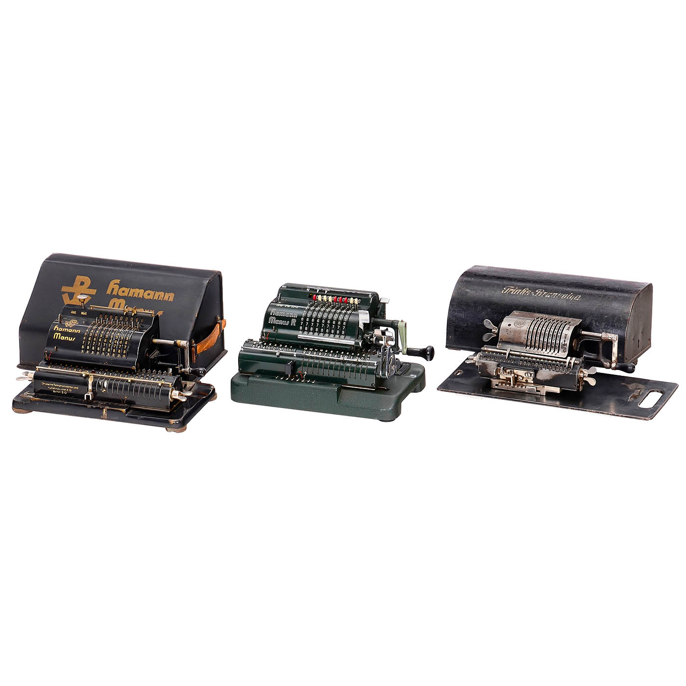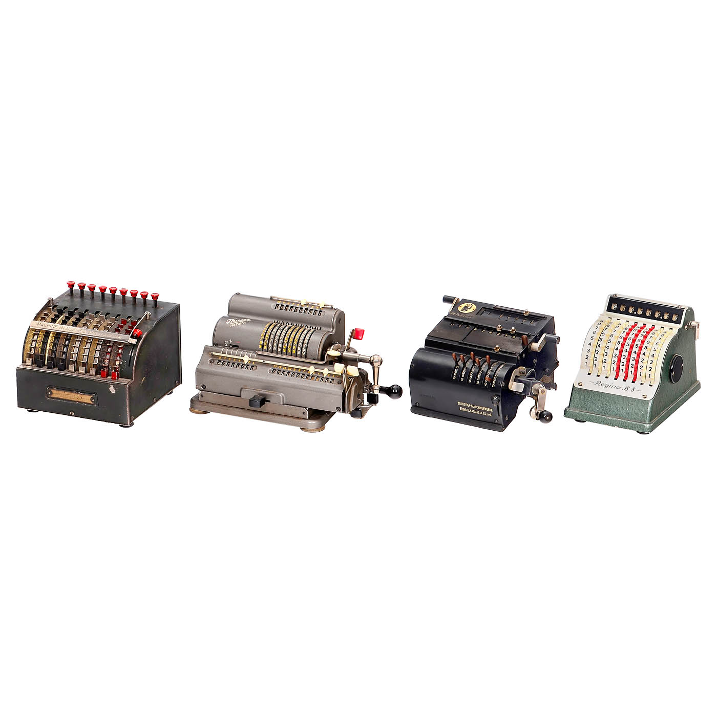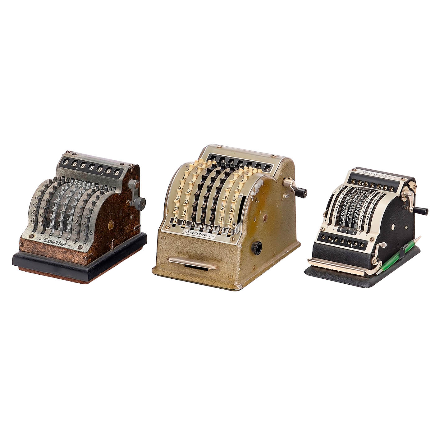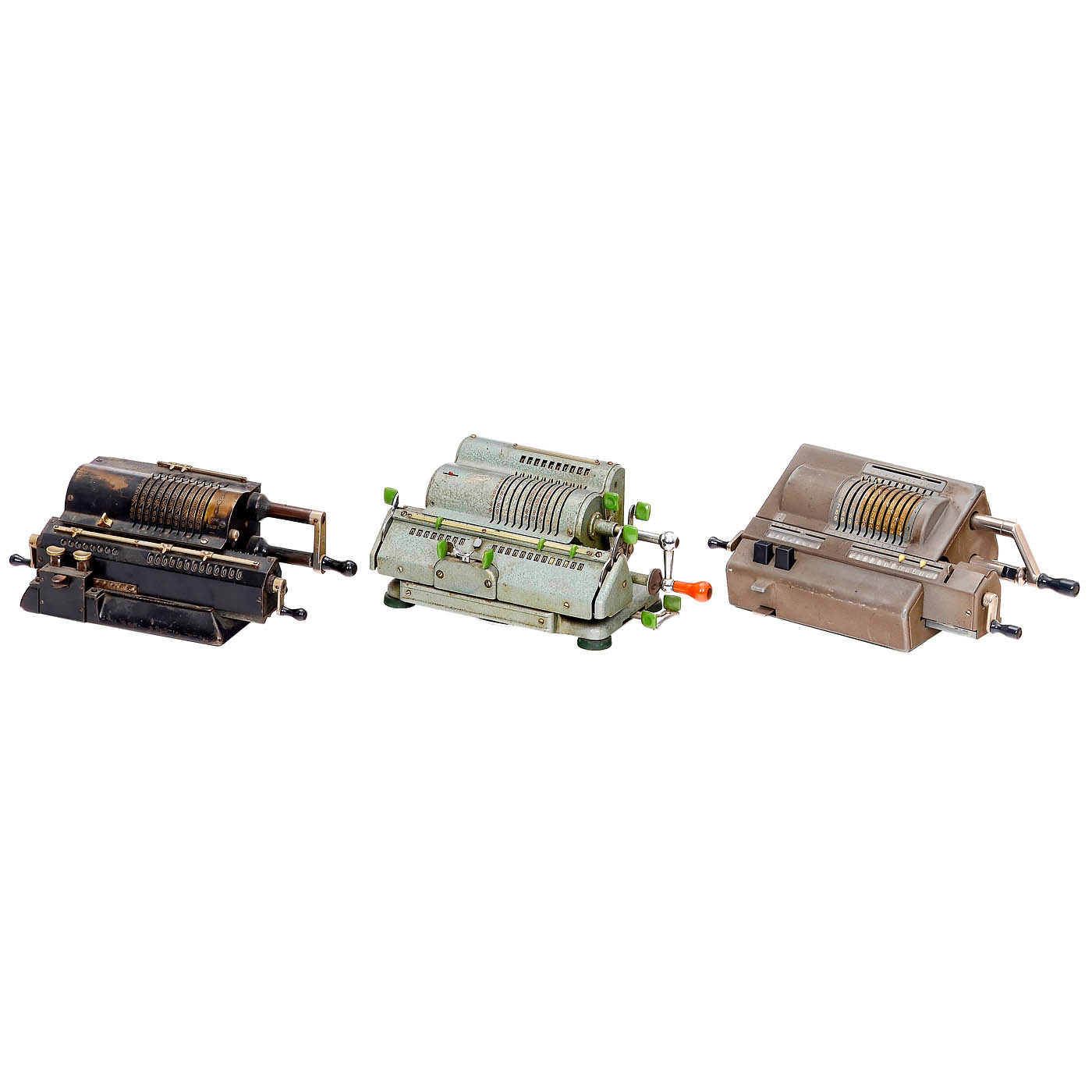 1) Four-species sprocket wheel machines: "Walther WSR 160", "Brunsviga 13 RK", "Melitta VI/16", "Brunsviga 13ZK", "Walther RMKZ", "Original-Odhner 7", "Schubert DRV", "Original-Odhner 227", "Hamann Manus R", "Trinks-Brunsviga", "Hamann Manus", "Walther RKZ 10", "Melitta V/10", "Schubert CW", "Brunsviga 10" and "Thales CER". – And: 2) Adding machines: "Addi 7", 2 x "Resulta BS 7", "Spezial", "Regina B8", "Star Adding Machine" and "Summira 7". – Various conditions.
