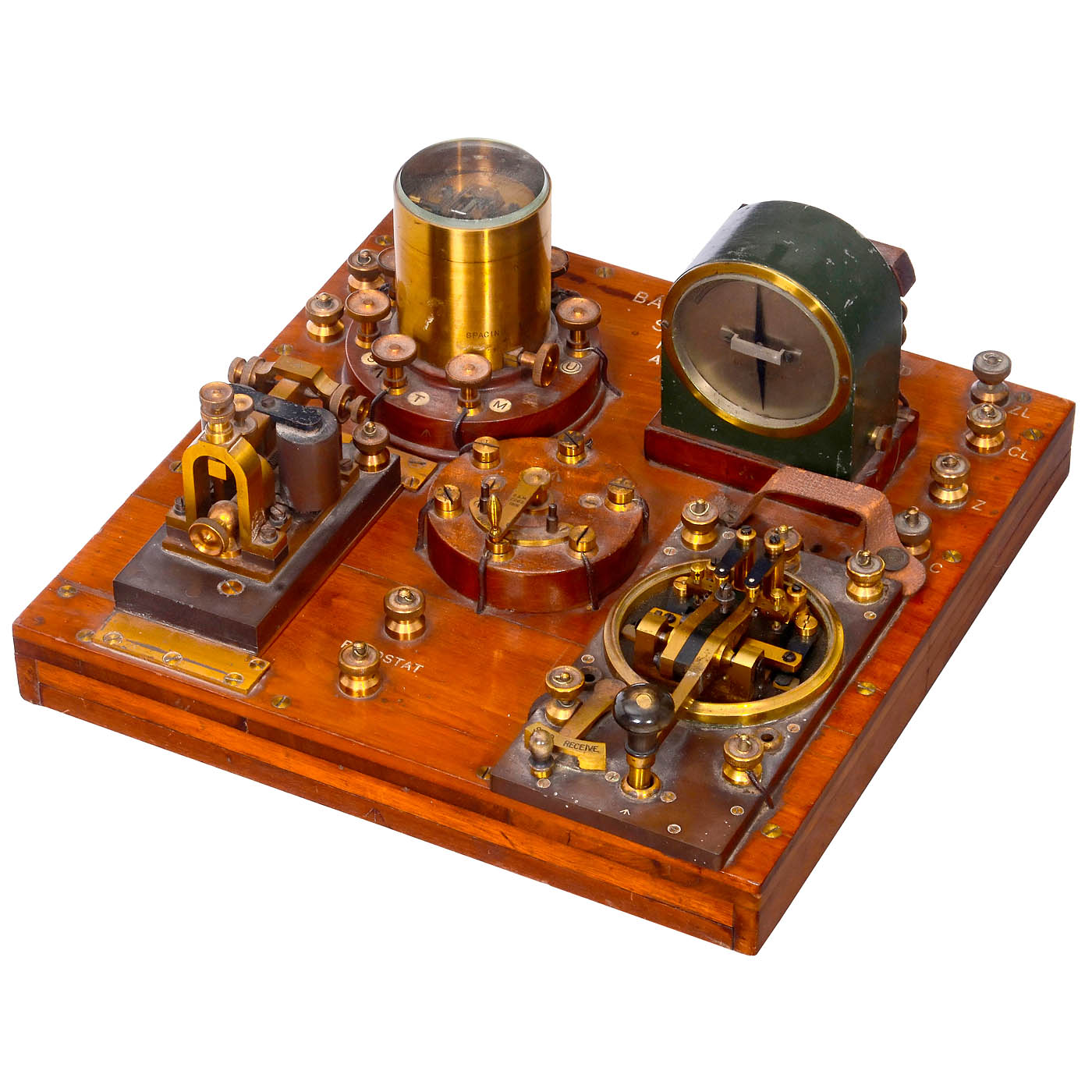 Marked: "Baseboards SX & DX No. 422 A.O.S.", switchable from transmit to receive, mahogany base, with Morse key, sounder, relay and galvanometer, dimensions 15 x 15 in. With additional plug resistance for measurements.