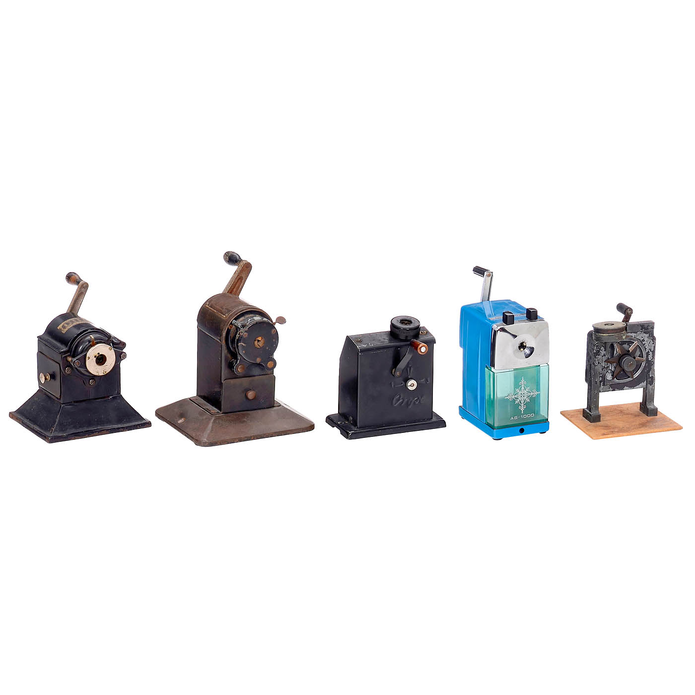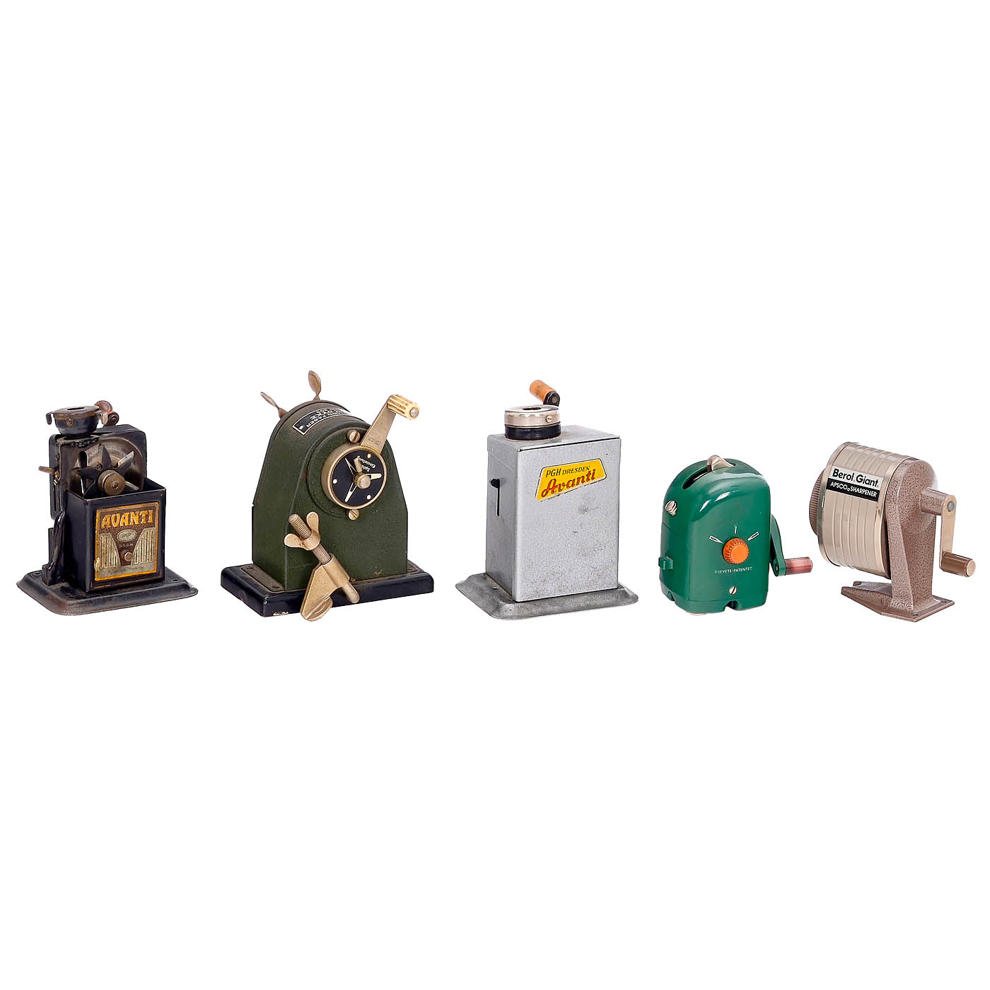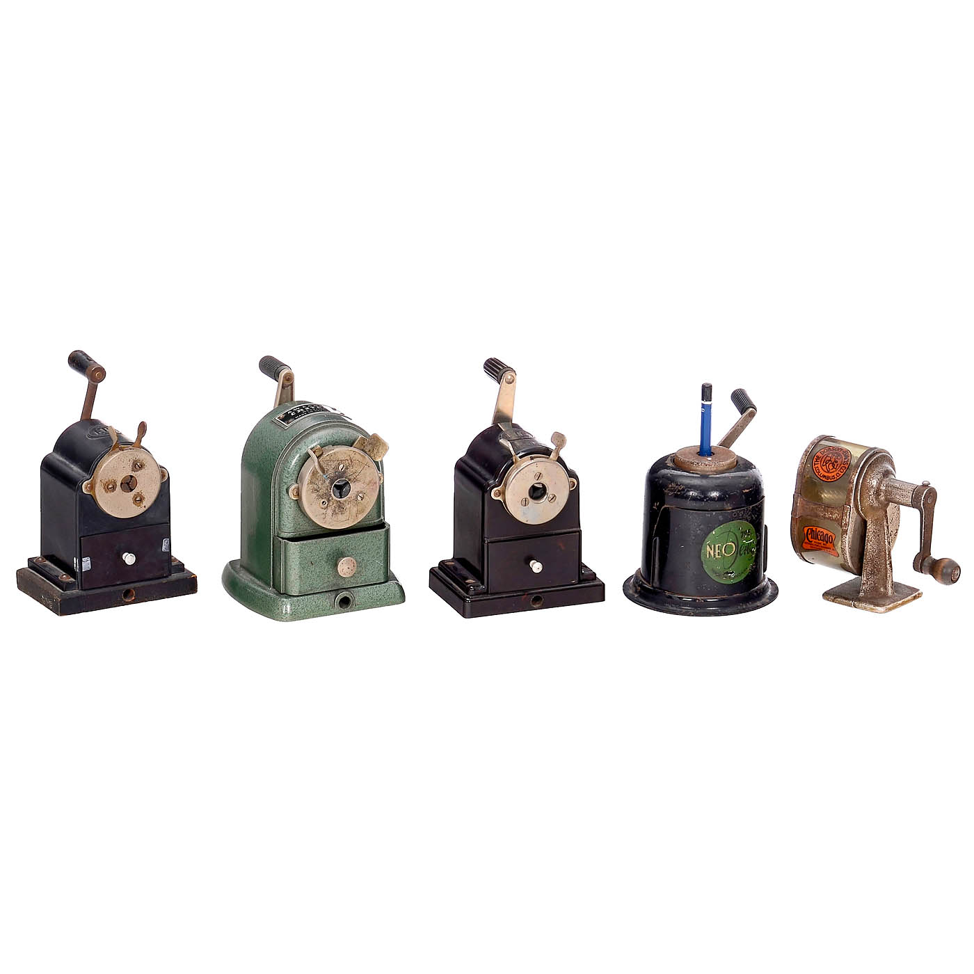 All hand-crank operated: Avanti, c. 1930, patented German pencil sharpener with 6-piece rotating blade; FTE, Model 120, c. 1960, VEB Feintechnik Eisfeld in Thuringia, bakelite; The Super Automatic Pencil Sharpener, c. 1930, British Made, cast metal; Chicago, c. 1930, Automatic Pencil Sharpener Company, USA; Neo Derby, c. 1940, Hungary; Faber Castell No. 52/20, c. 1955, made in Germany; Apsco Sharpener, c. 1965, Berol Gigant, USA; Avanti, c. 1960, PGH, Dresden; Juno, c. 1940, manufacturer unknown, cast metal; AS-1000, c. 1965, Elm Industries, USA, blue plastic casing; Caran d'Ache 459, c. 1955, Switzerland, green plastic casing; 4 additional sharpeners. – In addition: 24 small hand sharpeners, various models.
