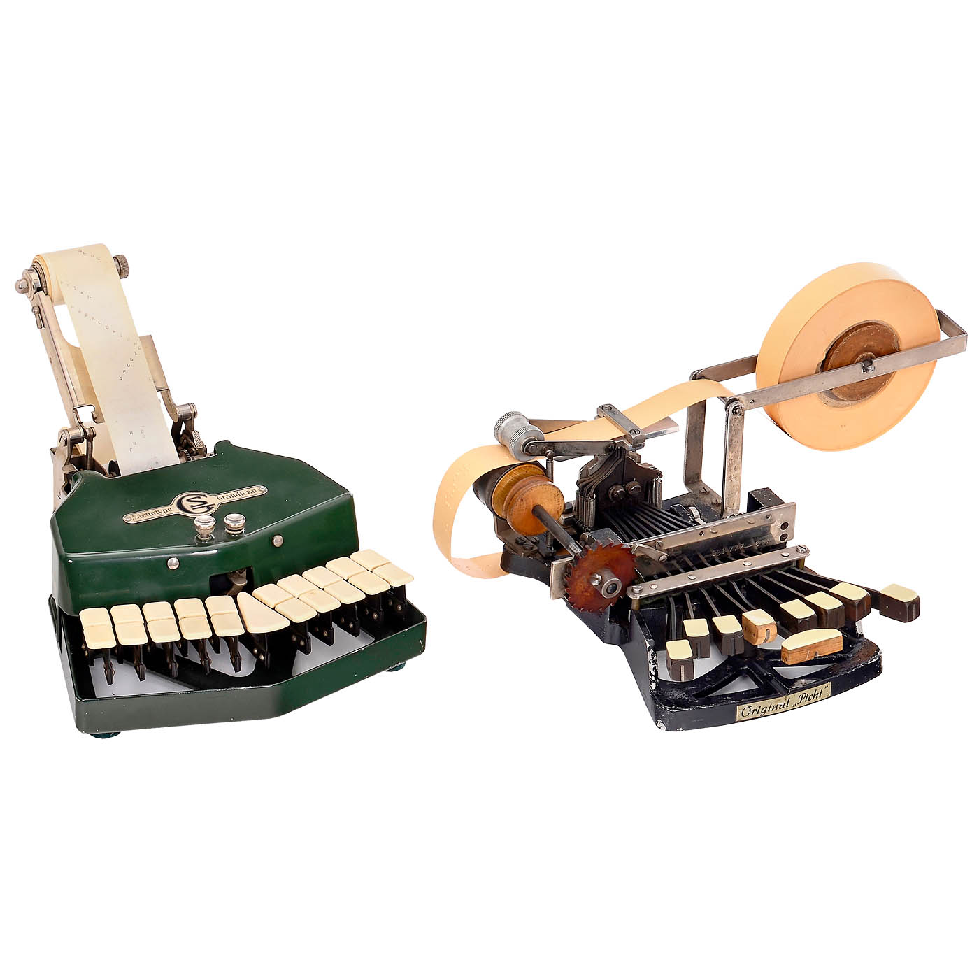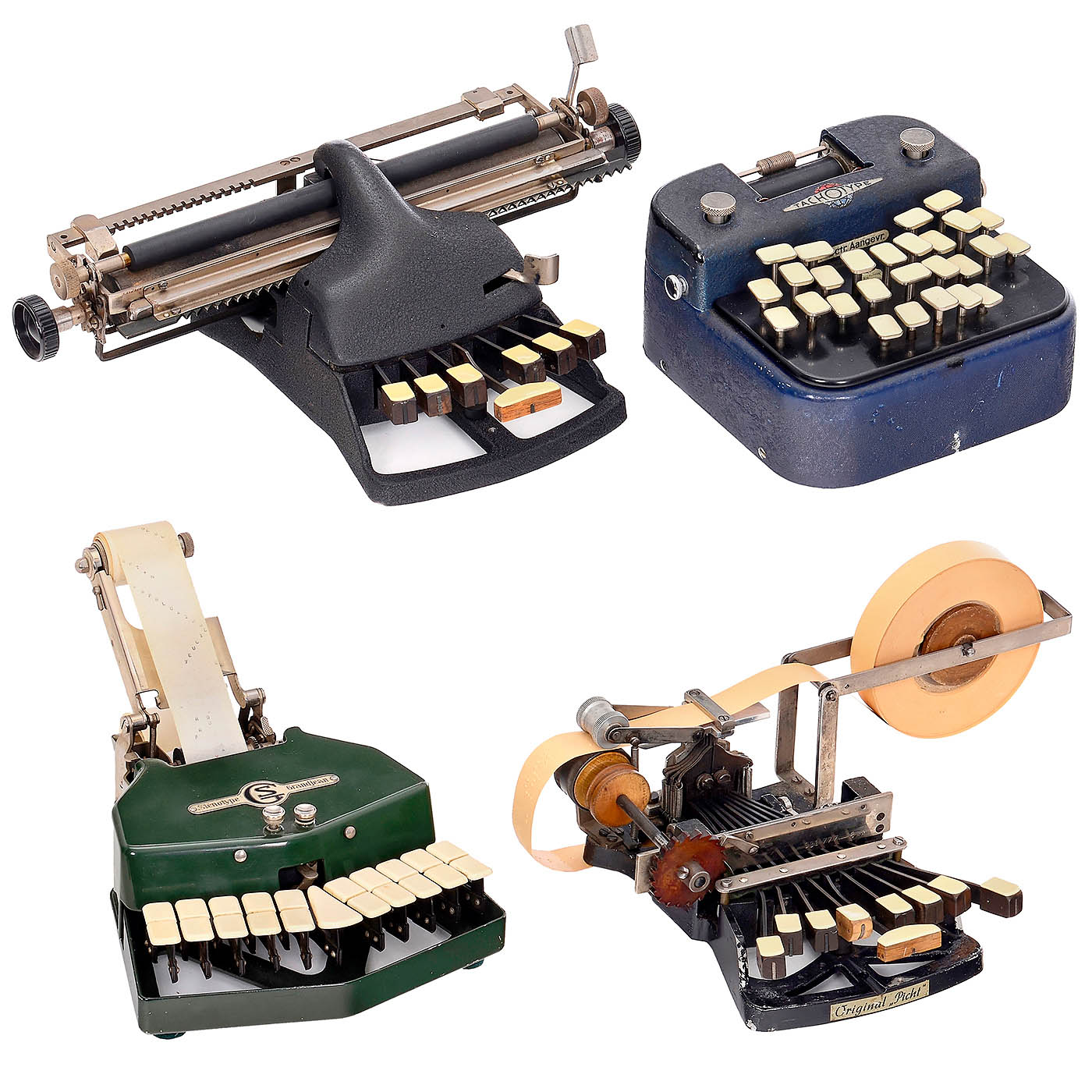 1) Original Picht stenotype machine for the blind, 9 keys, with paper strip. – 2) Stenotype Grandjean, France, no. 10857, green. Two-color ribbon. – 3) Picht-Rekord, c. 1949, Herde & Wendt, Berlin, no. 68738, for Braille script. – And: 4) Tachotype stenography machine, Netherlands, J.S. Velthoen & Zn., Rotterdam. Designer: Marius den Outer, 27 keys, in box.