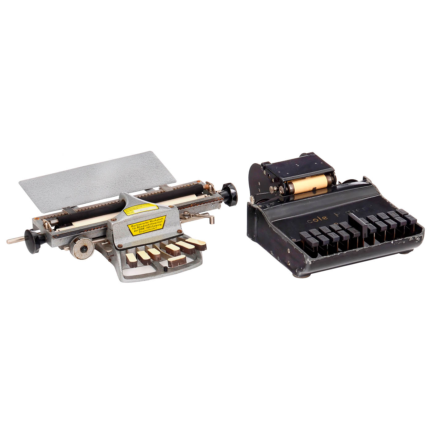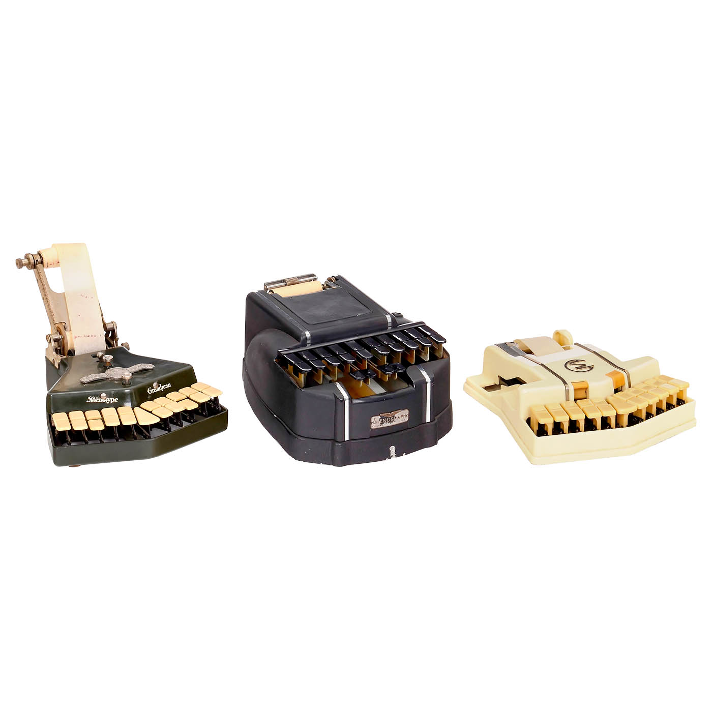 1) "Ecole Pigier", France, c. 1906, no. 2926. – 2) 2 x "Grandjean Stenotype", France, various models, one of them in a case. – 3) "Stenograph", USA, c. 1940, The Hedman Company. – And: 4) Braille typewriter, GDR, c. 1960, Mechanical Workshop for Blind Aids, (Mechanische Werkstatt für Blindenhilfsmittel).