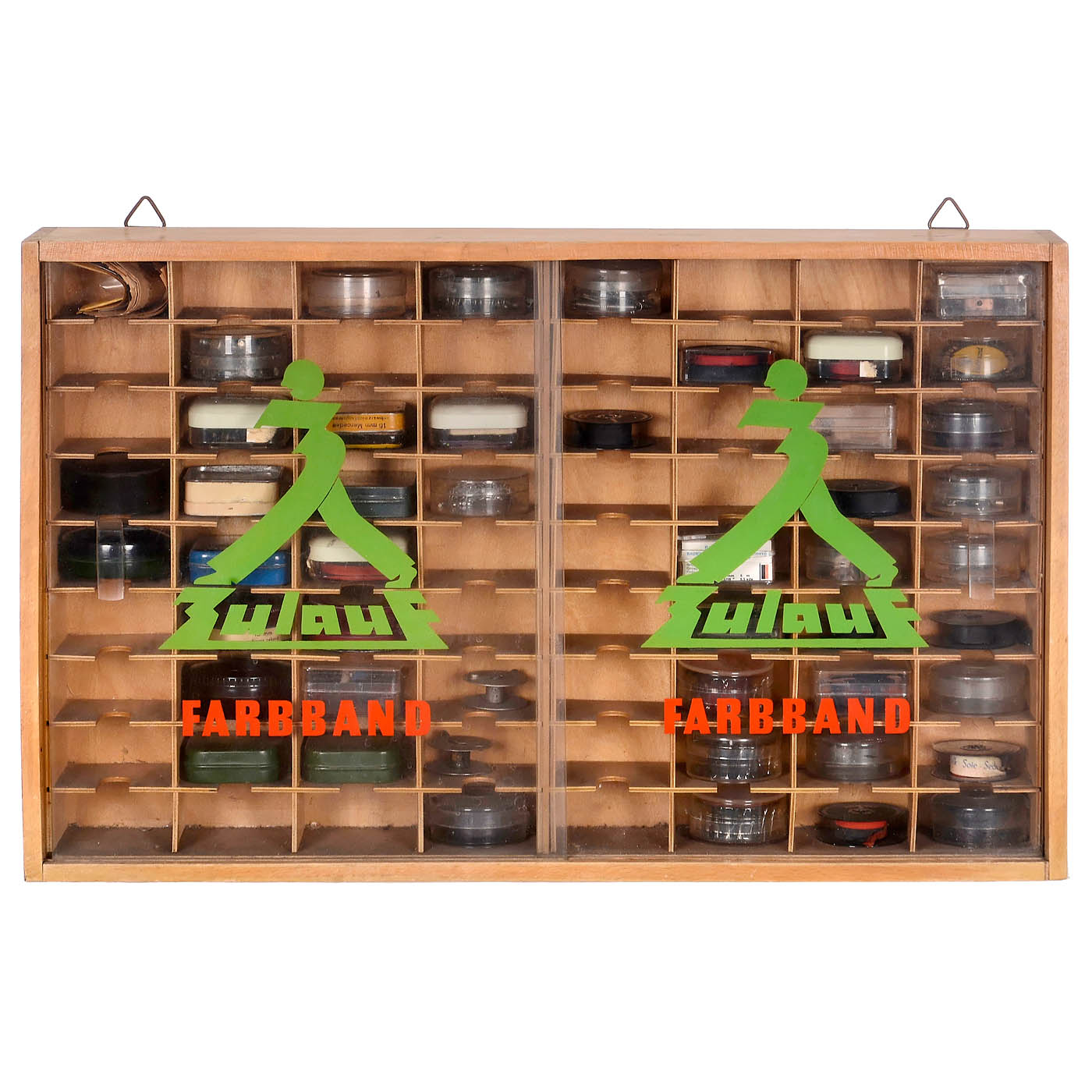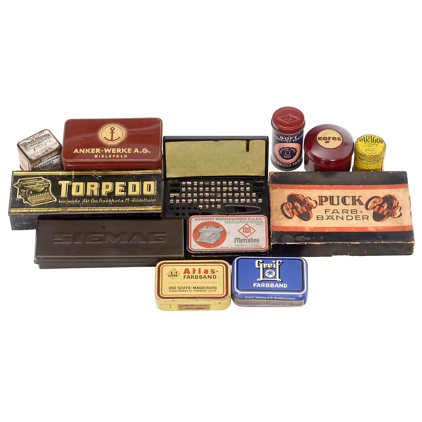 Various brands and manufacturers, lithographed tin, plastic and bakelite, a few with original wrapped typewriter ribbons, In wall cabinet with two sliding glass doors, brand name "Zulauf". – In addition: Underwood Elliott Fisher type set in bakelite box.