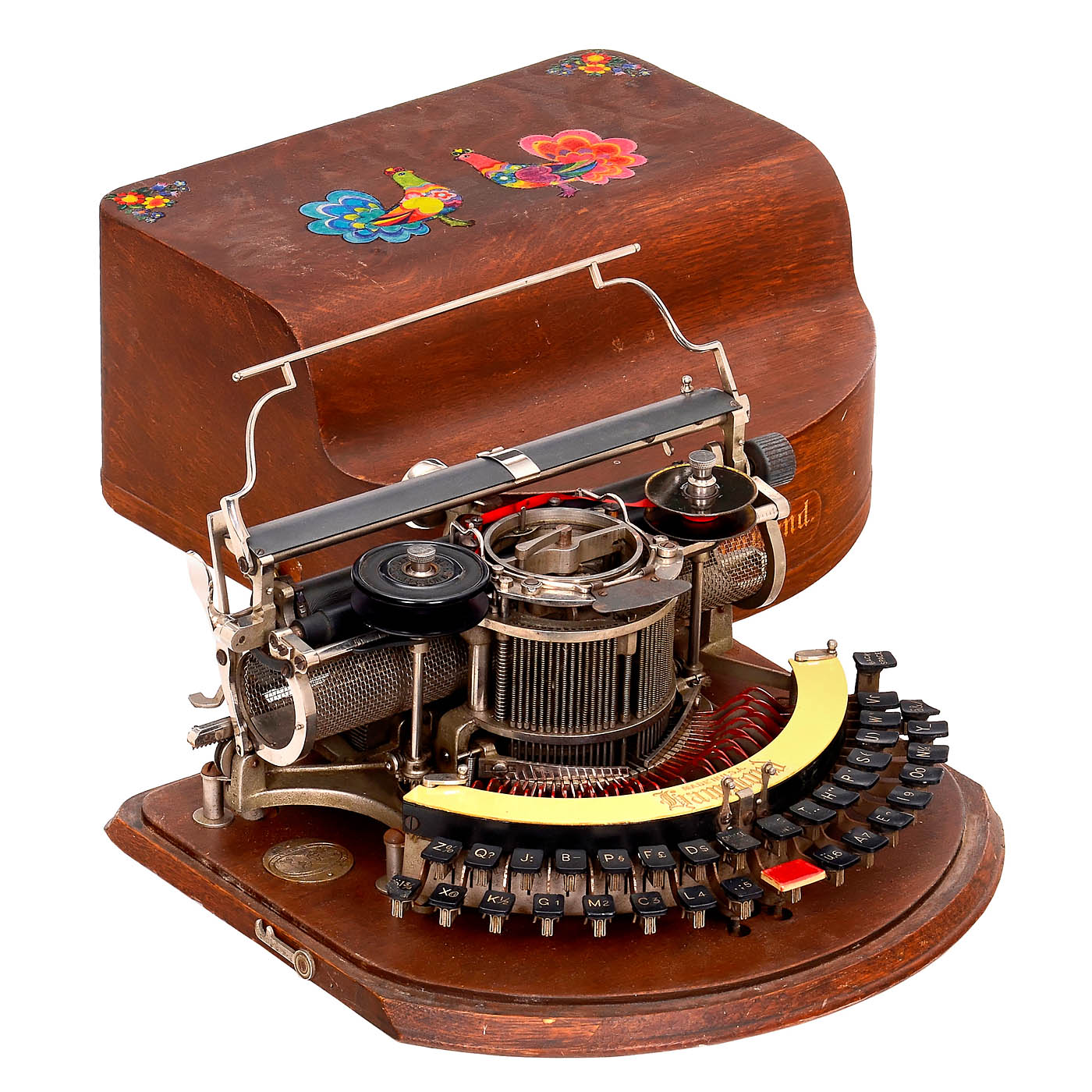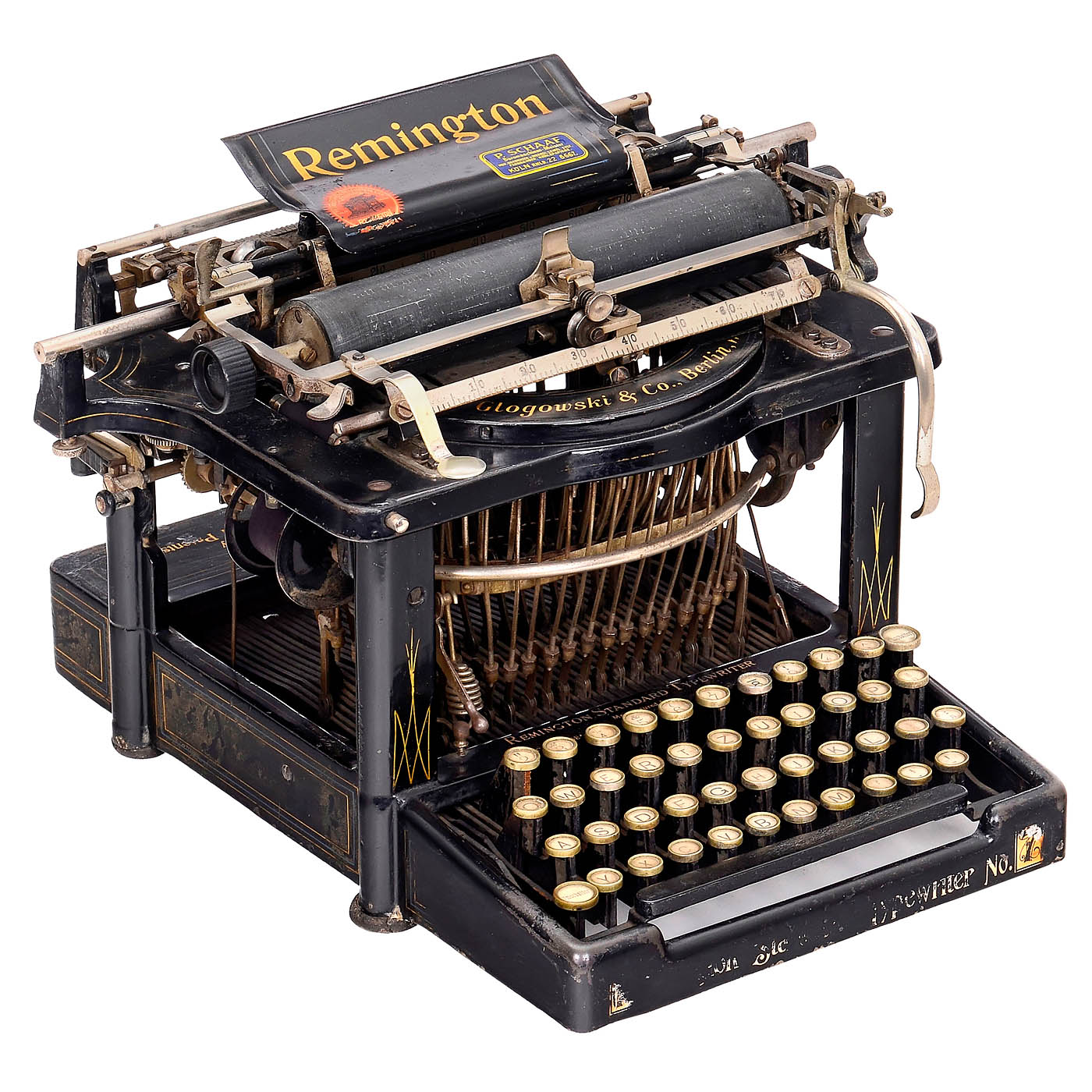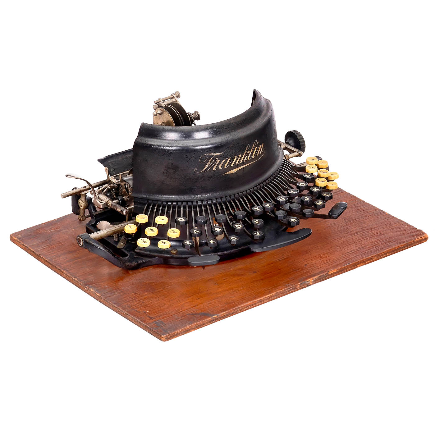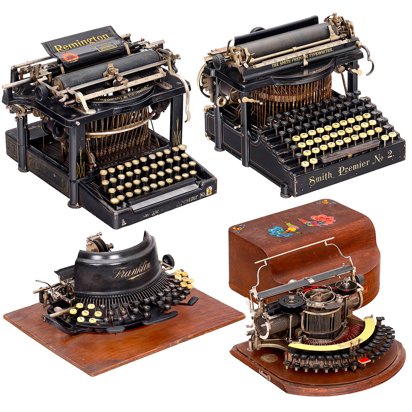 1) "Remington Standard No. 7", c. 1899, serial no. 44927, upstroke machine, with German retailer's label, working. (3/3) – 2) "Smith Premier No. 2", c. 1895, serial no. 1016, upstroke machine, space key defective, otherwise operational. (3/4) – 3) "Hammond No. 2", c. 1905. Typewriter with curved ideal keyboard and rear hammer strike, with oak cover and base, no. 60532, fine-mesh paper drum, with backspace key, two broken keycaps, various other defects. (3/4-) – And: 4) Franklin No. 7, 1901, serial no. 13893, type IVb, rare example of the decorative American frontstroke typewriter with round Ideal keyboard, 40 keys in three rows, "Franklin" in script on the shield, ribbon spools above the carriage, working condition. – Literature: Martin, 1949, p. 95. (4/3)