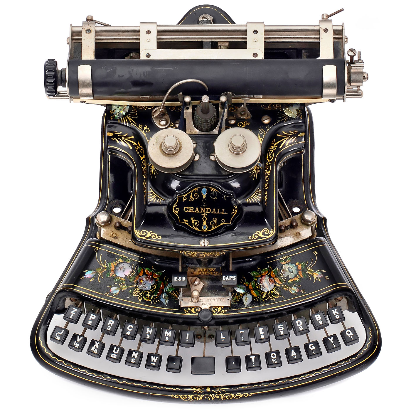 The Crandall Type Writer Co., Syracuse, N.Y. Serial no. 6467, with vertical type sleeve and curved two-row keyboard, one of the most attractive typewriters with its mother-of-pearl and gilt decoration, platen rubber torn, type sleeve does not turn, very good original optical condition. – A superb pioneer of office communication, collector's item and museum piece. – In addition: book: "American Typewriters" by Paul Lippman.