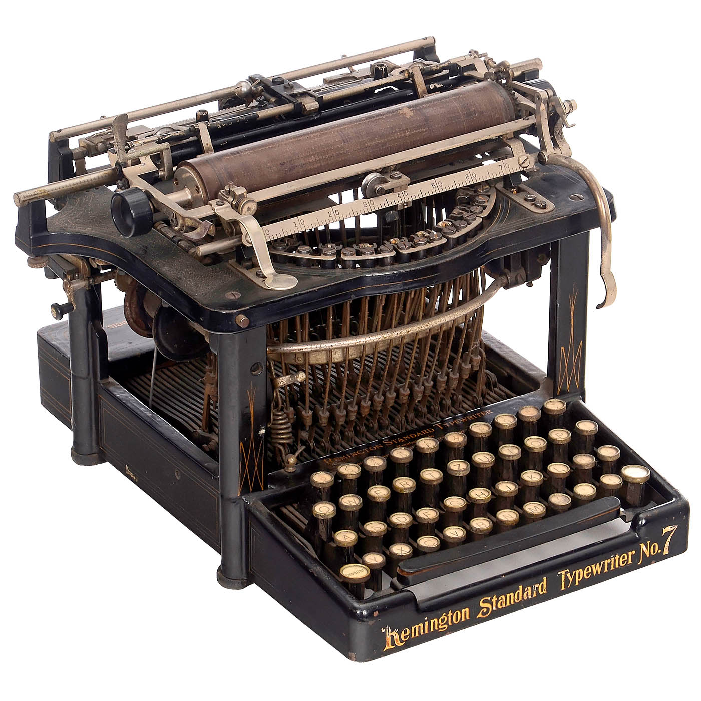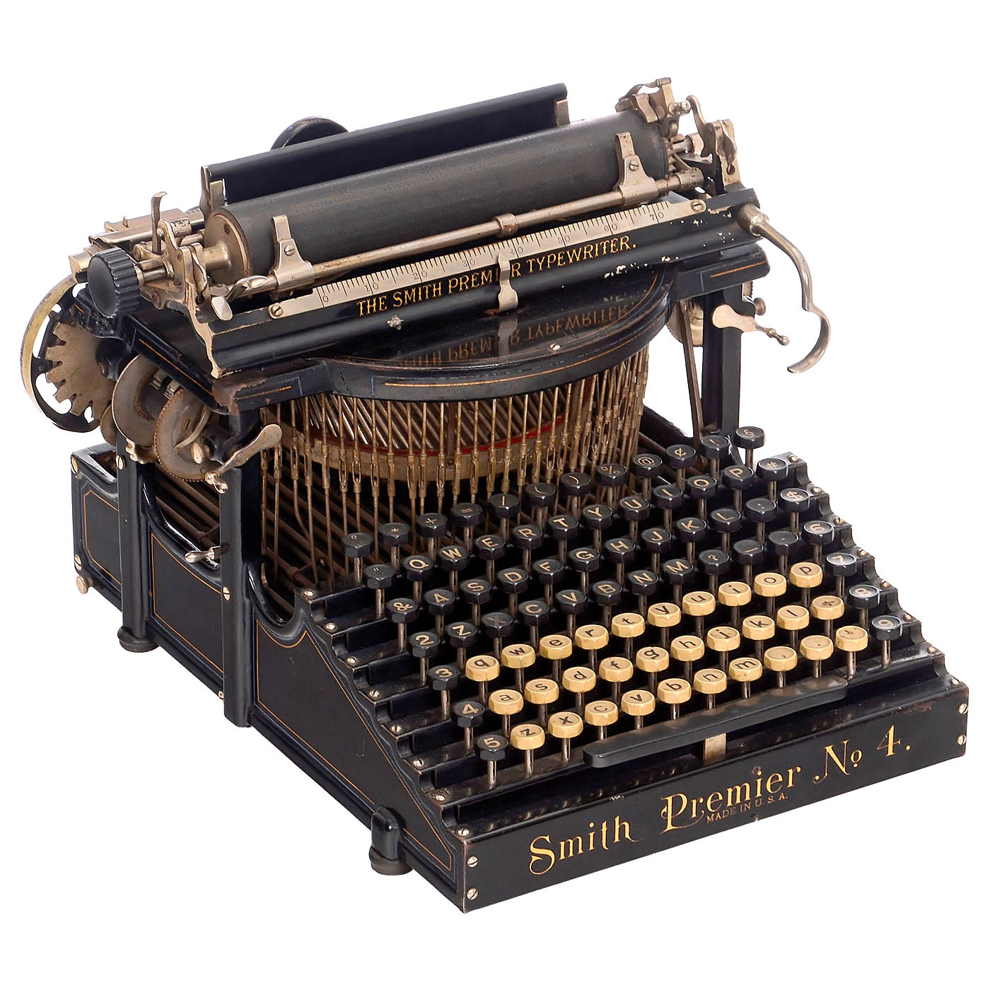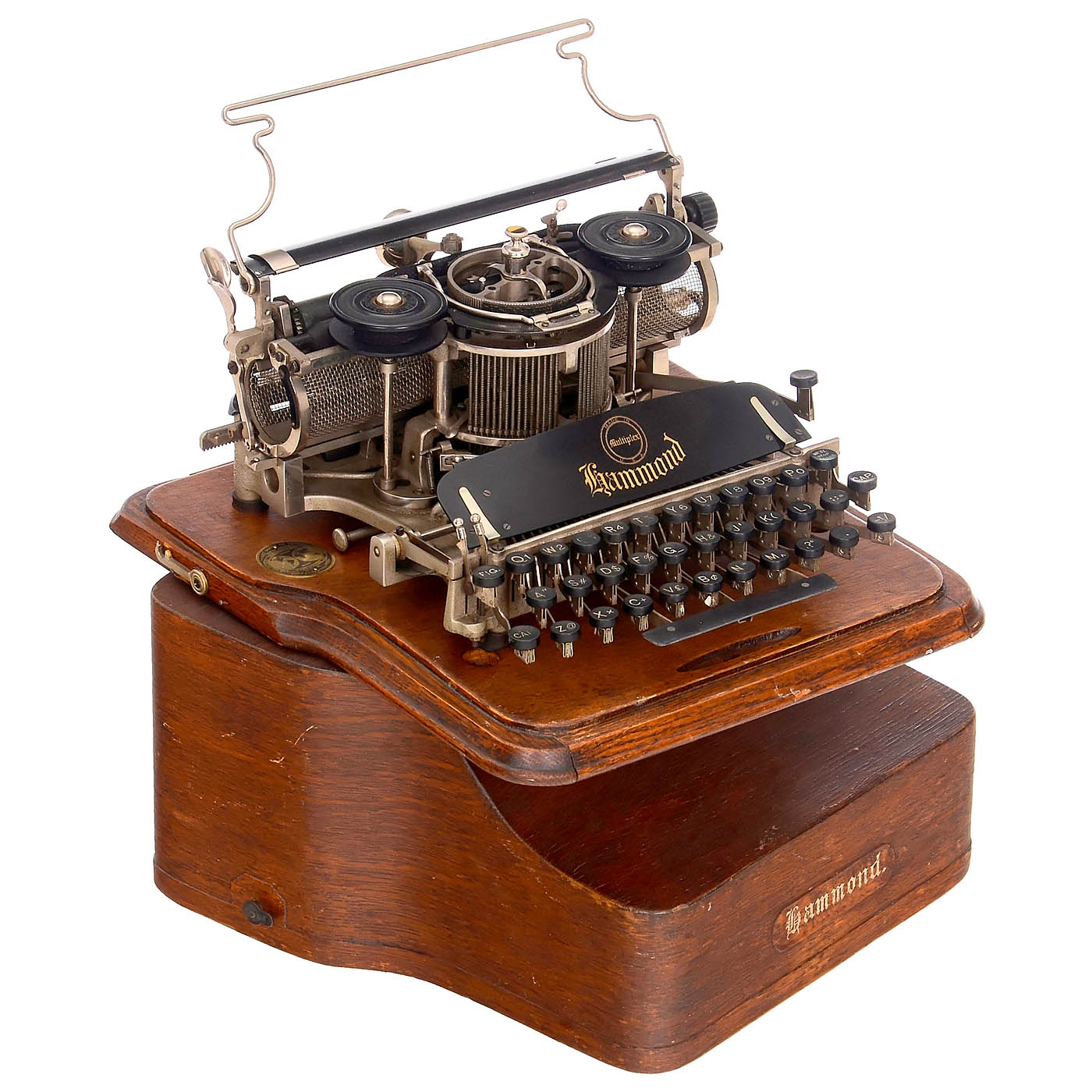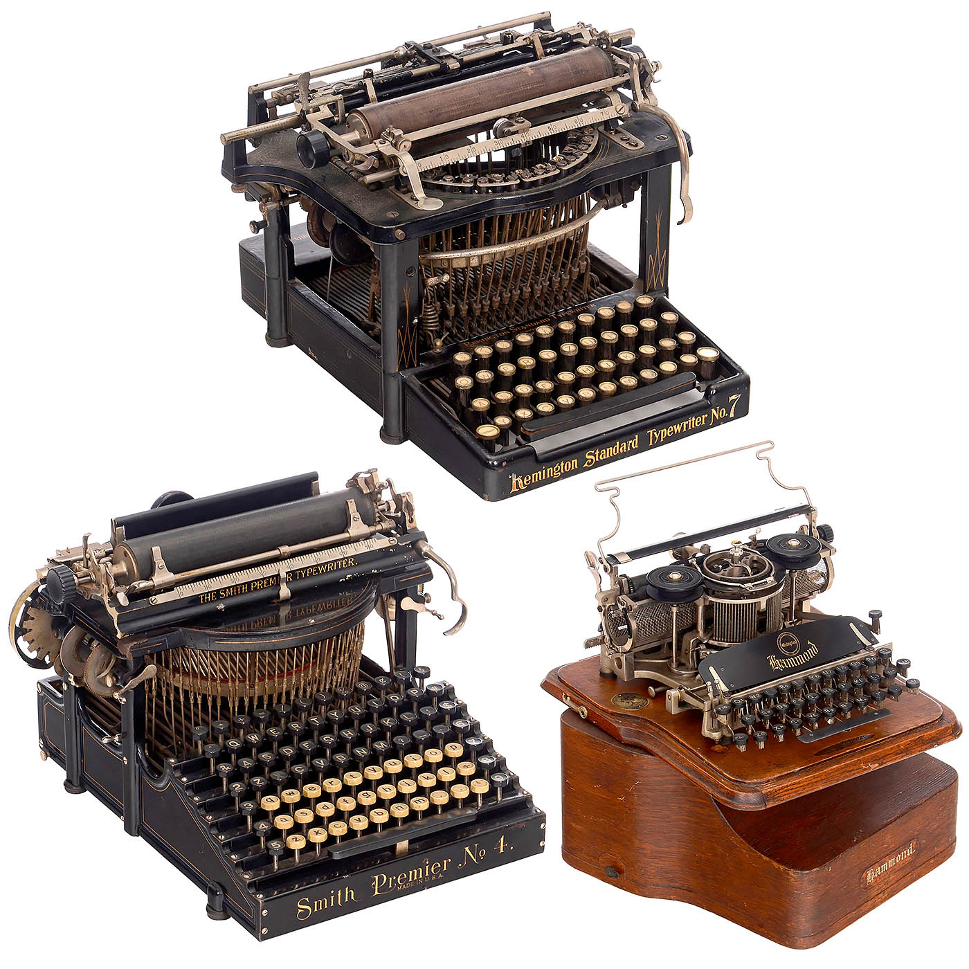 1) "Remington Standard No. 7", c. 1904, serial no. 148160, upstroke machine, working. (3/3) – 2) "Smith Premier No. 4", c. 1903, serial no. 51780, upstroke machine, carriage movement somewhat defective, otherwise working. (3/3–4) – And: 3) "Hammond Multiplex", 1913, serial no. 150851, open version, American type-sleeve machine with straight universal keyboard, oak lid and base. – Literature: Martin, 1949, p. 82. (3/3)