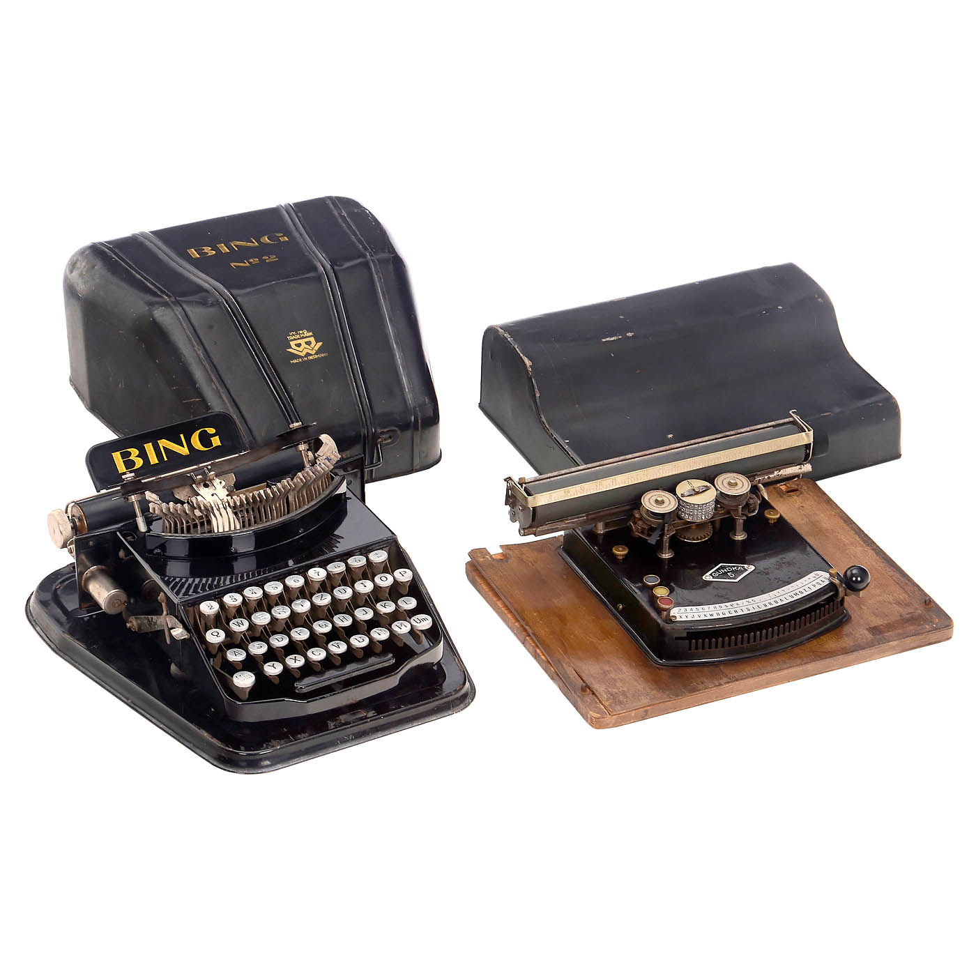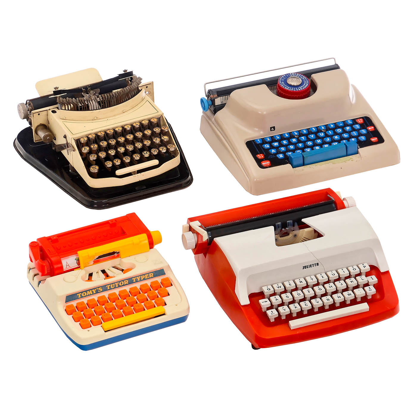 1) "Gundka Mod. 5", 1924 onwards, German typewheel machine, with tin cover, no. 60354. – 2) "Frolio 7", c. 1925, Gundka-Werk, index typewheel machine, made for the Italian market, no. 76934. – 3) Bing No. 2, c. 1930, model with ink ribbon, on tin base with cover. – 4) Bing, Nuremberg, rare white version, French keyboard. – 5) Standard typewriter, c. 1970, Tipp & Co, Germany, lithographed tin. – 6) Berwin Gold, USA, 1950s, lithographed tin. – And: 7) 4 different models with plastic cases: "Imperial", "Julietta" (with crack), "Mettey" and "Tomy's Tutor Typer".