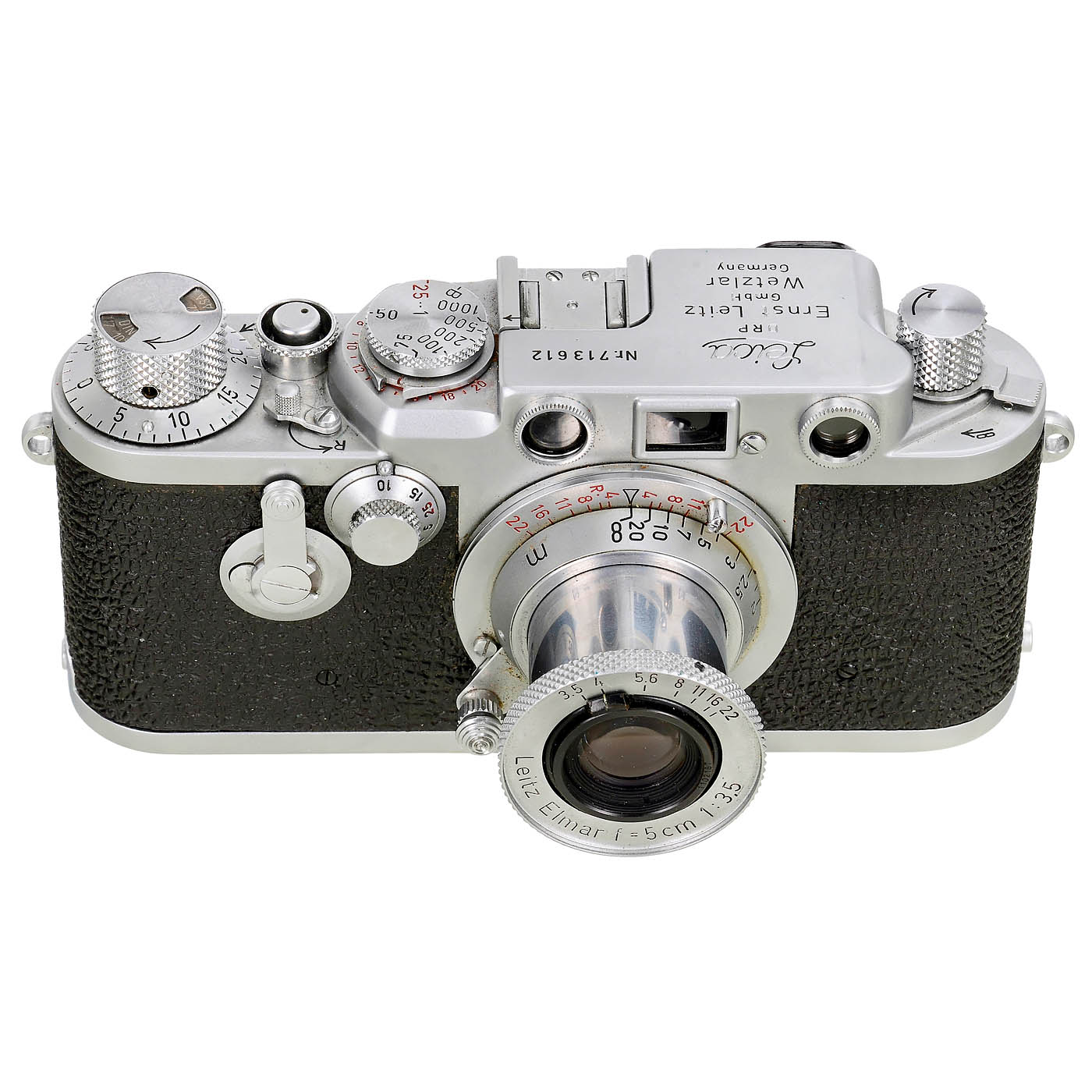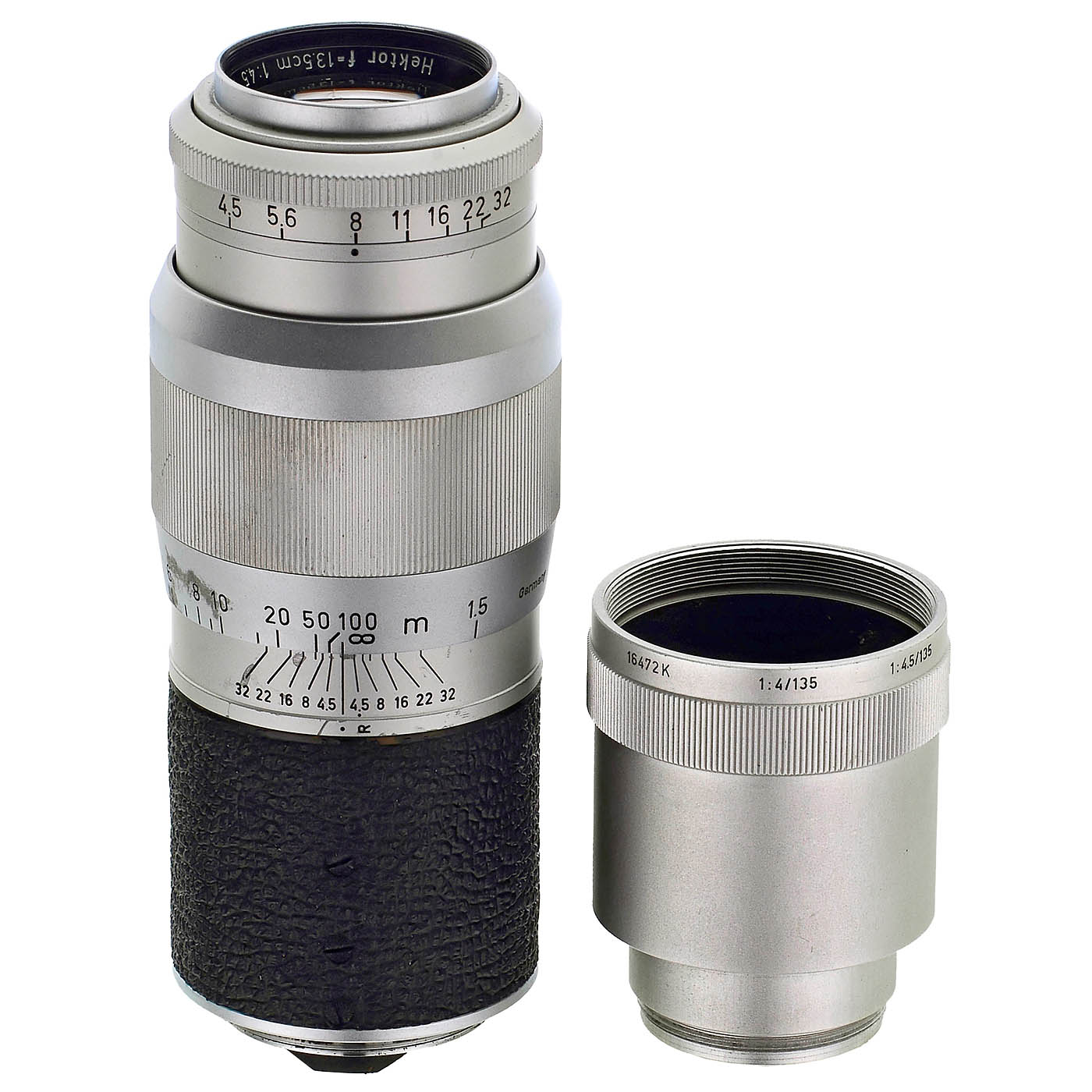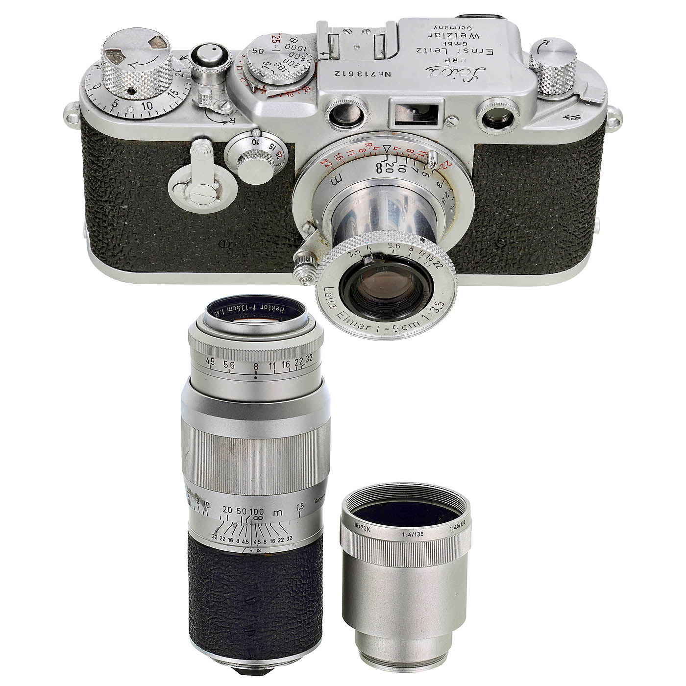 Leitz, Wetzlar. 1) Leica IIIf no. 713612, red contact numbers, self-timer working. Rangefinder is accurate, second curtain shutter lags, with Elmar 3.5/5 cm no. 1102167, with case. Very well preserved, a beautiful collector's item. (2/3) – And: 2) Hektor 4.5/13.5 cm no. 1130990, never cleaned of age deposits since its initial purchase; the distinctive age rings (long-term problems with Leitz's own glass melts, see auction September 2025 lot 144) in faint concentric circles even reveal the cleaning marks from before coating. With case and extension ring 16472K. (2-/3-)