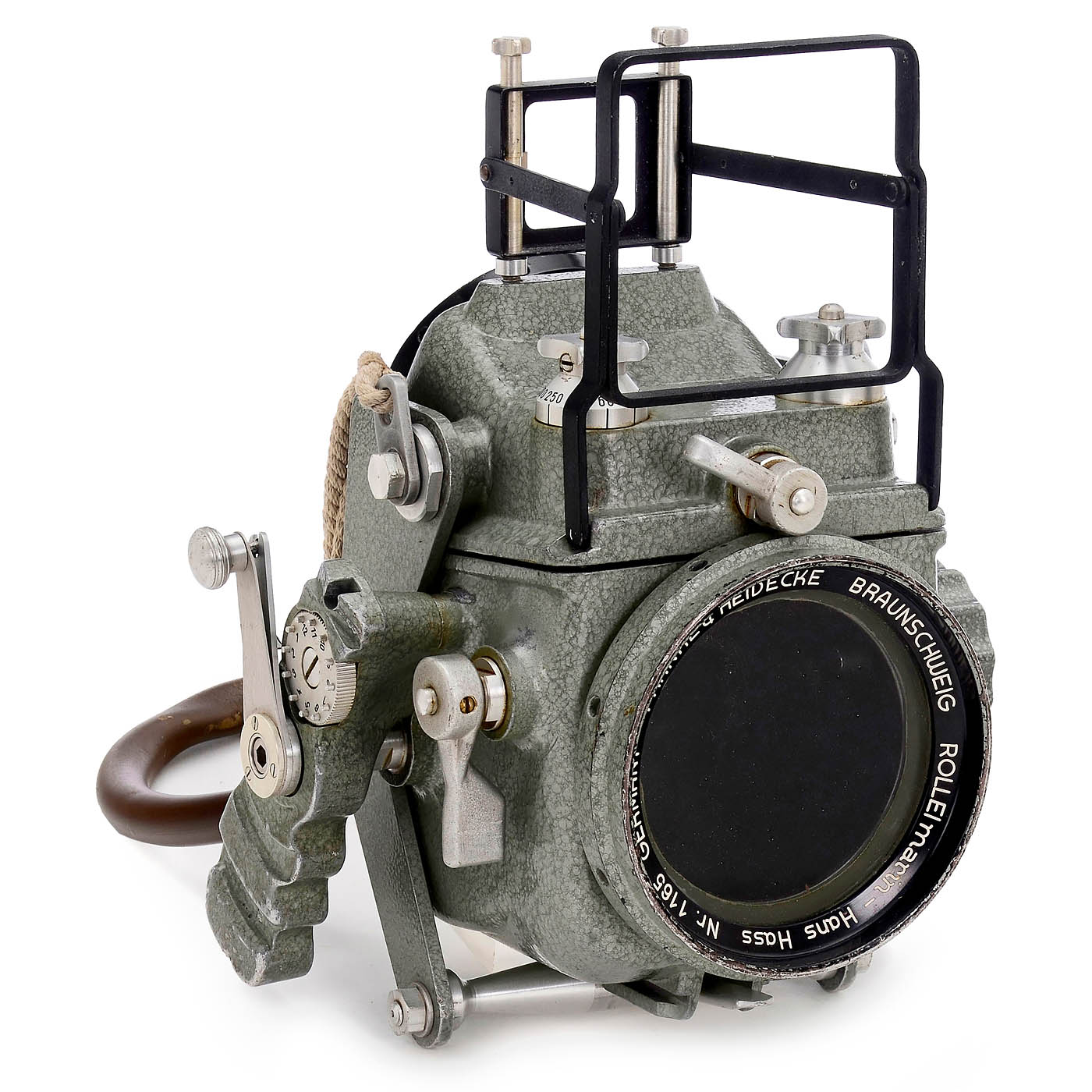 Franke & Heidecke, Braunschweig. Rolleimarin Hans Hass no. 1165, for Rolleiflex 3.5 C 1740000–1868999, opened, with German instructions, spare parts lists (copies for Rolleimarin III and IV), the important coupling piece 3 with bayonet size II, 4 Rollei spare parts bags with 13 original sealing rings, spare front glass, Rolleimarin 1 and 2, and small accessories. Thanks to good lubrication (as recommended in the instructions), preserved without signs of corrosion, mechanism functions, but not tested for leaks in the local river Rhine.
