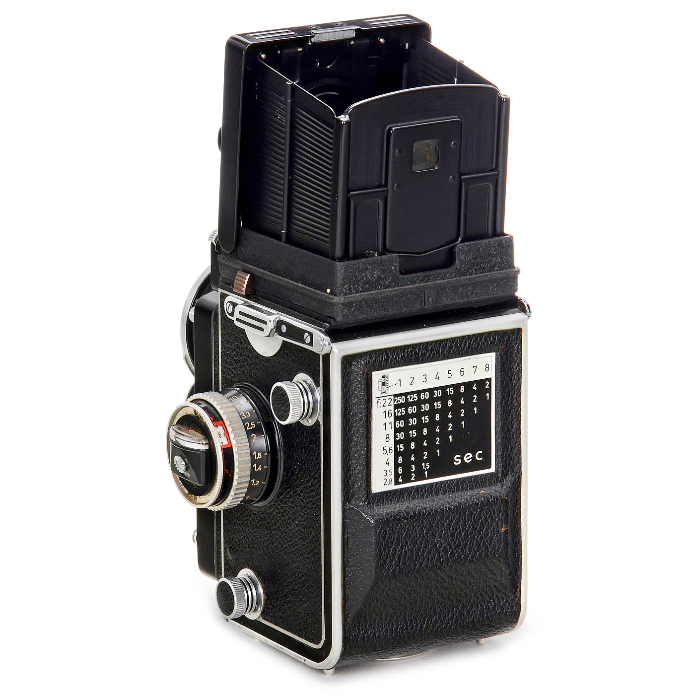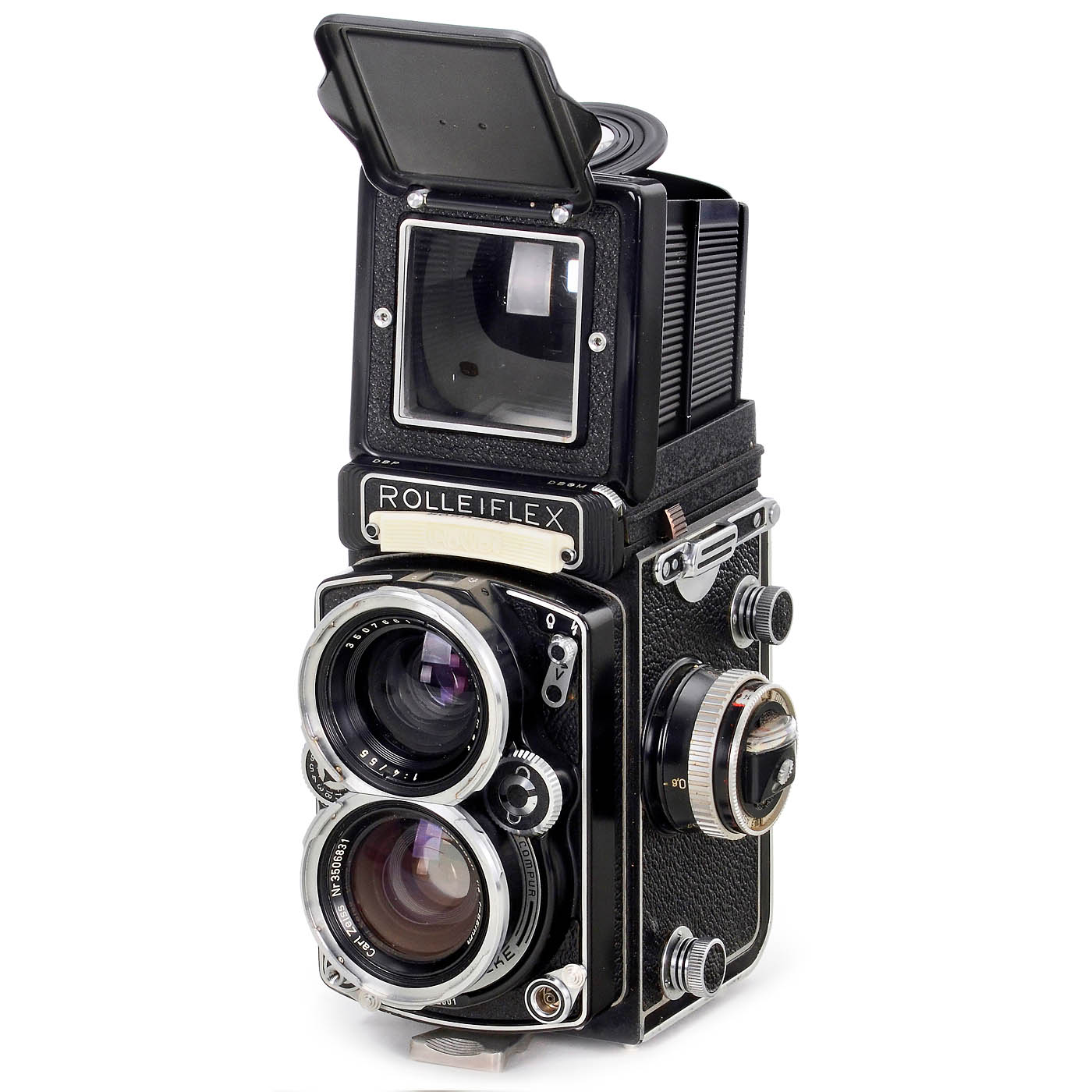 Franke & Heidecke, Braunschweig. No. W 2492801, with plane plate, Zeiss Distagon 4/55 mm, no. 3506831, lens clean under point light, Synchro-Compur 1–1/500 sec. and stop/speed wheels working well, exposure meter working, signs of use on the film transport wheel otherwise in good condition. Sought-after user camera with early production number. With diffusor, cap and case. One of the most wanted TLR cameras!