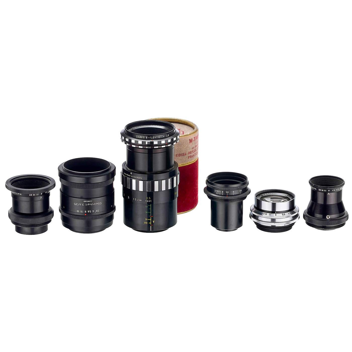 All lenses with iris diaphragm, all good under point light. 1) Japan. Optical-bench camera with all adjustments, 17 cm long, for T2 mount, no signs of use, M42 front, Nikon adapter on the back. Ideal for digital cameras! (2-/2) – 2) Steinheil 3.5/35 mm, no. 2396588, lens head for macro in M42, with integrated reversing ring as a lens hood. Unknown macro lens! (3/3) – 3) Schacht, Ulm, Germany. M-Travenar 2,8/50 mm R, Macro tube with screwable lens heads, for M42, with velvet box and caps. (3/3) – 4–7) Macro lens heads in M42 for the Schacht system: Steinheil Macro-Cassarit 3.5/50 mm; Meyer, G?rlitz Helioplan 4.5/55 mm and 4.5/75 mm, well suited for UV photography as the lens parts are without cementing, and Zeiss Jena Tessar 2.8/50 mm. (3/3) – And: 8) Schneider Xenar 4.5/135 mm lens head in M42. (2-/3)