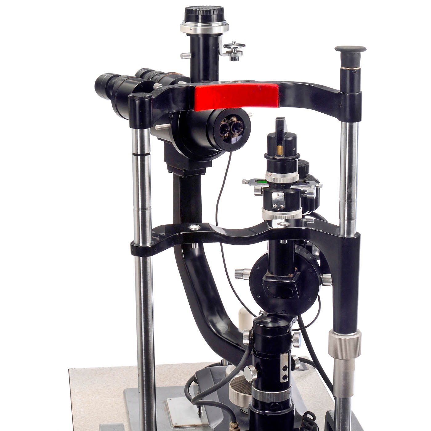 Nippon Kogaku K.K., Japan. Tabletop device, its electro-hydraulic Nikon base no. 53522 for raising and lowering is functional (at 220 V). The black lacquered ophthalmic examination device rests on a table with the serial no. 38626 (one corner of the table edge is missing its edge banding) and consists of a height-adjustable headrest with two knobs which the patient can hold in both hands. In front of this are two rotating arms, one above the other. The lower arm, serial no. 39499, is for the Nikon 7x–25x stereo zoom lens with the corresponding Nikon stereo binocular eyepieces. The upper arm, serial no. 65307, is for the beam splitter slot for collimating the image into the eye, with flash unit serial no. 54272 (untested). The zoom lens has two closely spaced ports, meaning that due to the limited space, only either the Nikon camera adapter or the microscope adapter can be mounted. Included are the Electronic Flash Device Power Unit Module MS-2 no. 55139 and an accessory box for small parts. Shipping is only available via freight carrier (camera for demonstration only). Optical components in clean condition. This beautifully designed device, with its extensive range of adjustment options, likely intended for a university eye clinic, is considerably rarer than any Nikon fundus camera.