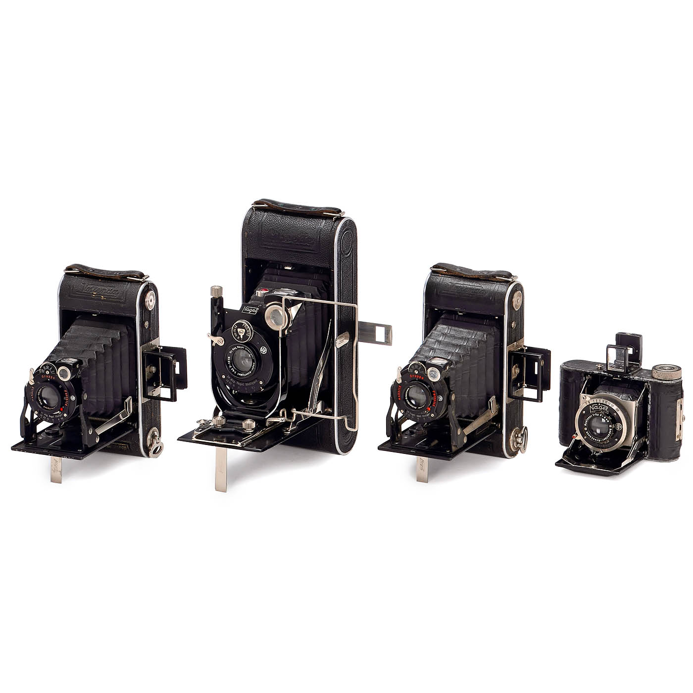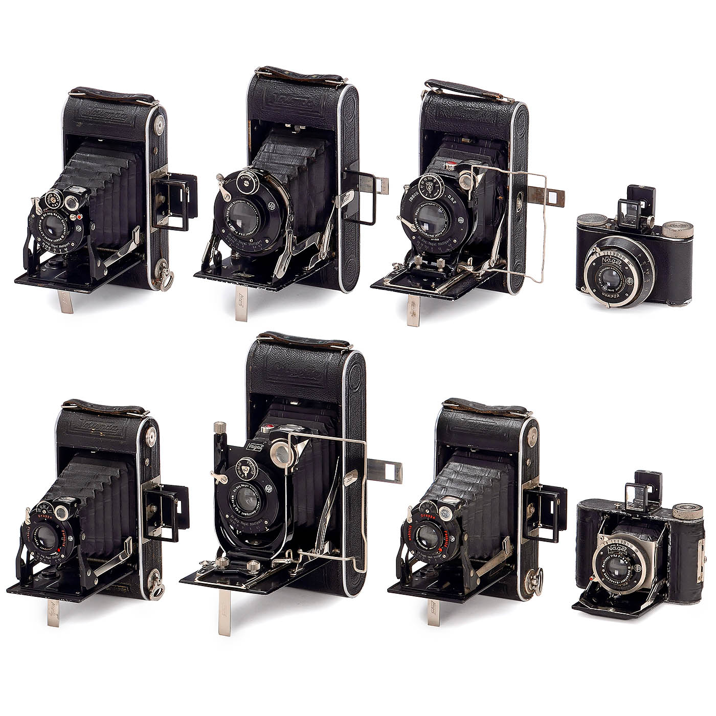 Nagel Camerawerk, Stuttgart. 1) Pupille, for 3 x 4 cm, Xenar 3.5/5 cm, Compur weak for long times. (3-/3) – 2–4) Vollenda 68 in 3 different versions with Radionar 6.3/10.5 cm or Nagel-Anast. 6.3/10.5 cm. (3/3) – 5) Nagel 74, export version, feet scale, Nagel Anastigmat 4.5/10.5 cm. (2-/3+) – 6) Librette 79, Nagel-Anastigmat 6.3/12 cm. (2-/3) – 7) Vollenda 70/0, one spread with damage. (3/3-) – And: 8) Vollenda 3 x 4 cm, Radionar 3.5/5 cm, Compur is running. (4/3+)