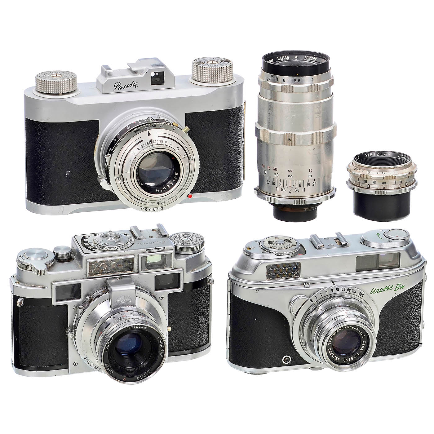 1) Dr. Rodehüser, Heesen & Bergkamen. Panta 6 x 6 cm no. 4488, Steiner 3.5/75 mm in Pronto, working. (2–3/2) – 2) Leidorf, Wetzlar. Lordomat C 35, no. 70440, c. 1956, shutter working, interchangeable lens Lordonar 2.8/50 mm. (3-/2-) – 3) Lordomat lenses Lordonar 3.5/35 mm and Travenar 4/135 mm. (3–4/3) – And: 4) Apparate & Kamerabau GmbH, Friedrichshafen. Arette BW, shutter and exposure meter working, Xenar 2.8/50 mm, tiny dent on the front, otherwise very well preserved. Beautifully designed kidney-shaped table from the 1950s. (2-/2-)