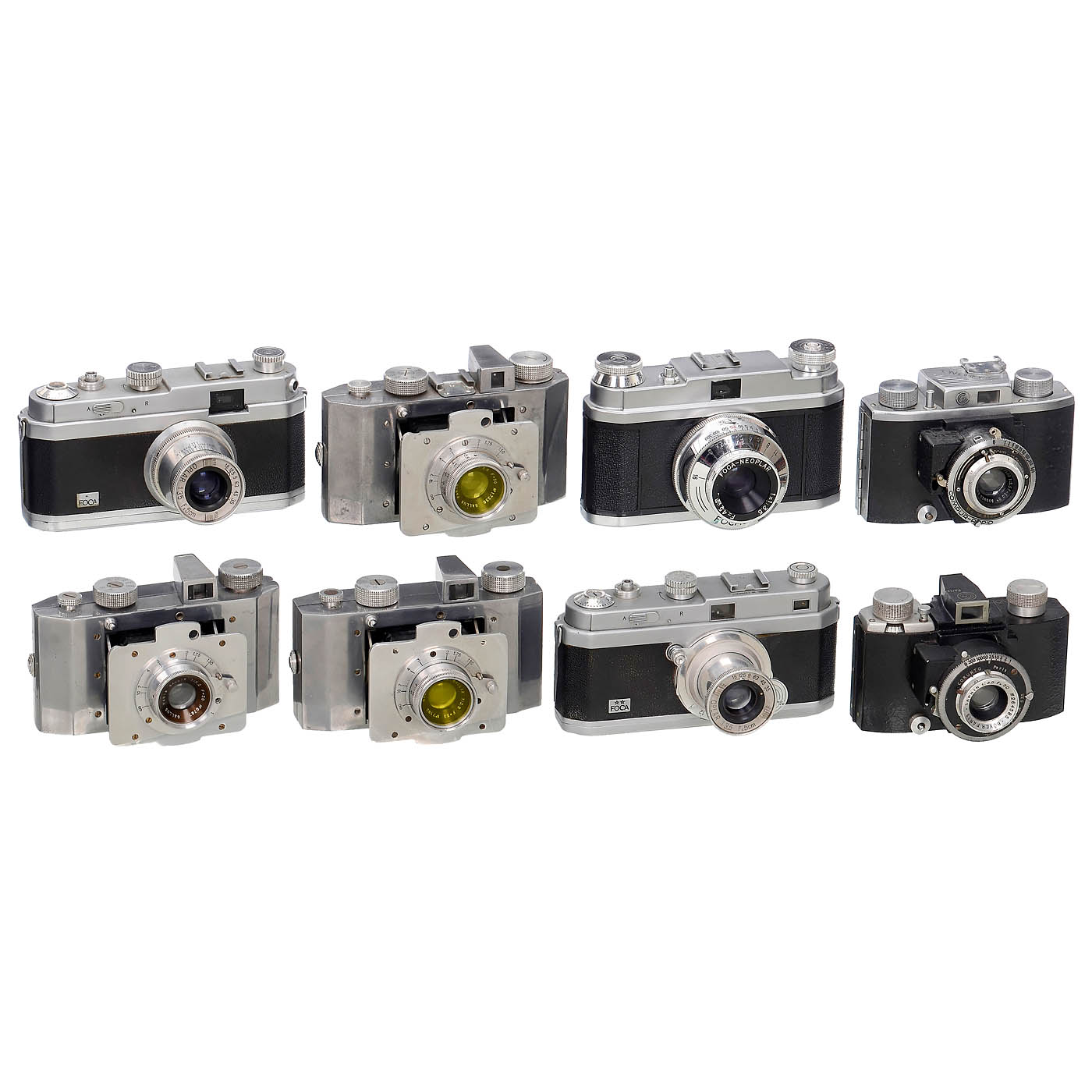 France. 1) OPL Foca. Foca Sport I Mod. I, no. 013.811S, very good condition. (2/2) – 2–3) Foca PF1 Mod. 3 with very early no. 65377, viewfinder front reduced version, Oplar 3.5/5 cm, and Foca PF2B Mod. 1 no. 25.491 B. (3/–) – 4) Cornu, France. Ontobloc with Boyer Saphir 3.5/50 mm. (3-/3-) – 5) Ontobloc II with Berthiot Flor 3.5/50 mm. (3/3) – And: 6–8) Gallus. Derlux for 3 x 4 cm on 127 film, 3 different models. (3/–)