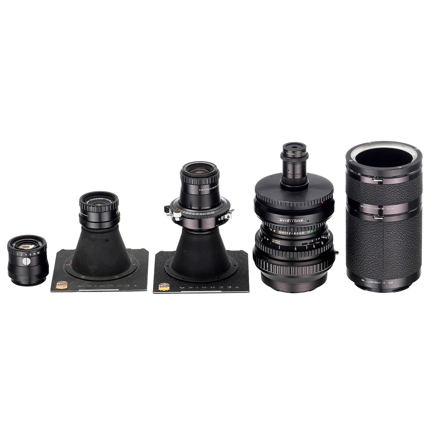 All lenses are clean under point light. 1) Hasselblad C Synchro-Compur black, for microscopy, working, with Luminar adapter and Zeiss Winkel Luminar 2.5/16 mm, with a Hasselblad-Canon EOS adapter on the back. (2-/2-) – 2) Linhof, Munich. 2 lens boards with microscope attachment for Master Technika 4 x 5 in, Copal No. 0, working, with thread-matched three-piece Linhof-Schneider set M-Componon 4/28 mm, 4/40 mm, and 4/80 mm. (3/2-) – And: 3) Rollei SL66 extension tubes, 38 mm and 78 mm, and a Rollei SL66 tube adapter for screw-on rings. (3/3)