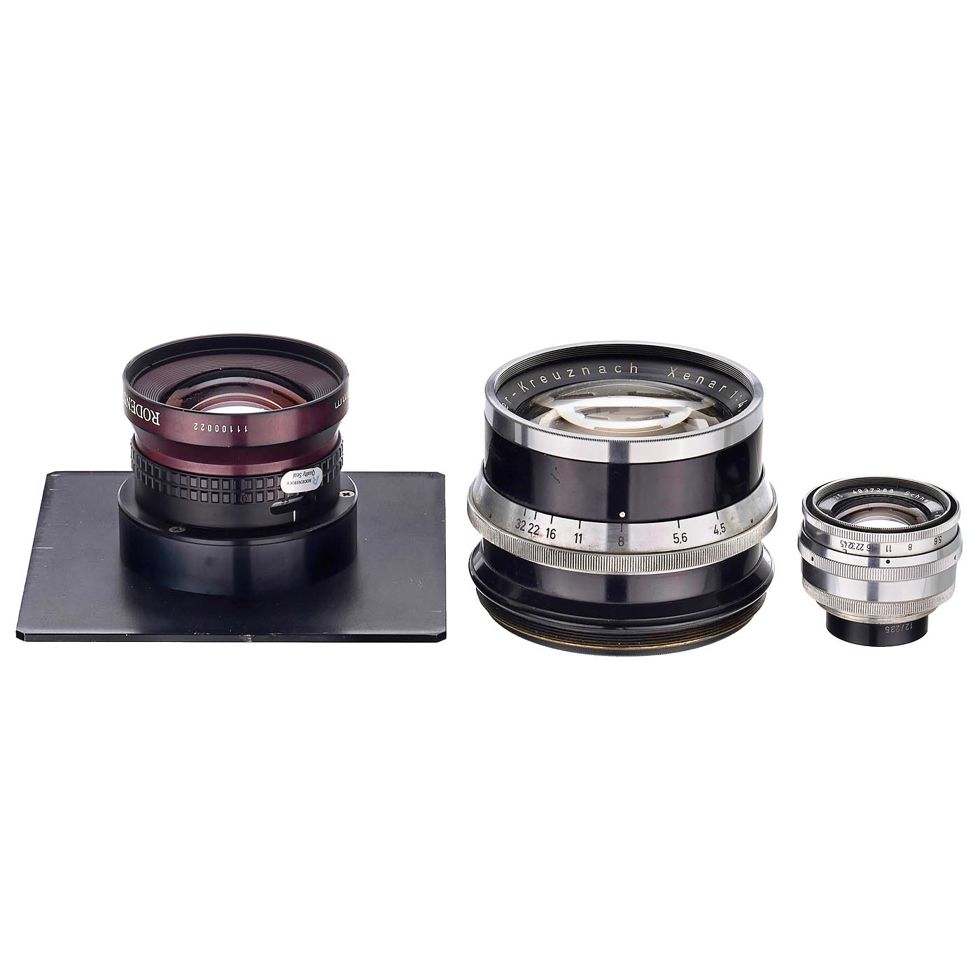 Rodenstock, Munich. All in standard mounts and with iris diaphragm. All clear under point light. 1) Rodagon 5.6/210 mm, mounted on a 13 x 13 cm board. (2/2) – 2) Rodagon 5.6/300 mm, mounted on a 13 x 13 cm board. (2/2) – 3) Rodagon 6.3/360 mm, mounted on a 13 x 13 cm board. (2/2) – 4) Trinar 4.5/105 mm, M39. (3/3) – 5) Schneider, Kreuznach. Xenar 4.5/30 cm, glass good to clear under point light. (3/3) – And: 6) Symmar 5.6/135 mm, with age-related deposits on the inside. (3/–)