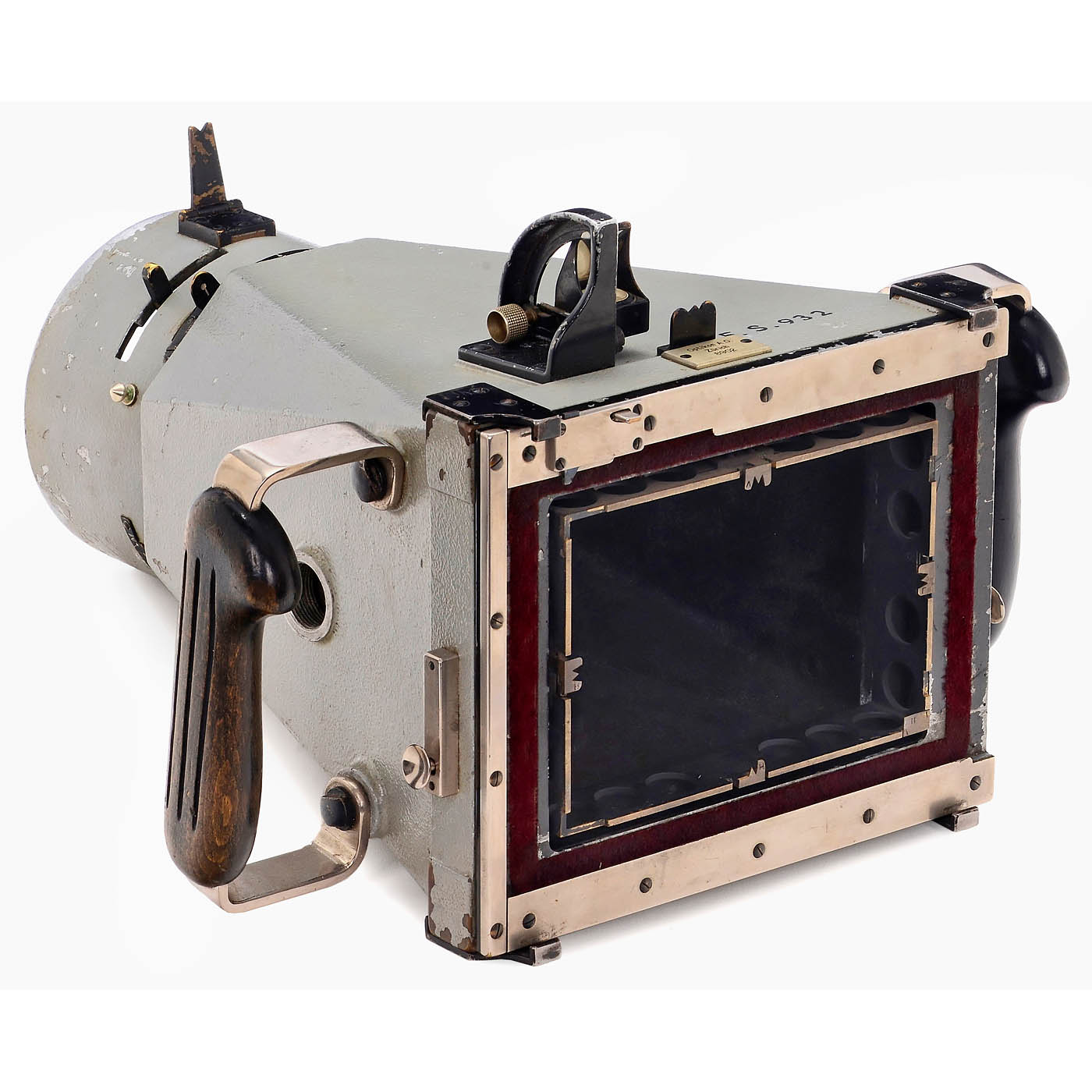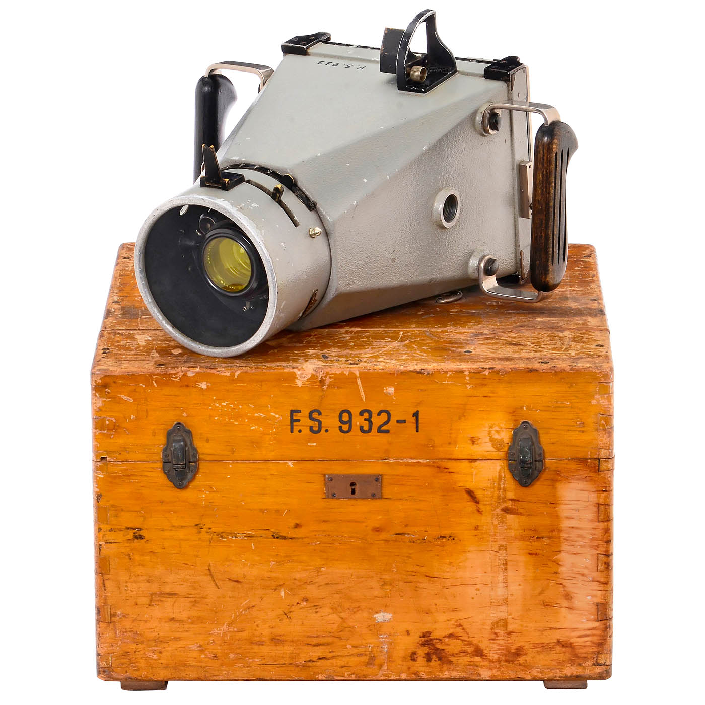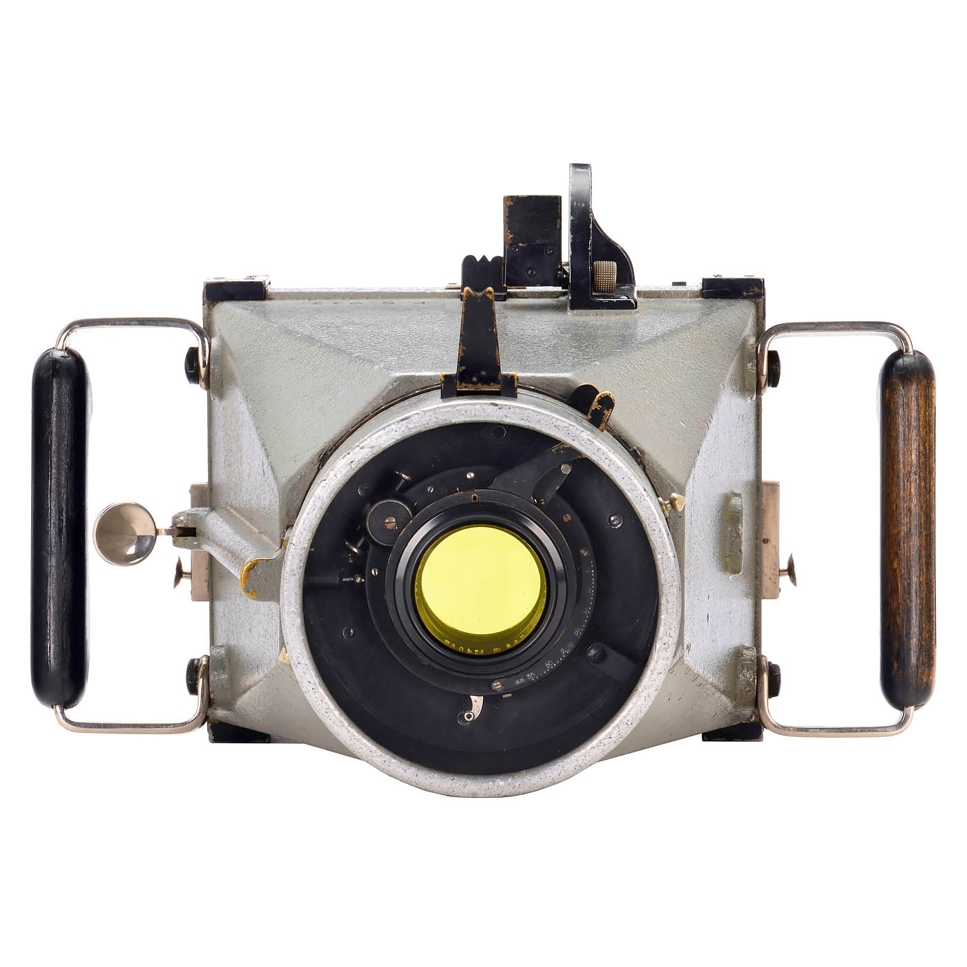 Gustav Heyde GmbH, Dresden – Aerotopograph GmbH, Dresden, for Optikon AG, Zurich. Robust photogrammetric camera no. 8902 based on an aerial camera, for 13 x 18 cm plates, exceptional lens by Carl Zeiss Jena with the Double Protar 6.3/26 cm consisting of Protarlinse 480 mm no. 317585 and Protarlinse 480 mm no. 317xxx with yellow filter in a special mount, glass clean under point light, compound shutter is open and non-functional, the camera has the usual Protar aperture scale in millimeters. After inserting a cassette into the back and removing the slide, pressing the side locking levers causes the entire inner measuring mark frame block (inner format 115 x 166 mm) to spring against the photographic plate (for photogrammetry, there were negative plates with optically flat surfaces). The reseau-markings are centrally positioned, each perforated with R (right), L (left), V (front), and H (back). Shutter release (non-functional) is achieved by operating a lever on the right handgrip. Includes focusing screen back. – Note: The Double Protar was the only lens that, thanks to its mere four glass-air surfaces, was free of stray light and virtually distortion-free for this angle of view, even under the most challenging lighting conditions in the changing light of high mountains. The camera was intended for alpine expeditions; the mounting points for elevation suspension are located on the side of the camera, their angles had to be noted manually. Includes transport case. This is the only known measuring camera with the Double Protar lens.